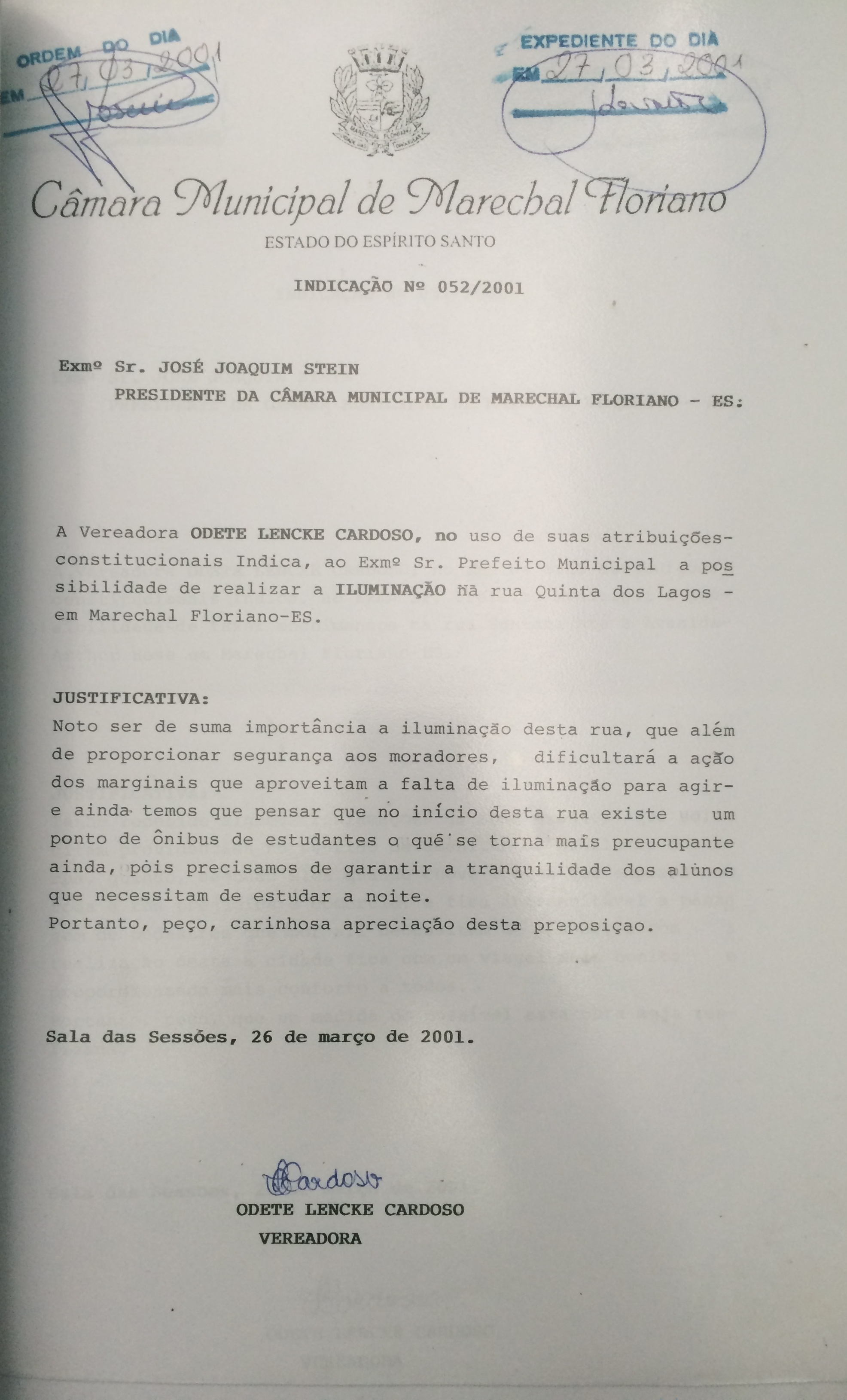 Ementa: INDICA A POSSIBILIDADE DE REALIZAR A ILUMINAÇÃO NA RUA QUINTA DOS LAGOS - EM MARECHAL FLORIANO-ES.