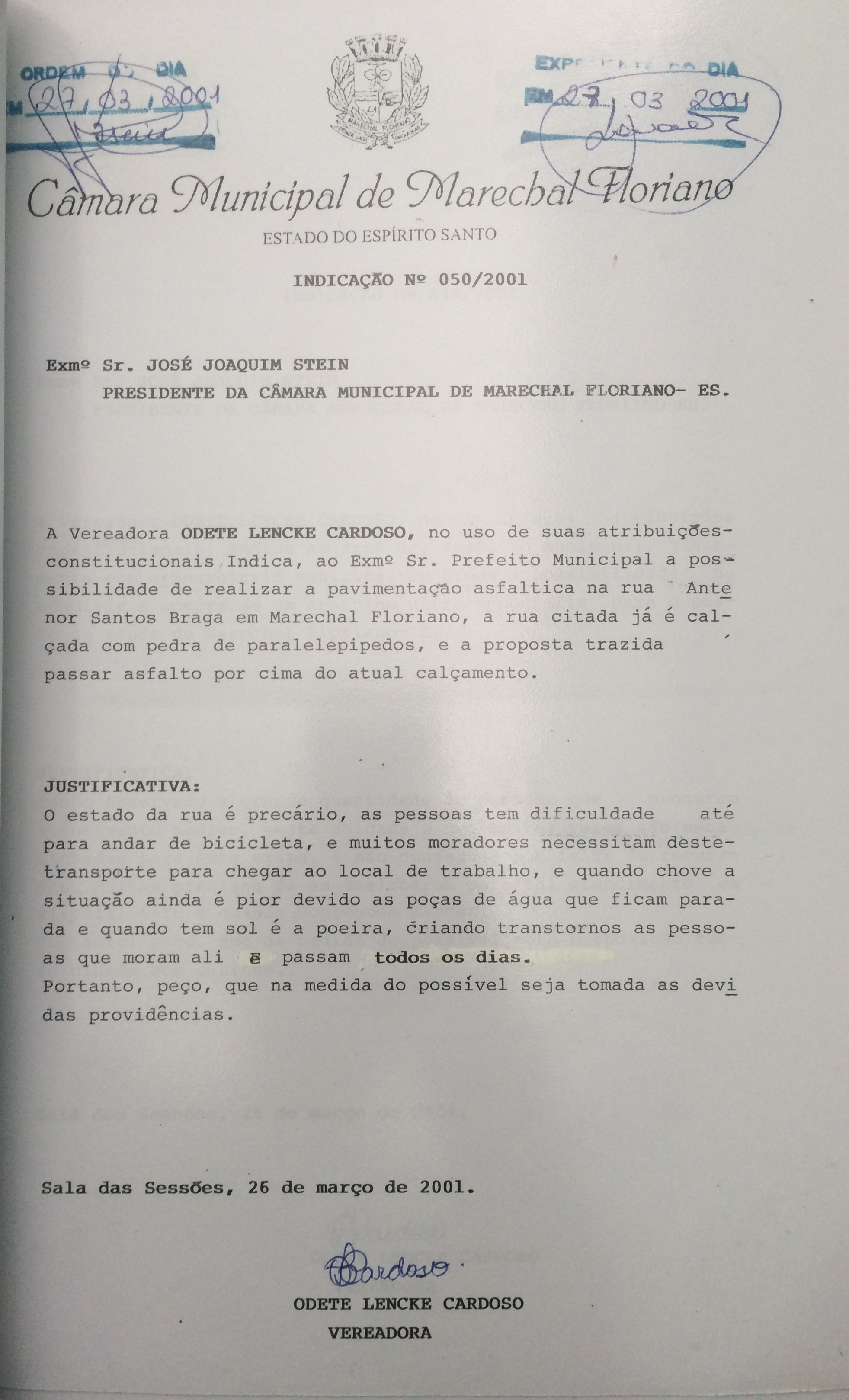 Ementa: INDICA A POSSIBILIDADE DE REALIZAR A PAVIMENTAÇÃO ASFÁLTICA NA RUA ANTENOR SANTOS BRAGA EM MARECHAL FLORIANO, A RUA CITADA JÁ É CALÇADA COM PEDRA DE PARALELEPÍPEDOS, E A PROPOSTA TRAZIDA PASSAR O ASFALTO POR CIMA DO ATUAL CALÇAMENTO.