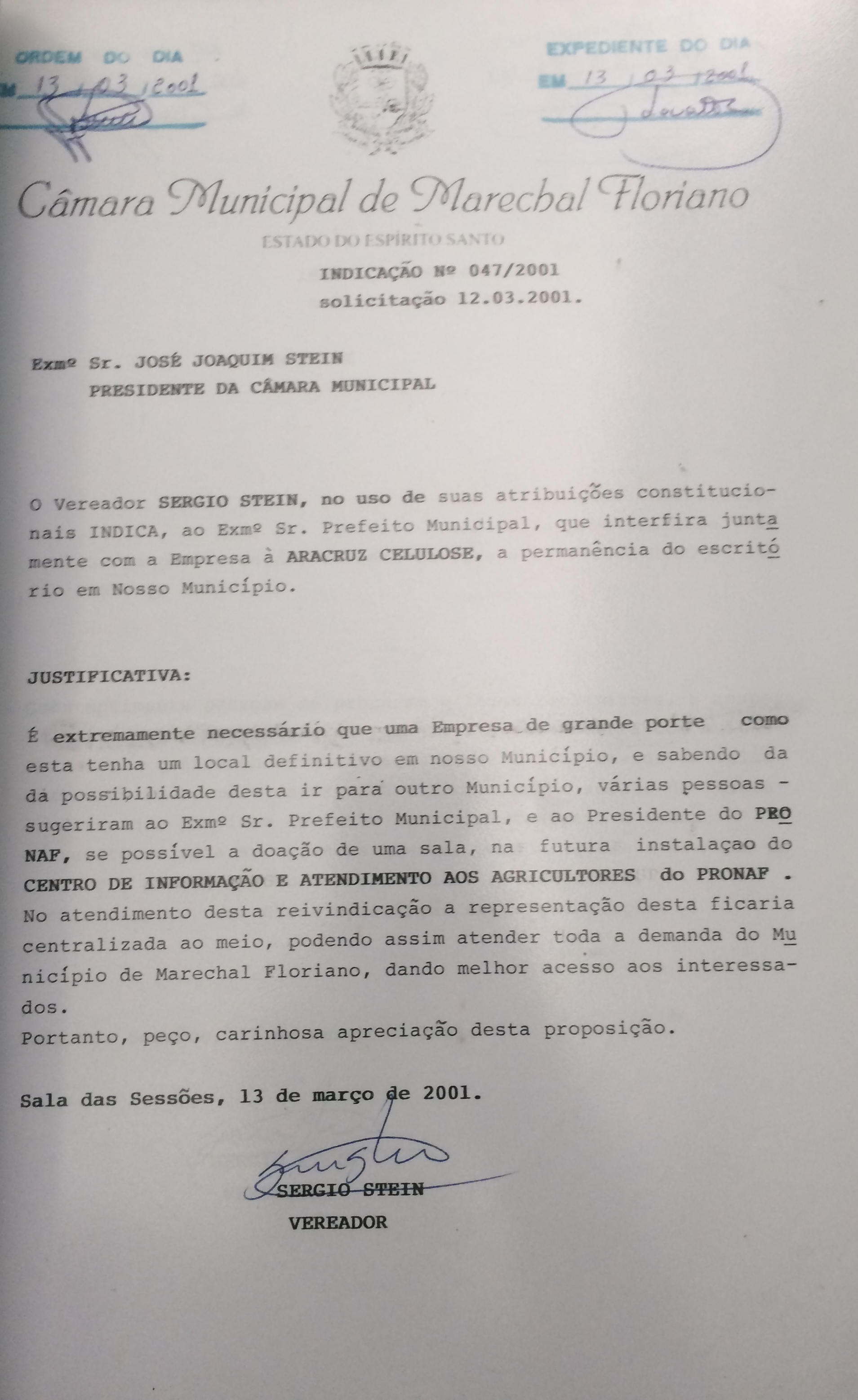 Ementa: INDICA QUE INTERFIRA JUNTAMENTE COM A EMPRESA À ARACRUZ CELULOSE, A PERMANÊNCIA DO ESCRITÓRIO EM NOSSO MUNICÍPIO.