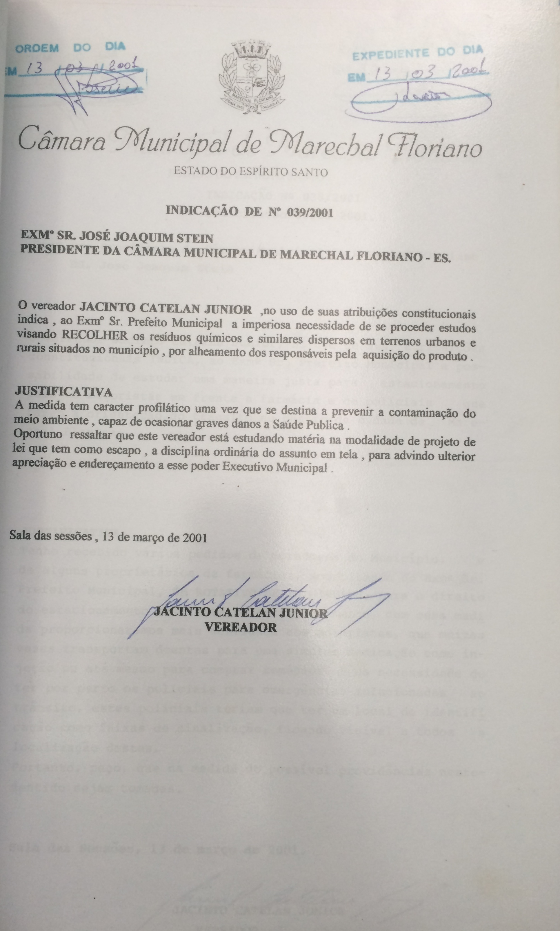 Ementa: INDICA A NECESSIDADE DE SE PROCEDER ESTUDOS VISANDO RECOLHER OS RESÍDUOS QUÍMICOS E SIMILARES DISPERSOS EM TERRENOS URBANOS E RURAIS SITUADOS NO MUNICÍPIO, POR ALHEAMENTO DOS RESPONSÁVEIS PELA AQUISIÇÃO DO PRODUTO.