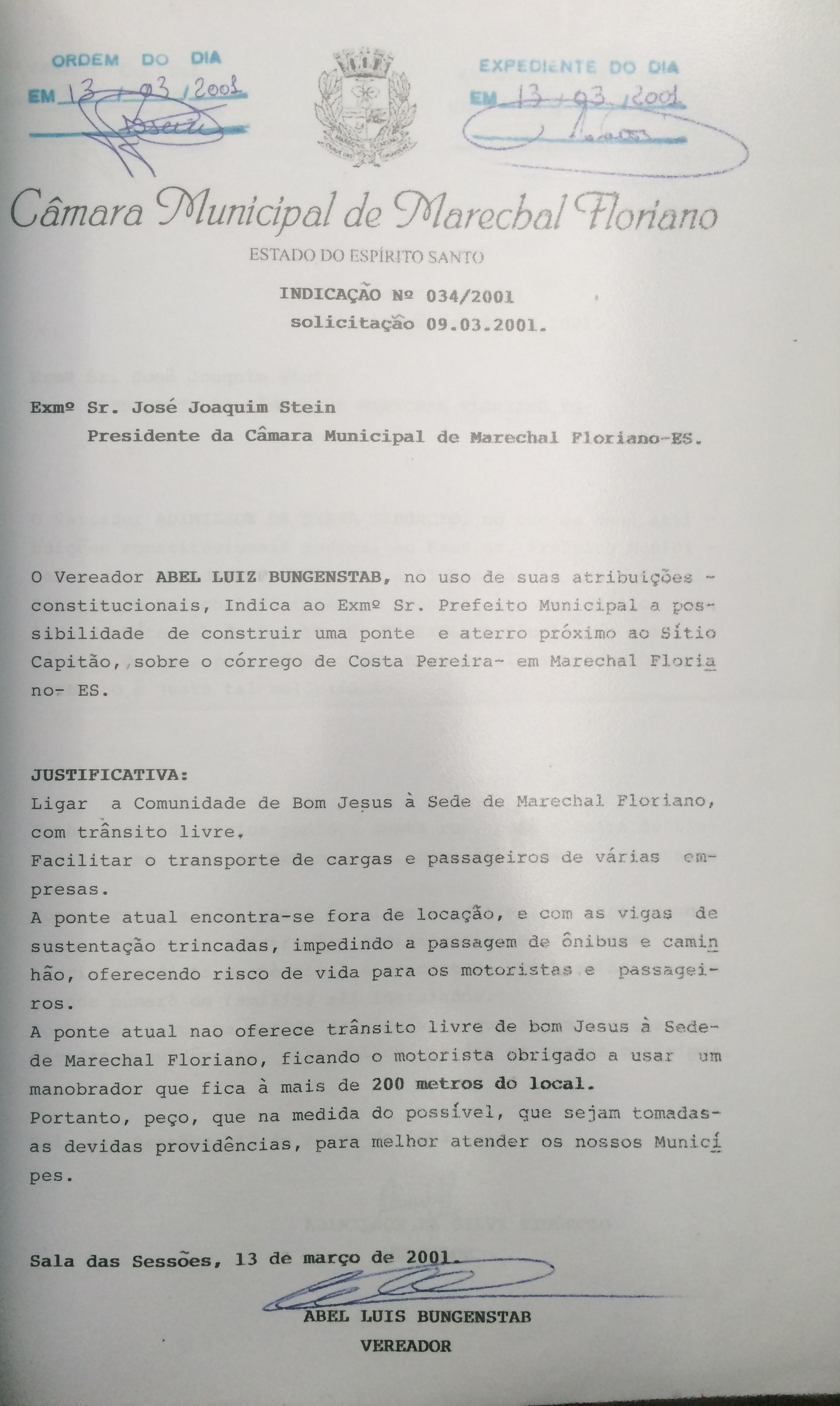 Ementa: INDICA A POSSIBILIDADE DE CONSTRUIR UMA PONTE E ATERRO PRÓXIMO AO SÍTIO CAPITÃO, SOBRE CÓRREGO DE COSTA PEREIRA - EM MARECHAL FLORIANO -ES.