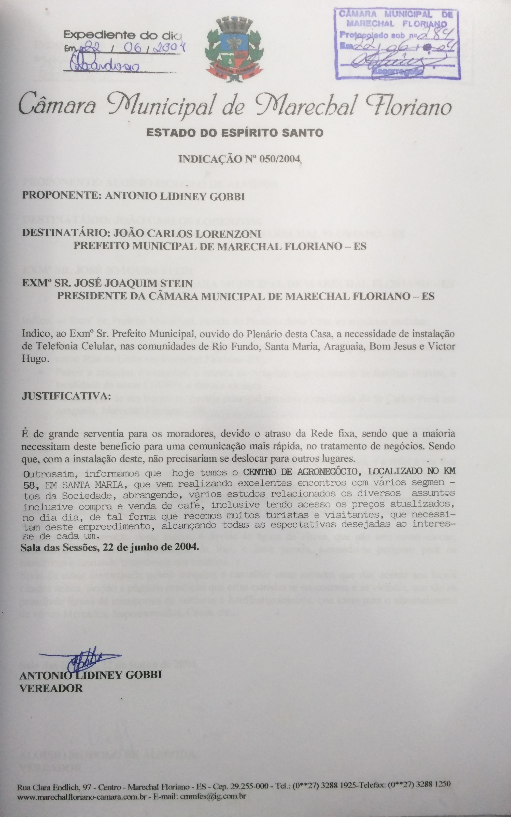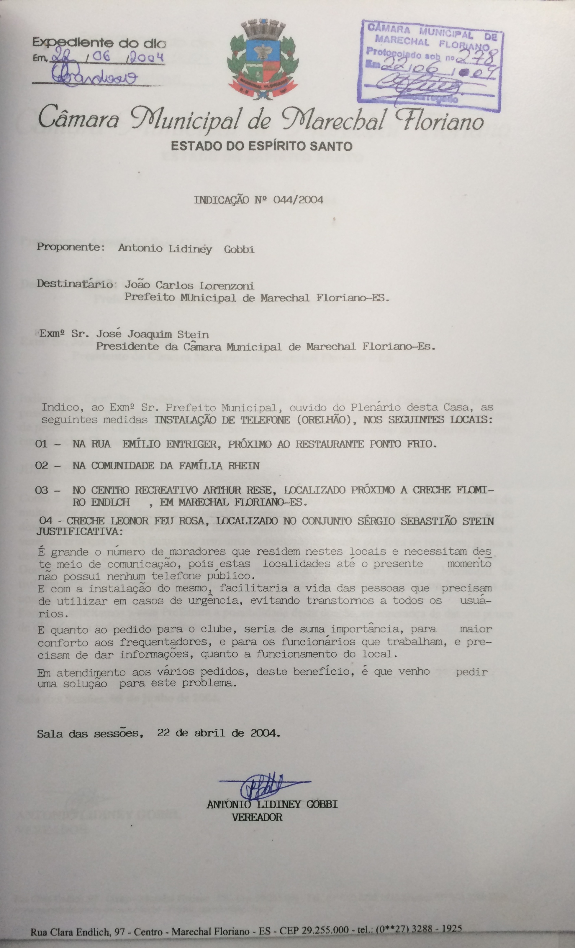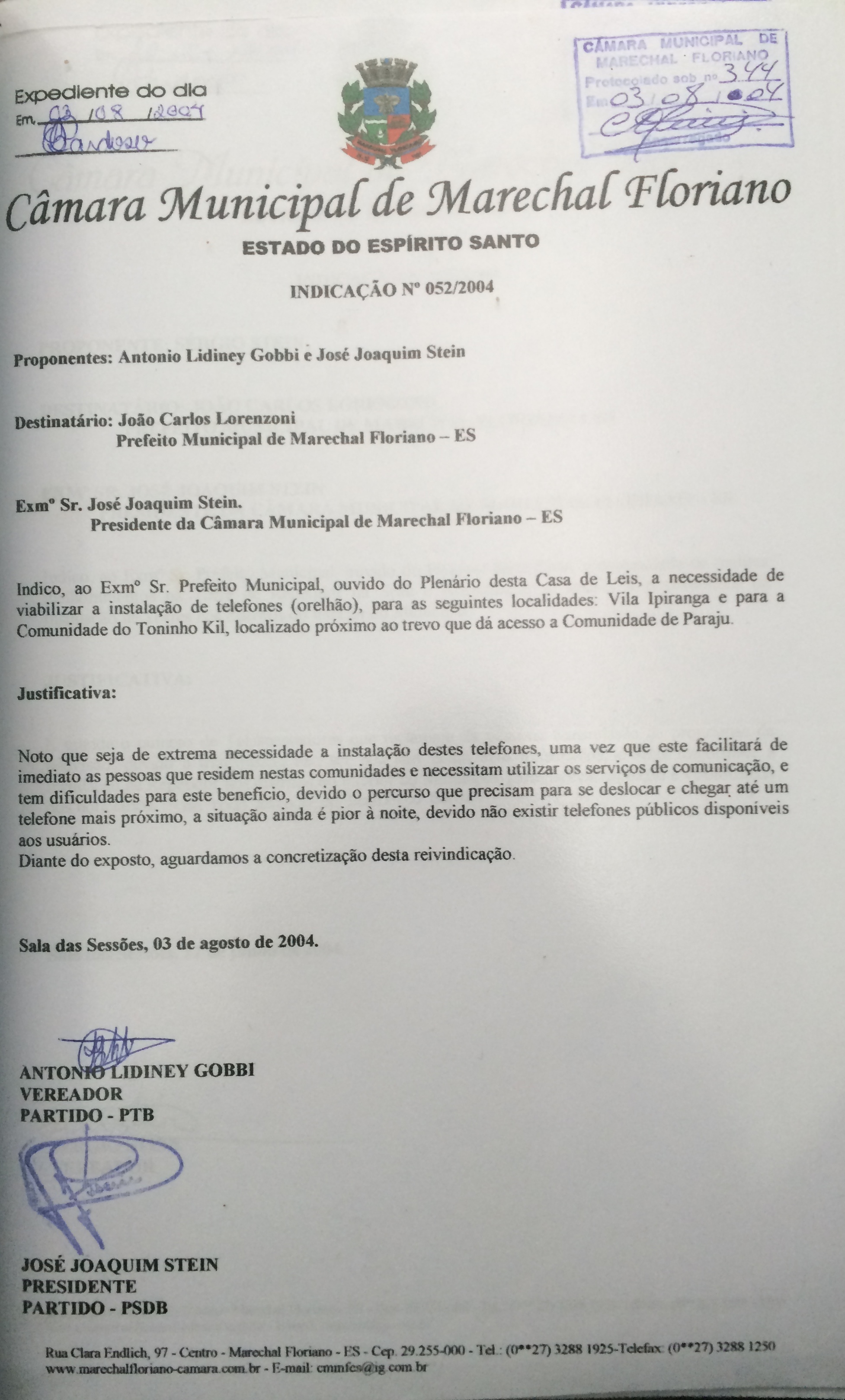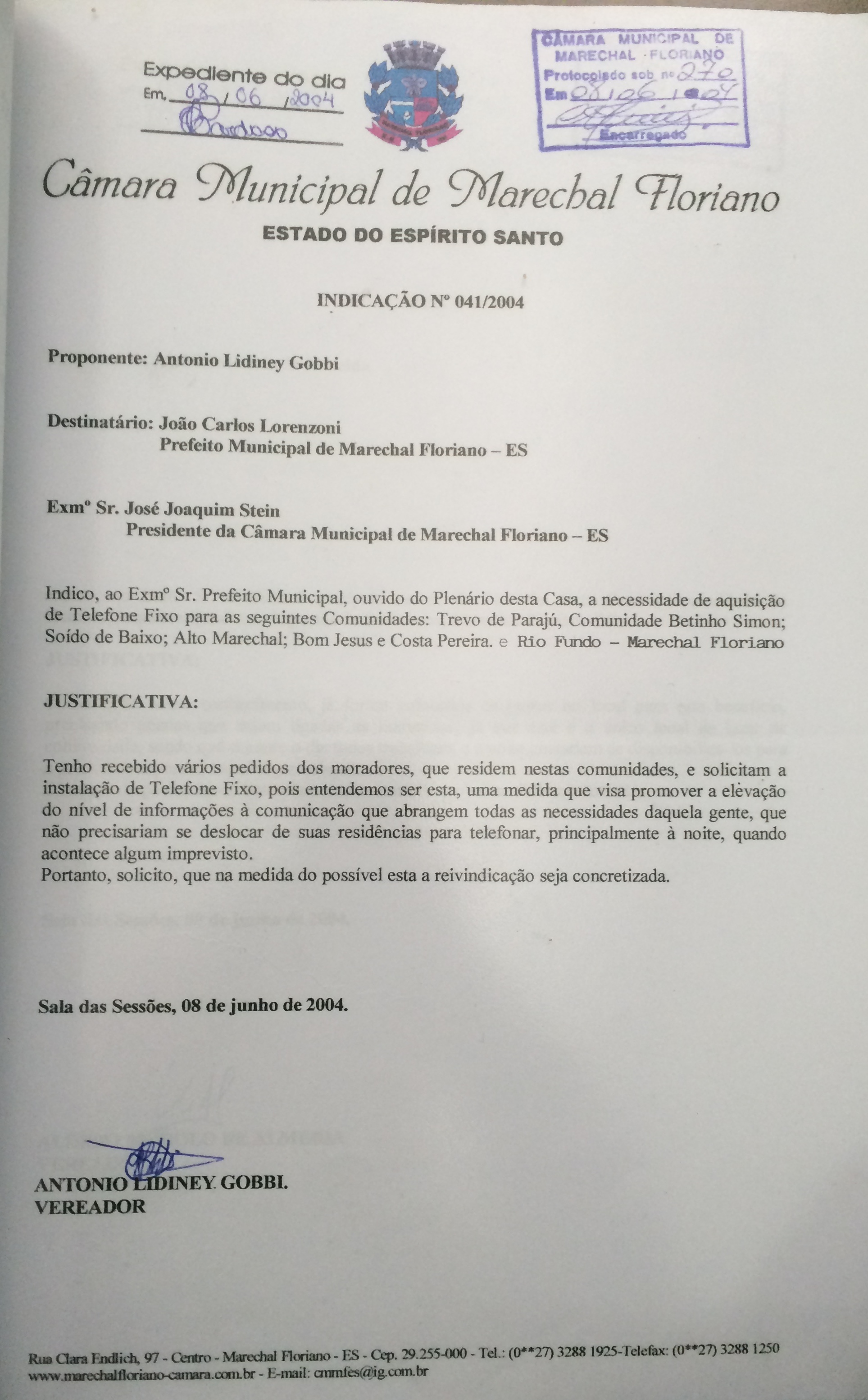 Ementa: INDICA A NECESSIDADE DE AQUISIÇÃO DE TELEFONE FIXO PARA AS SEGUINTES COMUNIDADES: TREVO DE PARAJU, COMUNIDADE BETINHO SIMON; SOÍDO DE BAIXO; ALTO MARECHAL; BOM JESUS E COSTA PEREIRA E RIO FUNDO - MARECHAL FLORIANO.