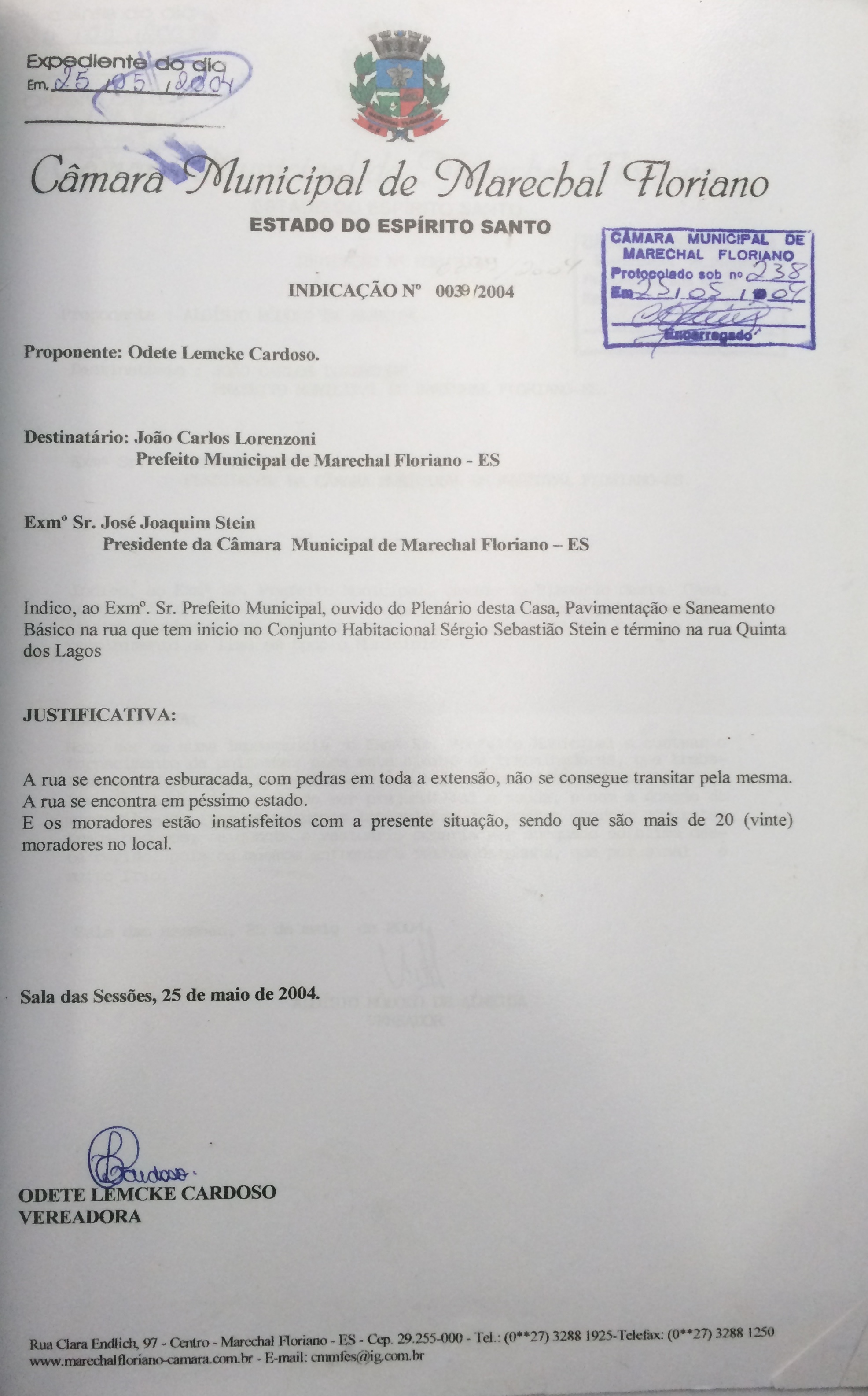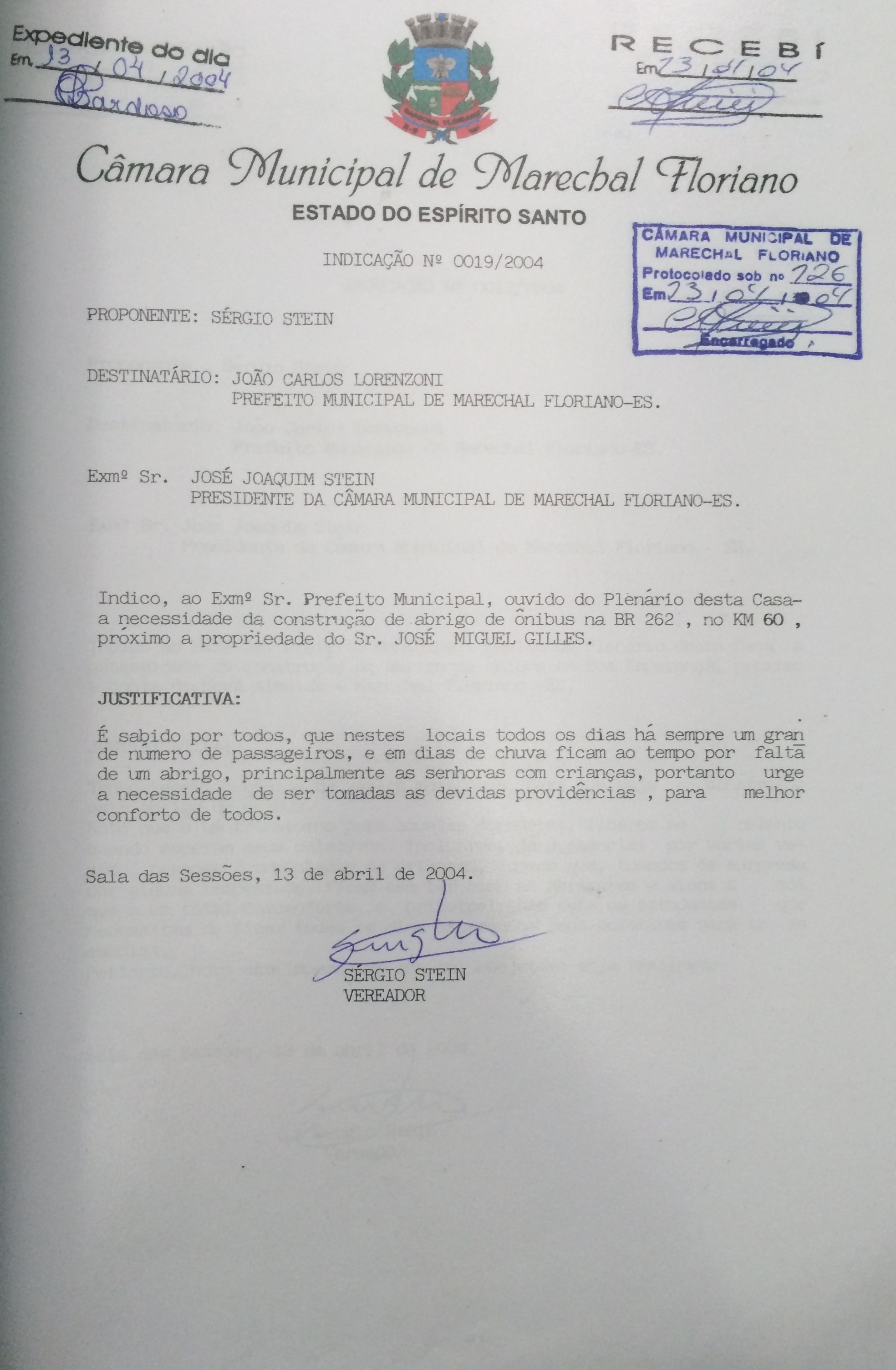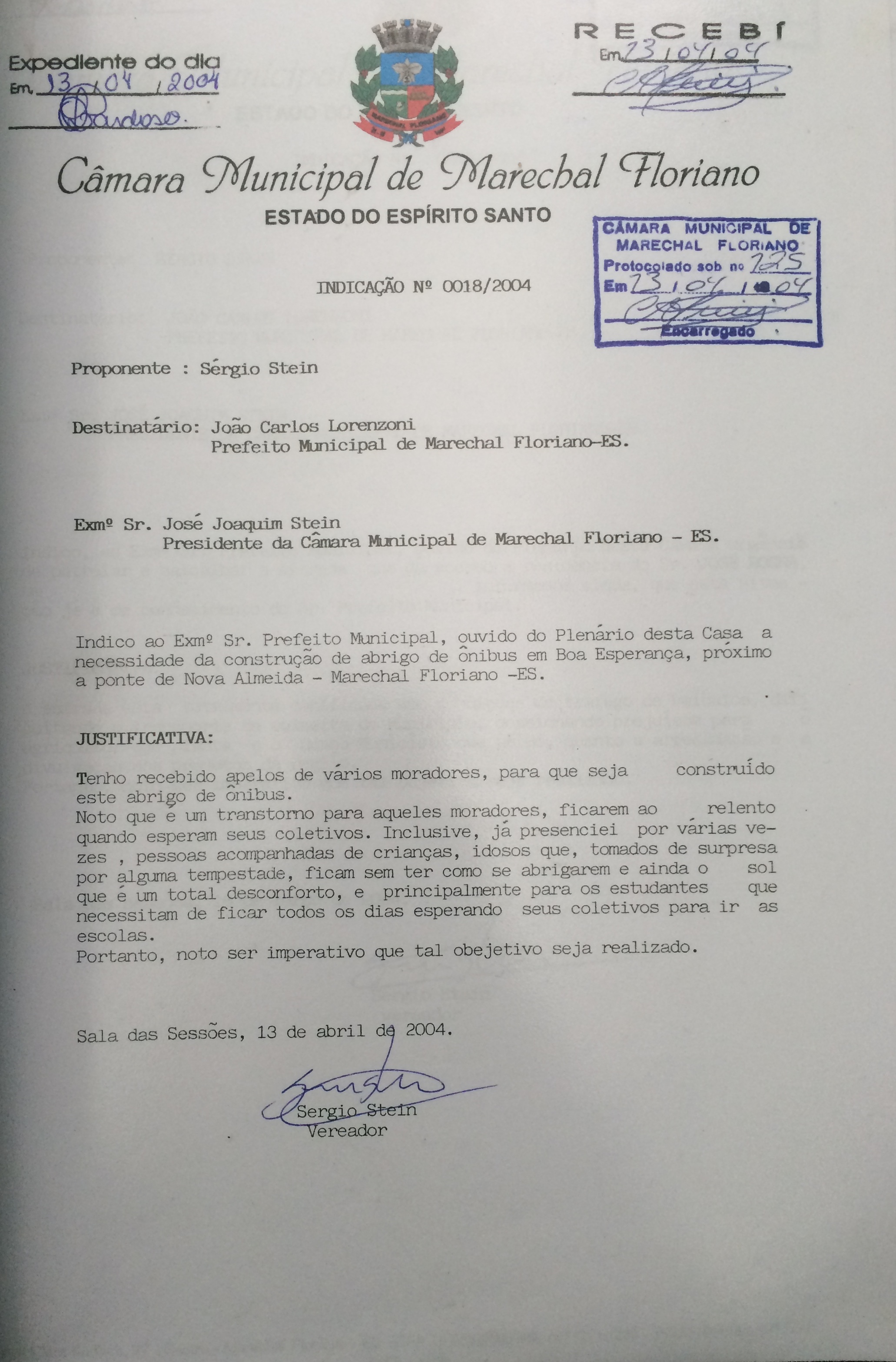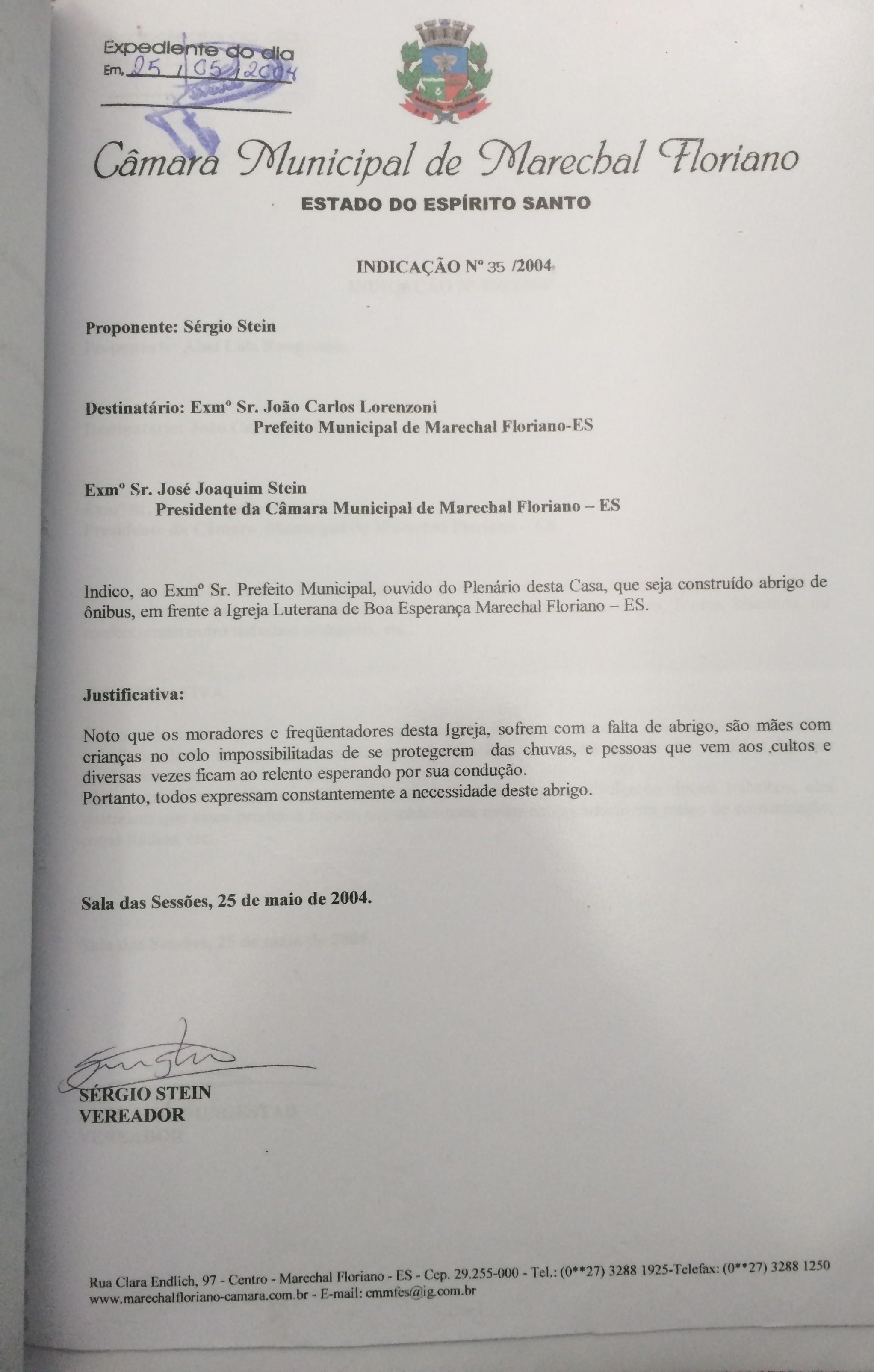 Ementa: INDICA QUE SEJA CONSTRUÍDO ABRIGO DE ÔNIBUS, EM FRENTE A IGREJA LUTERANA DE BOA ESPERANÇA MARECHAL FLORIANO-ES.