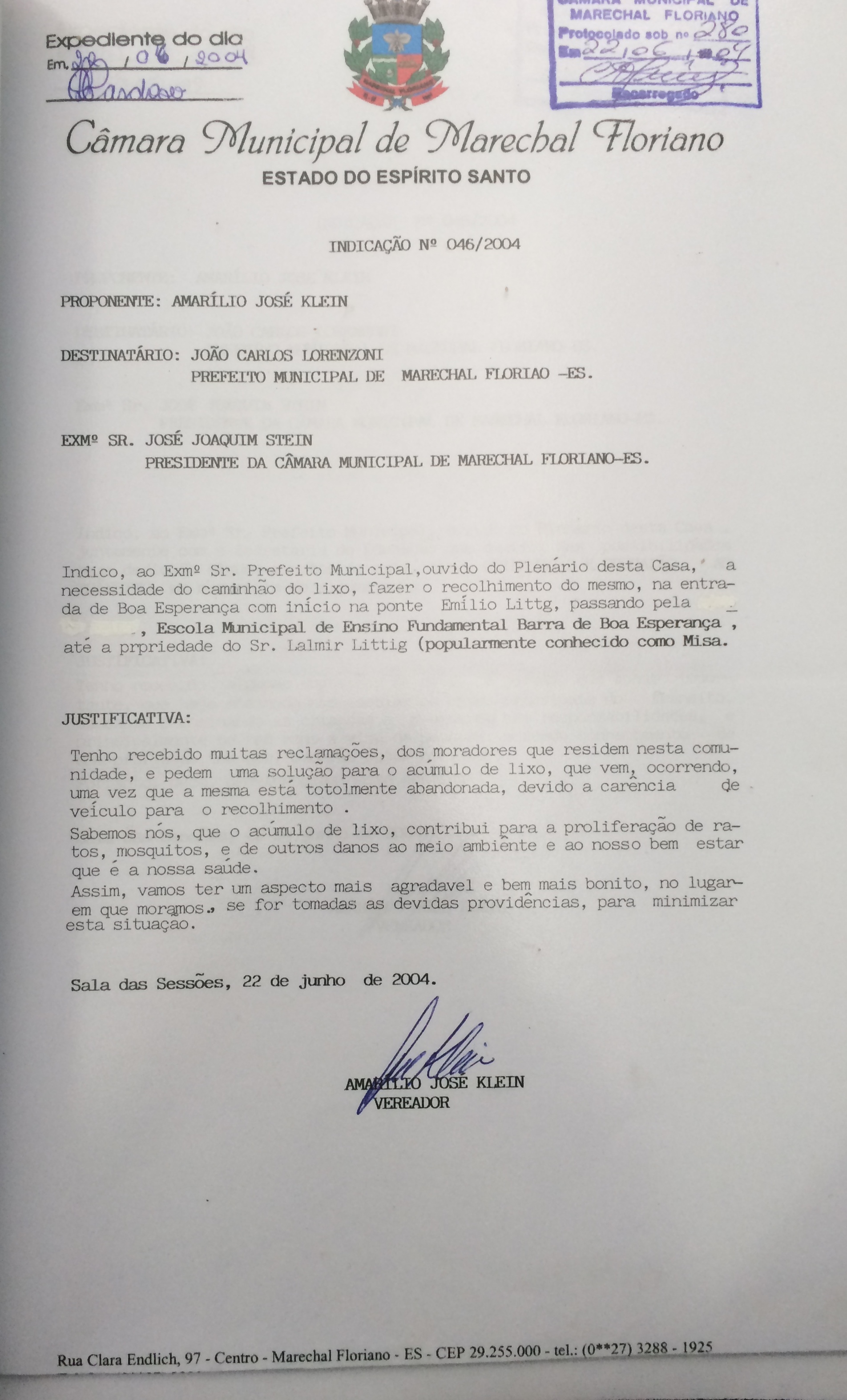 Ementa: INDICA A NECESSIDADE DO CAMINHÃO DO LIXO, FAZER O RECOLHIMENTO DO MESMO, NA ENTRADA DE BOA ESPERANÇA COM INICIO NA PONTE EMILIO LITTIG, PASSANDO PELA ESCOLA MUNICÍPIO DE ENSINO FUNDAMENTAL BARRA DE BOA ESPERANÇA, ATÉ A PROPRIEDADE DO SR. LALMIR LITTIG .