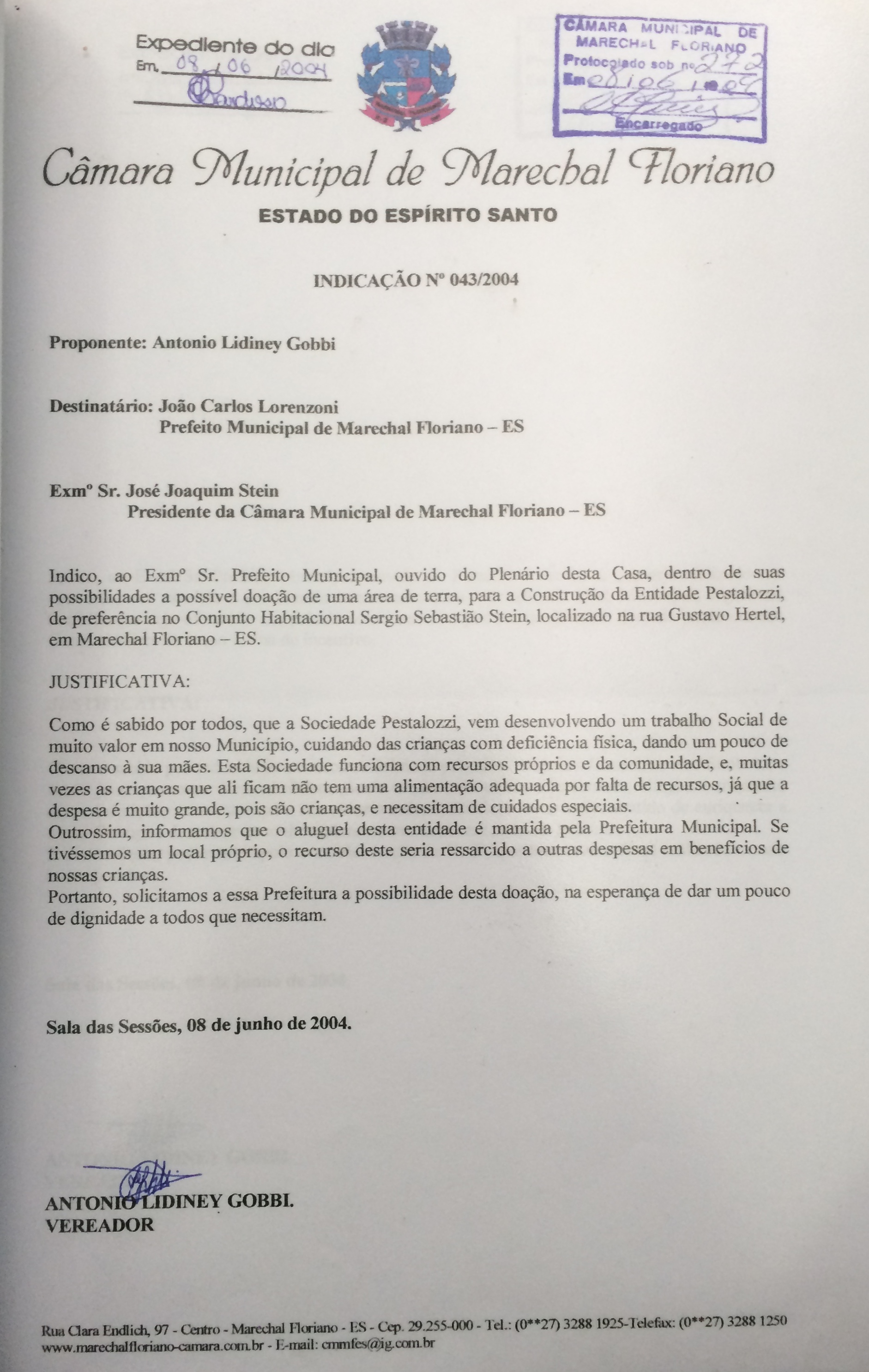 Ementa: INDICA QUE DENTRO DAS POSSIBILIDADES A POSSÍVEL DOAÇÃO DE UMA ÁREA DE TERRA, PARA A CONSTRUÇÃO DA ENTIDADE PESTALOZZI, DE PREFERÊNCIA NO CONJUNTO HABITACIONAL SERGIO SEBASTIÃO STEIN, LOCALIZADO NA RUA GUSTAVO HERTEL.