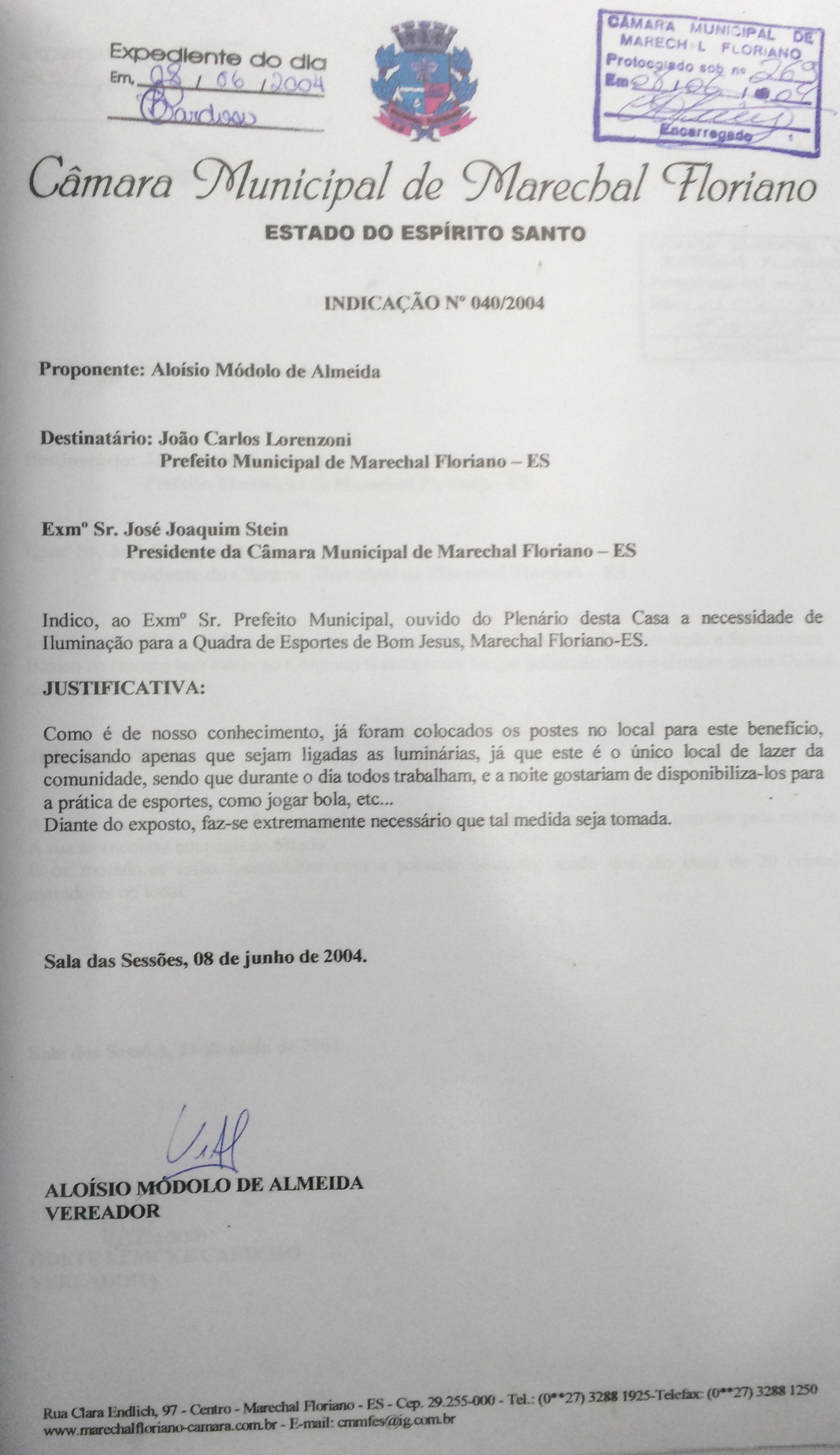 Ementa: INDICA A NECESSIDADE DE ILUMINAÇÃO PARA A QUADRA DE ESPORTES DE BOM JESUS, MARECHAL FLORIANO-ES.