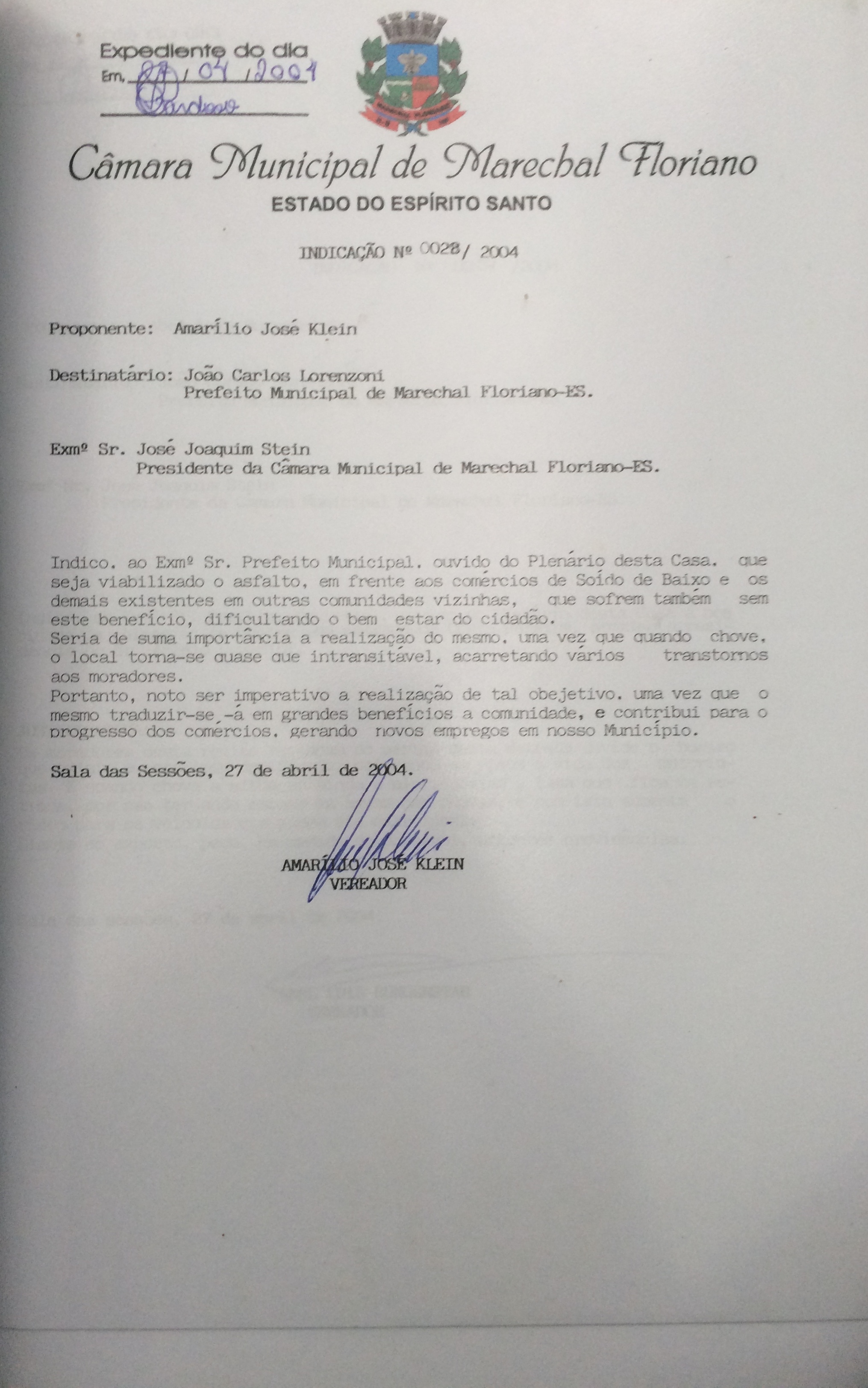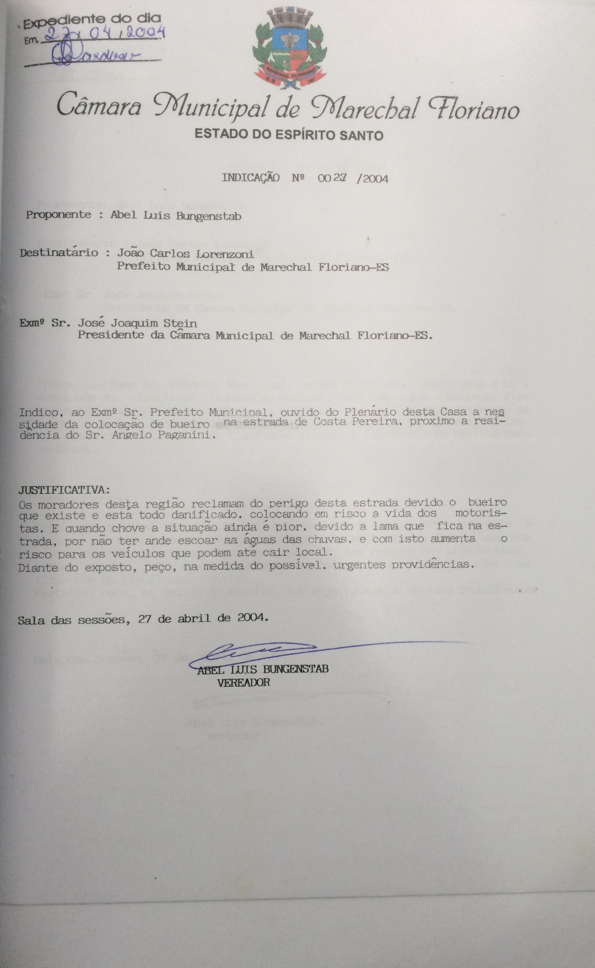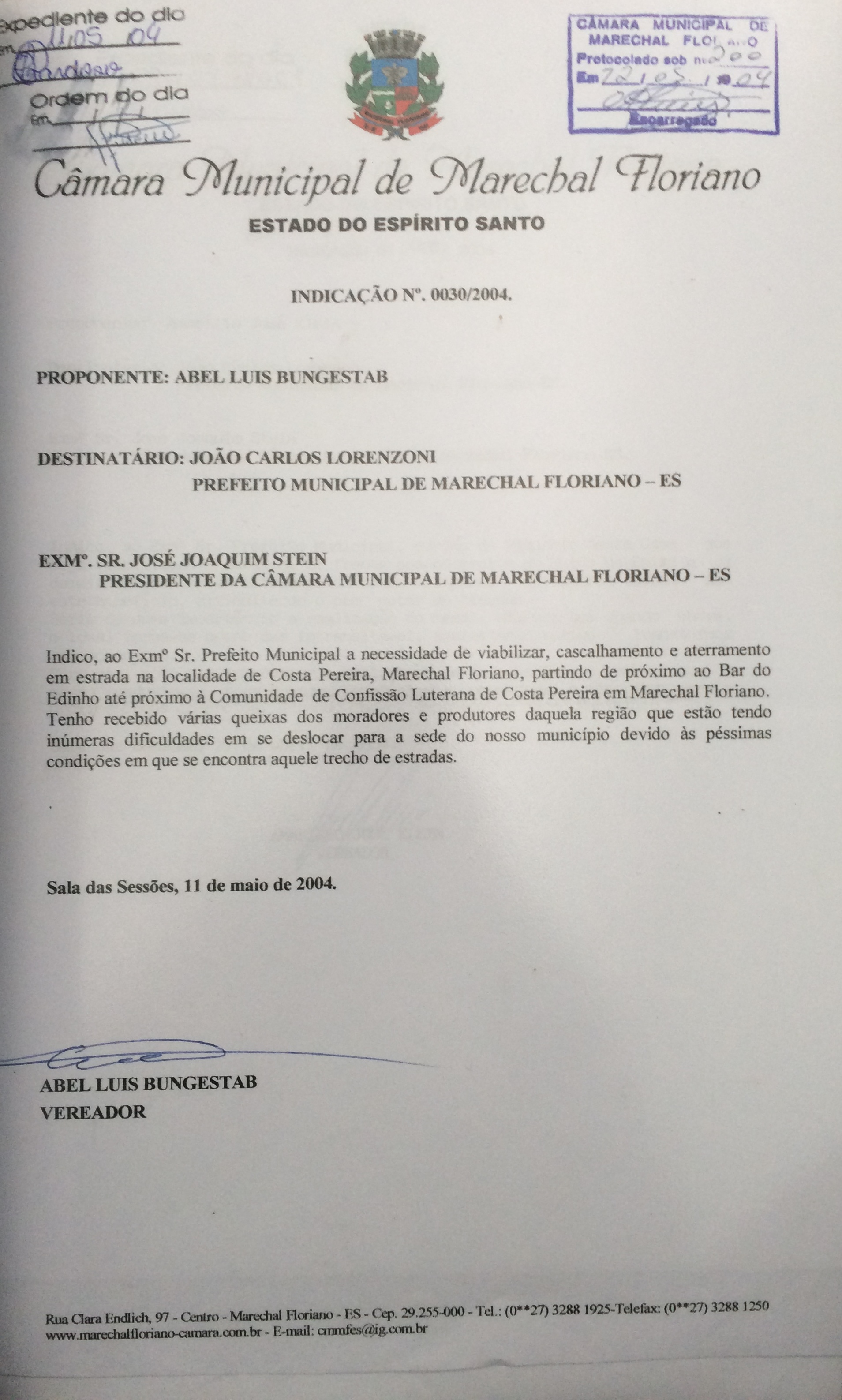 Ementa: INDICA A NECESSIDADE DE VIABILIZAR, CASCALHAMENTO E ATERRAMENTO EM ESTRADA NA LOCALIDADE DE COSTA PEREIRA, MARECHAL FLORIANO, PARTINDO DE PRÓXIMO AO BAR DO EDINHO ATÉ PRÓXIMO Á COMUNIDADE DE CONFISSÃO LUTERANA DE COSTA PEREIRA, EM MARECHAL FLORIANO.