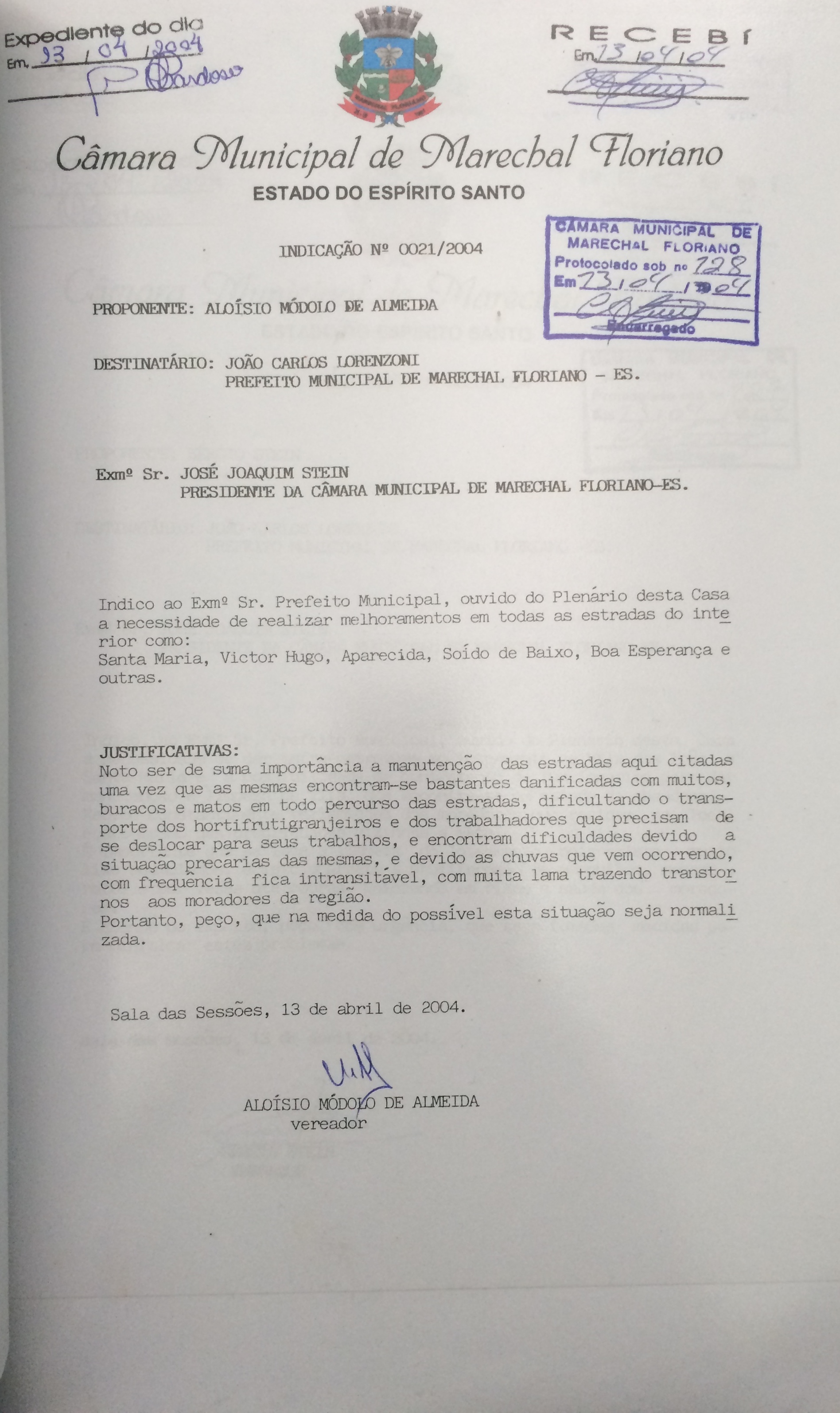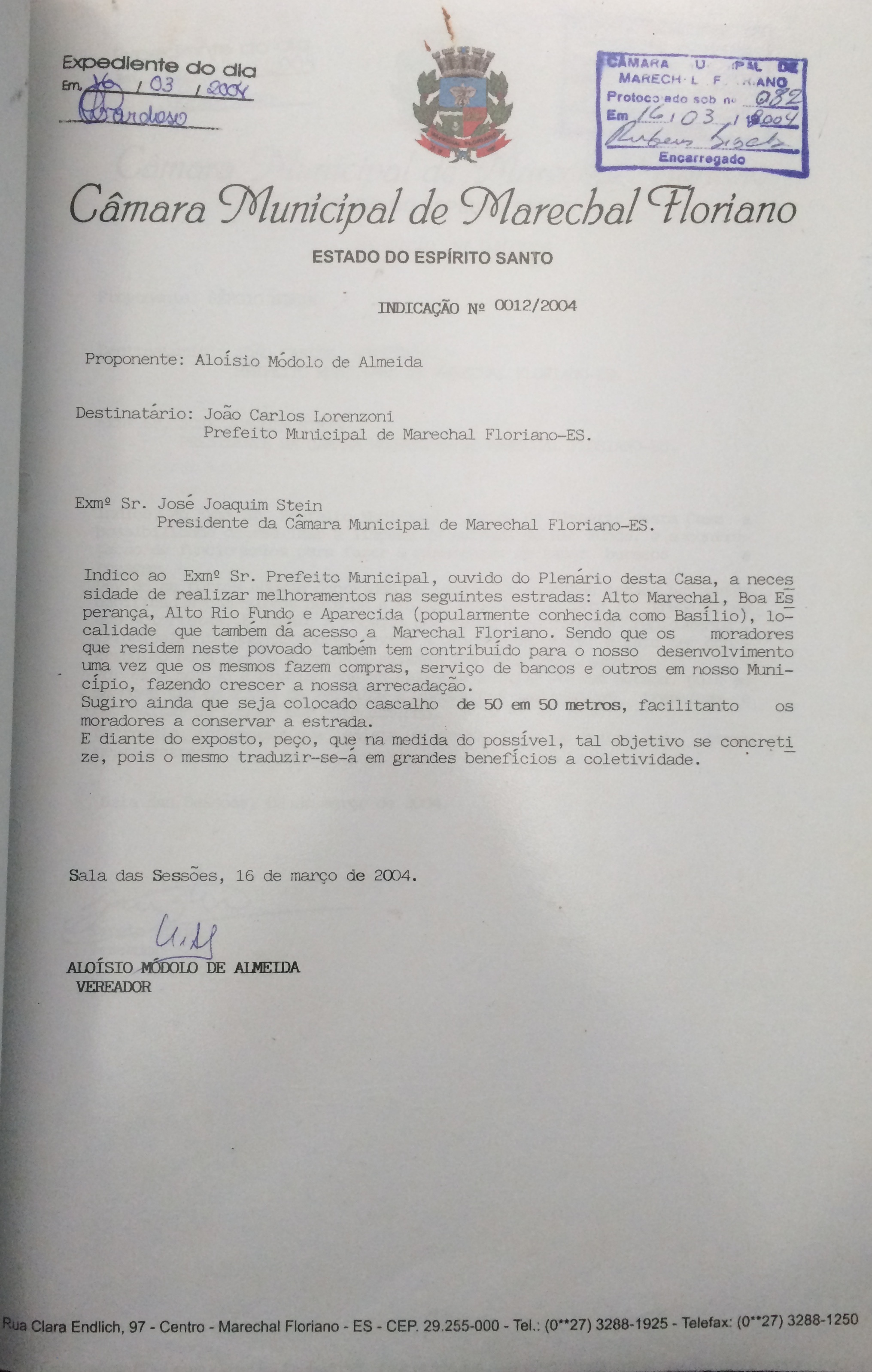 Ementa: INDICA A NECESSIDADE DE REALIZAR MELHORAMENTOS NAS SEGUINTES ESTRADAS: ALTO MARECHAL, BOA ESPERANÇA, ALTO RIO FUNDO E APARECIDA, LOCALIDADE QUE TAMBÉM DÁ ACESSO A MARECHAL FLORIANO.