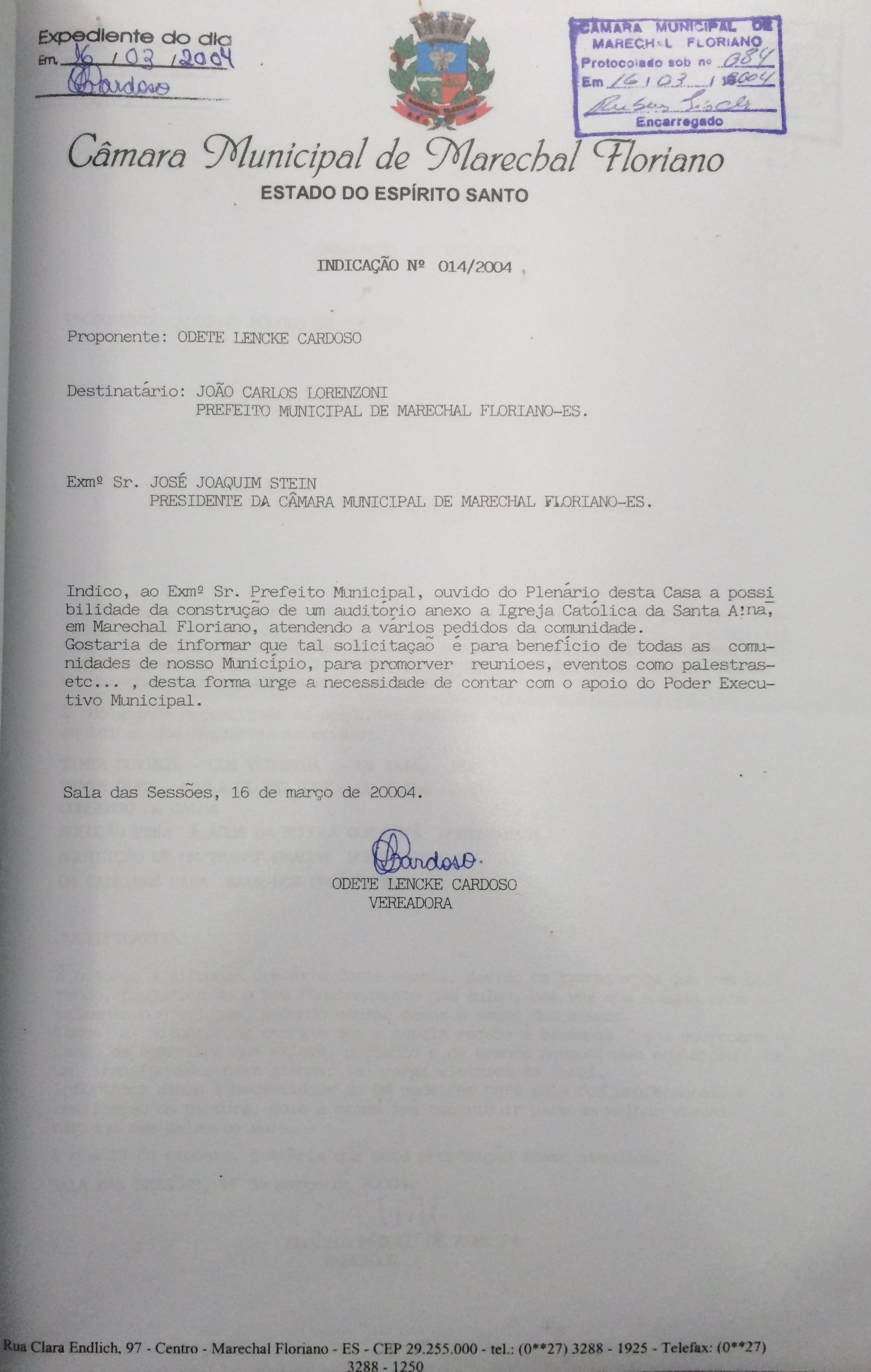 Ementa: INDICA A POSSIBILIDADE DA CONSTRUÇÃO DE UM AUDITÓRIO ANEXO A IGREJA CATÓLICA DA SANT'ANA, EM MARECHAL FLORIANO ATENDENDO A VÁRIOS PEDIDOS DA COMUNIDADE.