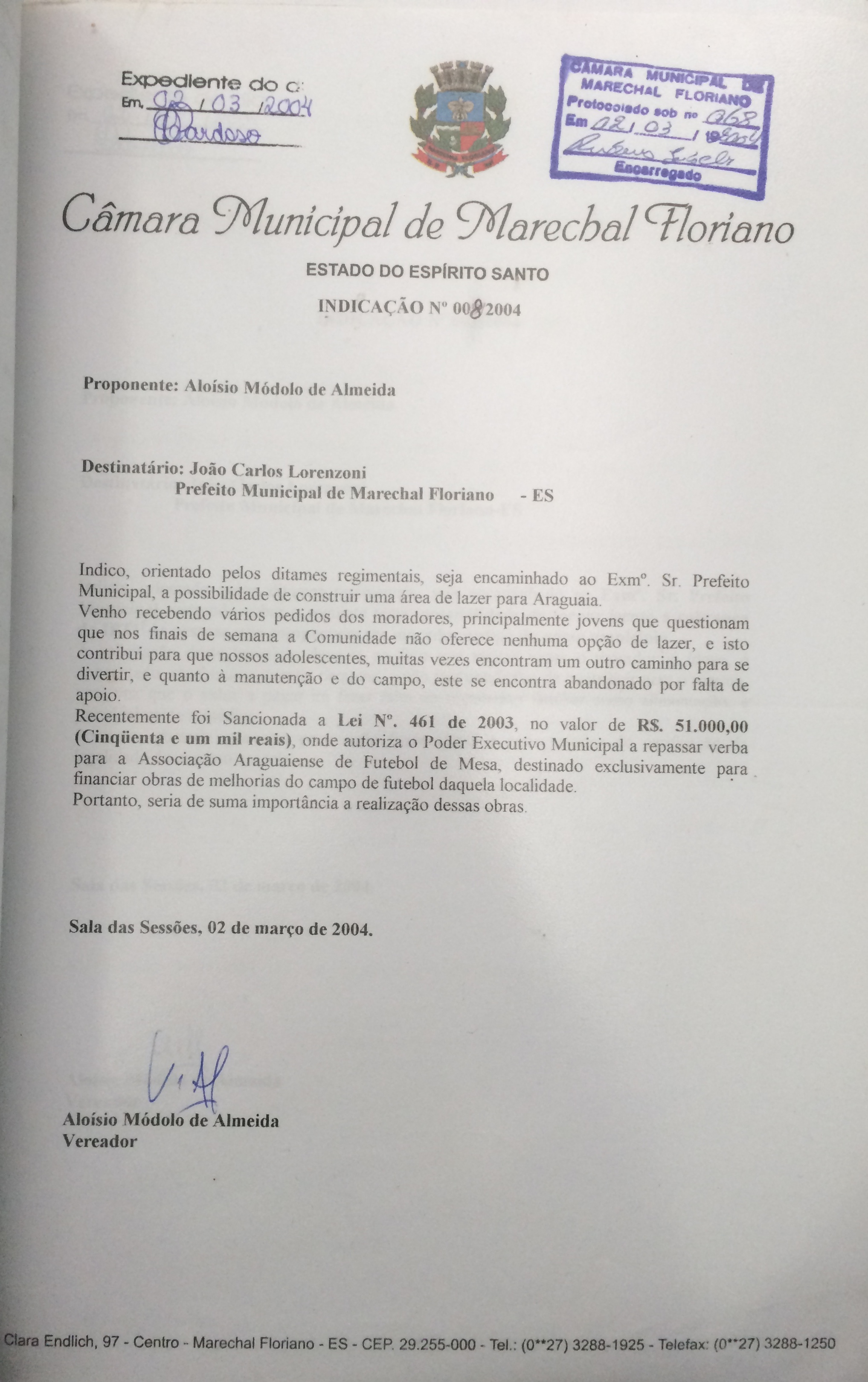Ementa: INDICA A POSSIBILIDADE DE CONSTRUIR UMA ÁREA DE LAZER EM ARAGUAIA.