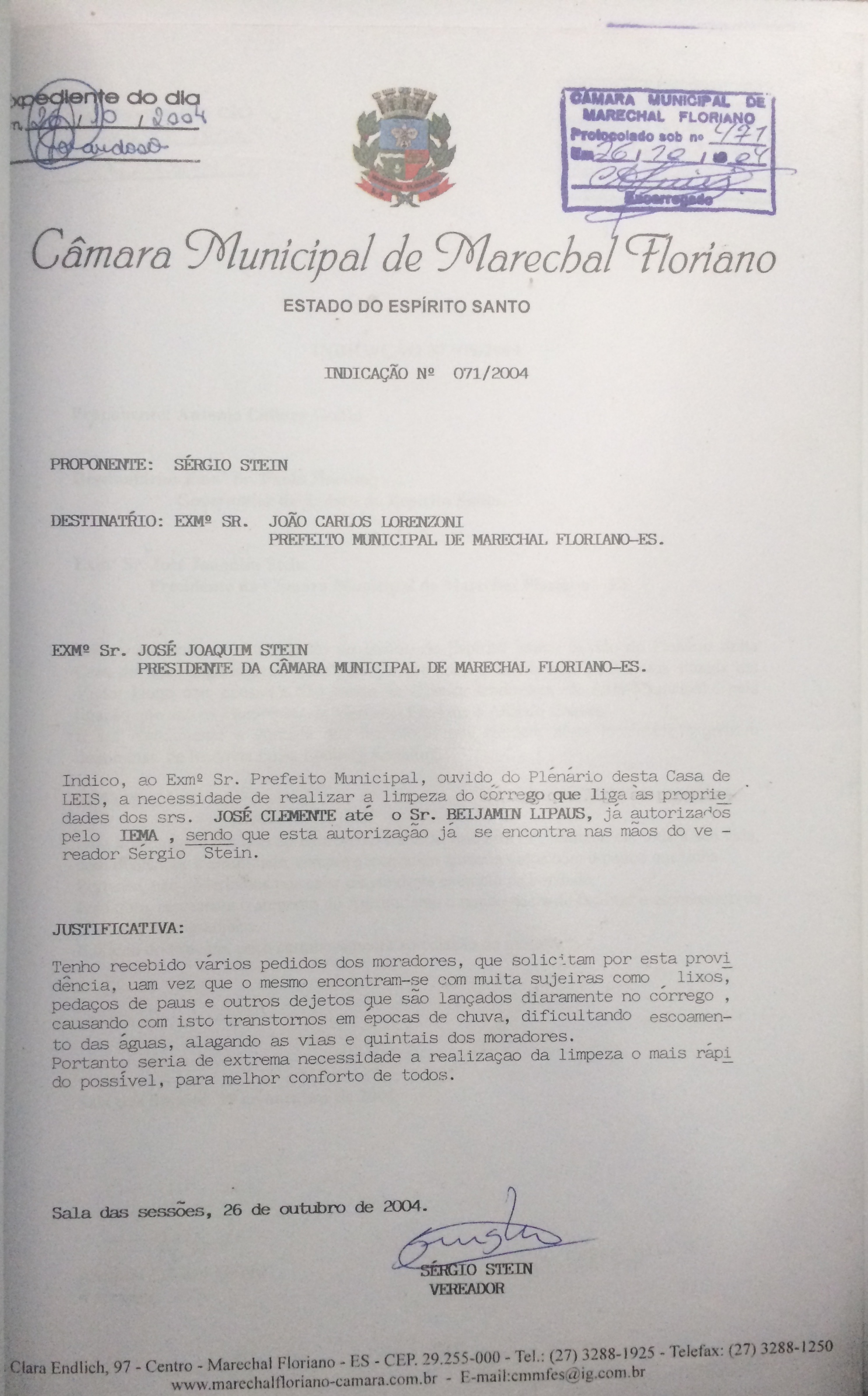 Ementa: INDICA A NECESSIDADE DE REALIZAR A LIMPEZA DO CÓRREGO QUE LIGA AS PROPRIEDADES DOS SRS. JOSÉ CLEMENTE ATÉ O SR. BEIJAMIN LIPAUS, JÁ AUTORIZADOS PELO IEMA, SENDO QUE ESTA AUTORIZAÇÃO JÁ SE ENCONTRA NAS MÃOS DO VEREADOR SÉRGIO STEIN.