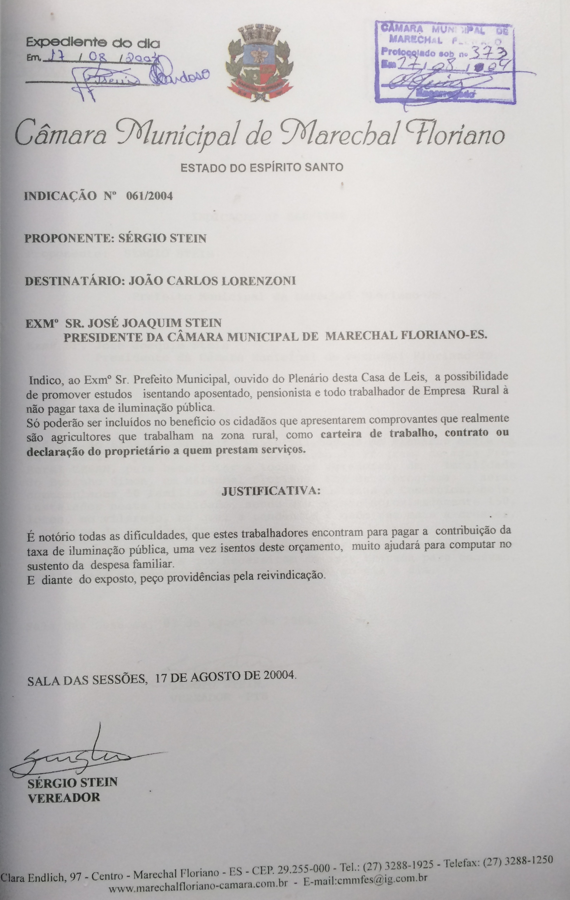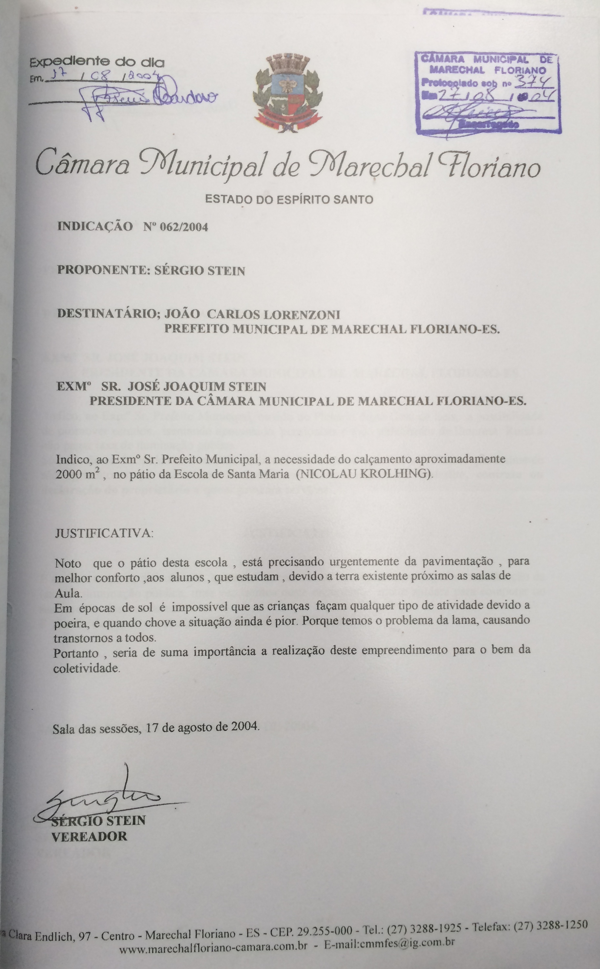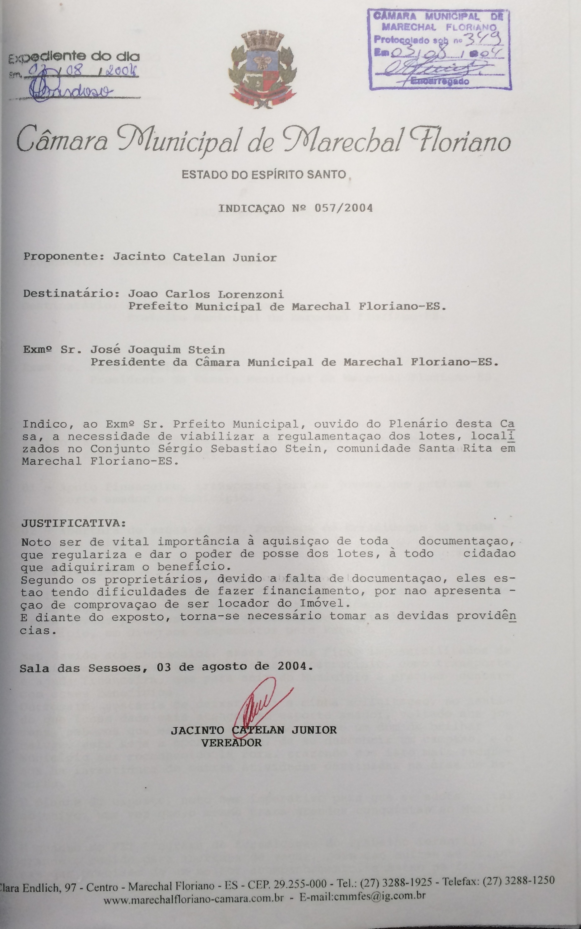 Ementa: INDICA A NECESSIDADE DE VIABILIZAR A REGULAMENTAÇÃO DOS LOTES, LOCALIZADOS NO CONJUNTO SÉRGIO SEBASTIÃO STEIN, COMUNIDADE DE SANTA RITA EM MARECHAL FLORIANO-ES.