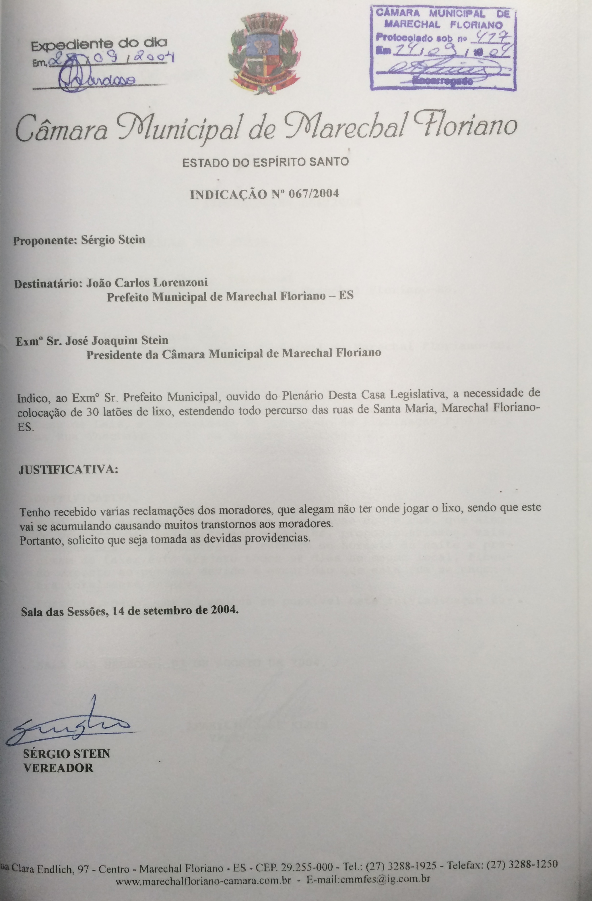 Ementa: INDICA A NECESSIDADE DE COLOCAÇÃO DE 30 LATÕES DE LIXO, ESTENDENDO TODO O PERCURSO DAS RUAS DE SANTA MARIA, MARECHAL FLORIANO-ES.