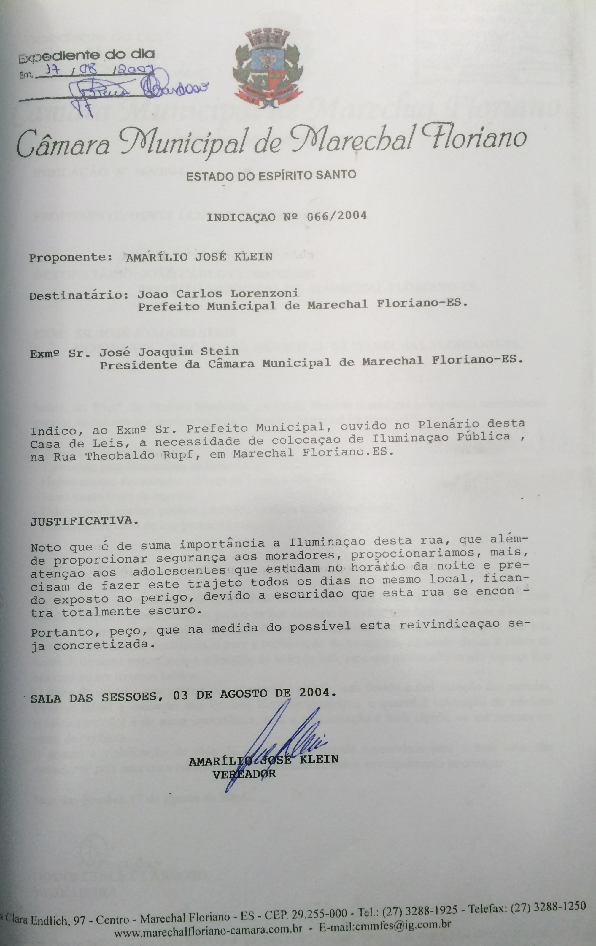 Ementa: INDICA A NECESSIDADE DE COLOCAÇÃO DE ILUMINAÇÃO PÚBLICA, NA RUA THEOBALDO RUPF, EM MARECHAL FLORIANO-ES.