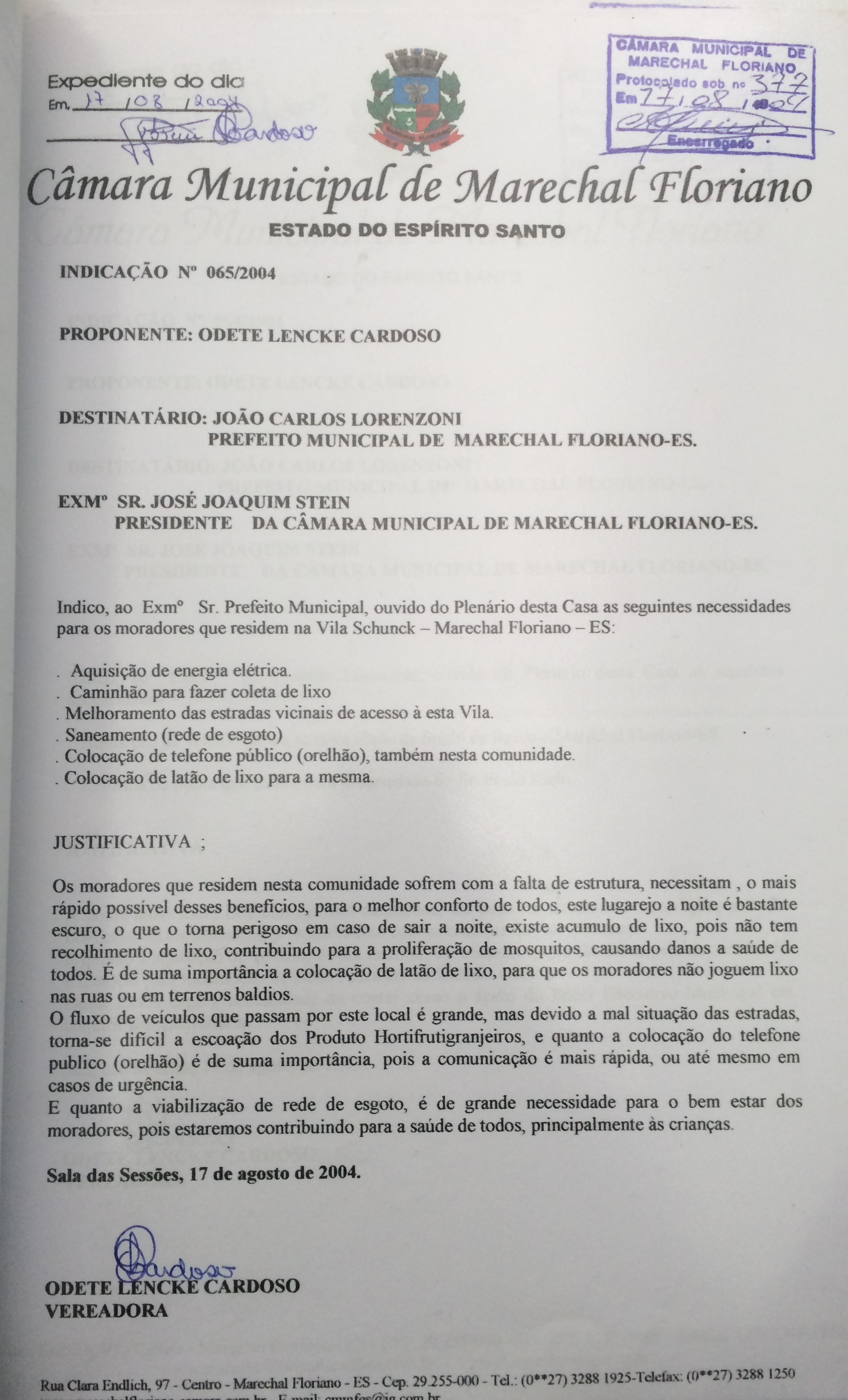 Ementa: INDICA AS SEGUINTES NECESSIDADES PARA OS MORADORES QUE RESIDEM NA VILA SCHUNCK - MARECHAL FLORIANO-ES: