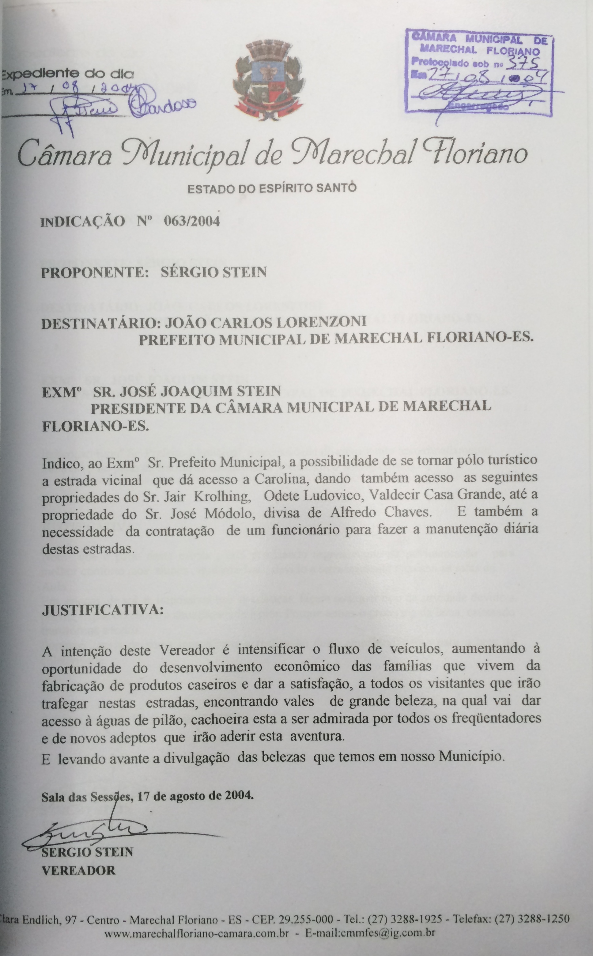 Ementa: INDICA A POSSIBILIDADE DE SE TORNAR PÓLO TURISTICO A ESTRADA VICINAL QUE DÁ ACESSO A CAROLINA, DANDO TAMBÉM ACESSO AS SEGUINTES PROPRIEDADES DO SR. JAIR KROHLING, ODETE LUDOVICO, VALDECIR CASA GRANDE, ATÉ A PROPRIEDADE DO SR. JOSÉ MODOLO, DIVISA DE ALFREDO CHAVES. E TAMBÉM A NECESSIDADE DE CONTRATAÇÃO DE UM FUNCIONÁRIO PARA FAZER MANUTENÇÃO DIÁRIA DESTAS ESTRADAS.
