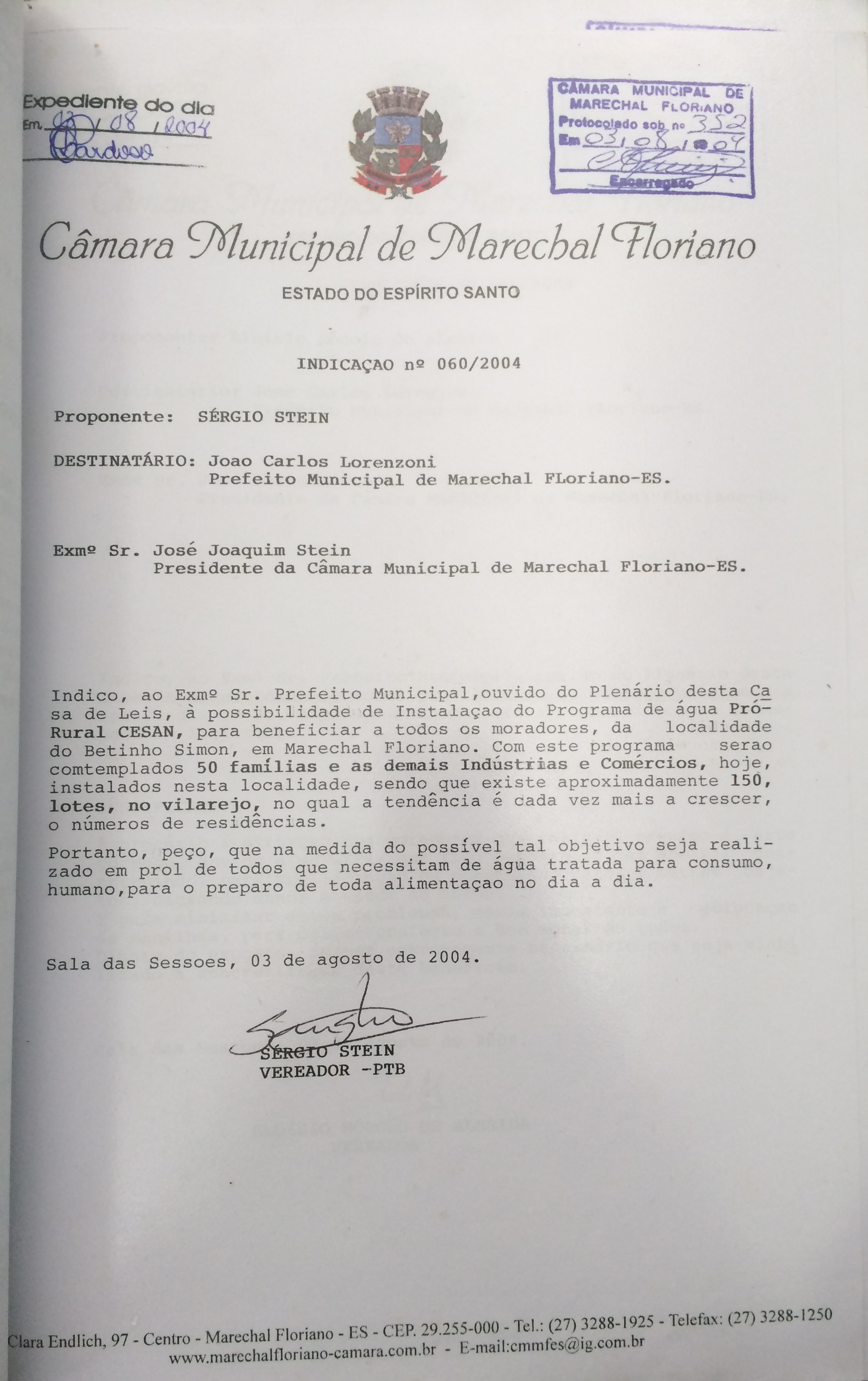 Ementa: INDICA A POSSIBILIDADE DE INSTALAÇÃO DO PROGRAMA DE ÁGUA PRÓ RURAL CESAN, PARA BENEFICIAR A TODOS OS MORADORES DA LOCALIDADE DO BETINHO SIMON, EM MARECHAL FLORIANO.