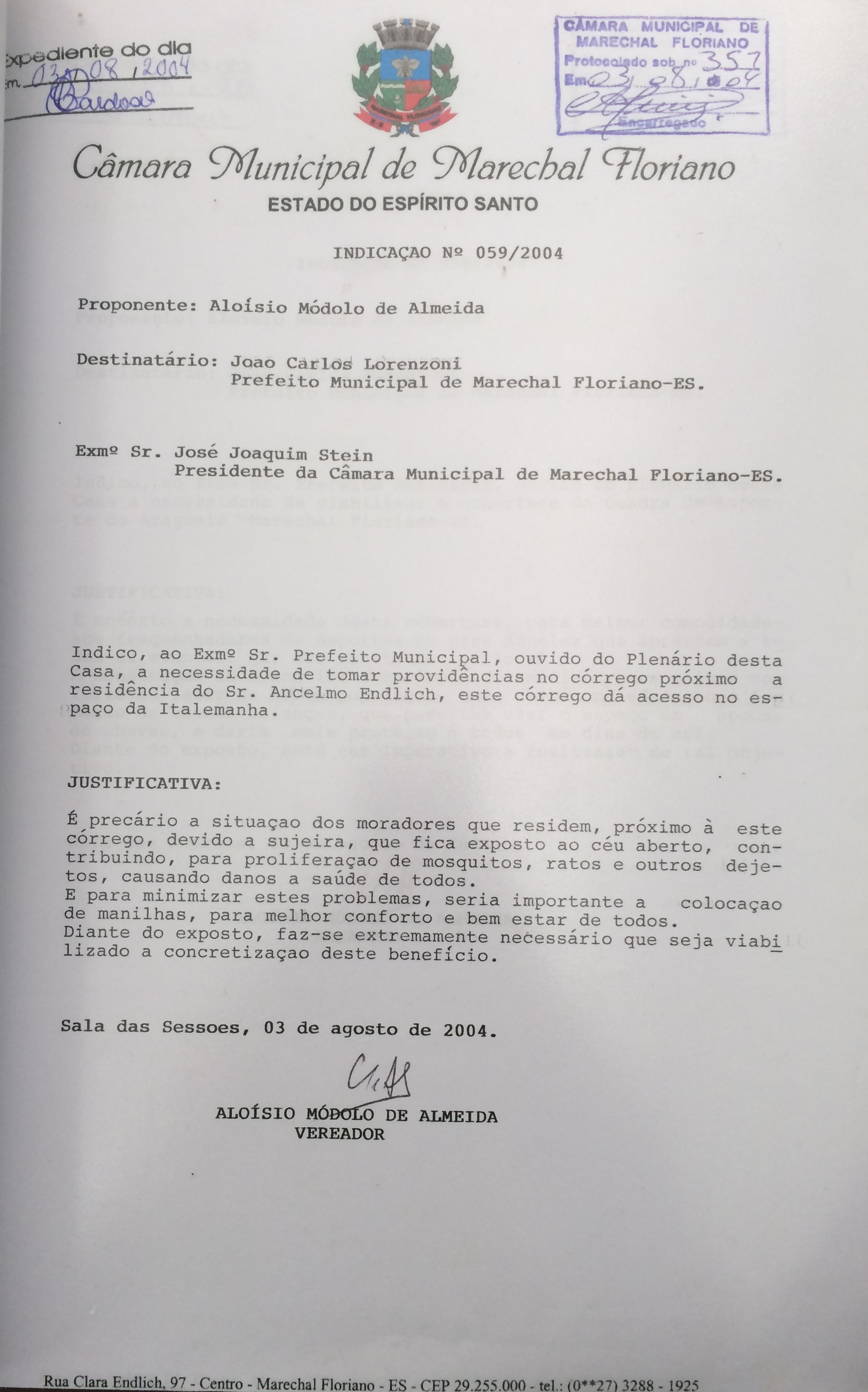 Ementa: INDICA A NECESSIDADE DE TOMAR PROVIDÊNCIAS NO CÓRREGO PRÓXIMO A RESIDÊNCIA DO SR. ANCELMO ENDLICH, ESTE CÓRREGO DÁ ACESSO NO ESPAÇO DA ITALEMANHA.