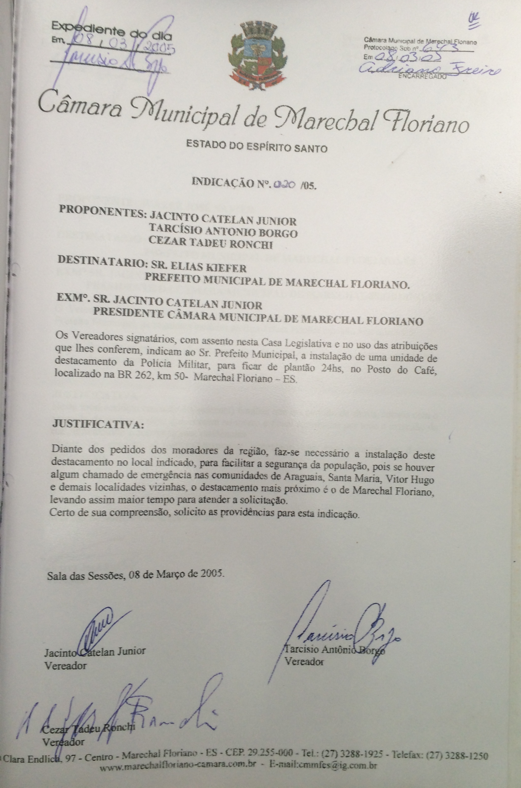 INDICA A INSTALAÇÃO DE UMA UNIDADE DE DESTACAMENTO DA POLICIA MILITAR, PARA FICAR DE PLANTÃO 24HS, NO POSTO DO CAFÉ, LOCALIZADO NA BR 262, KM 50 - MARECHAL FLORIANO-ES.