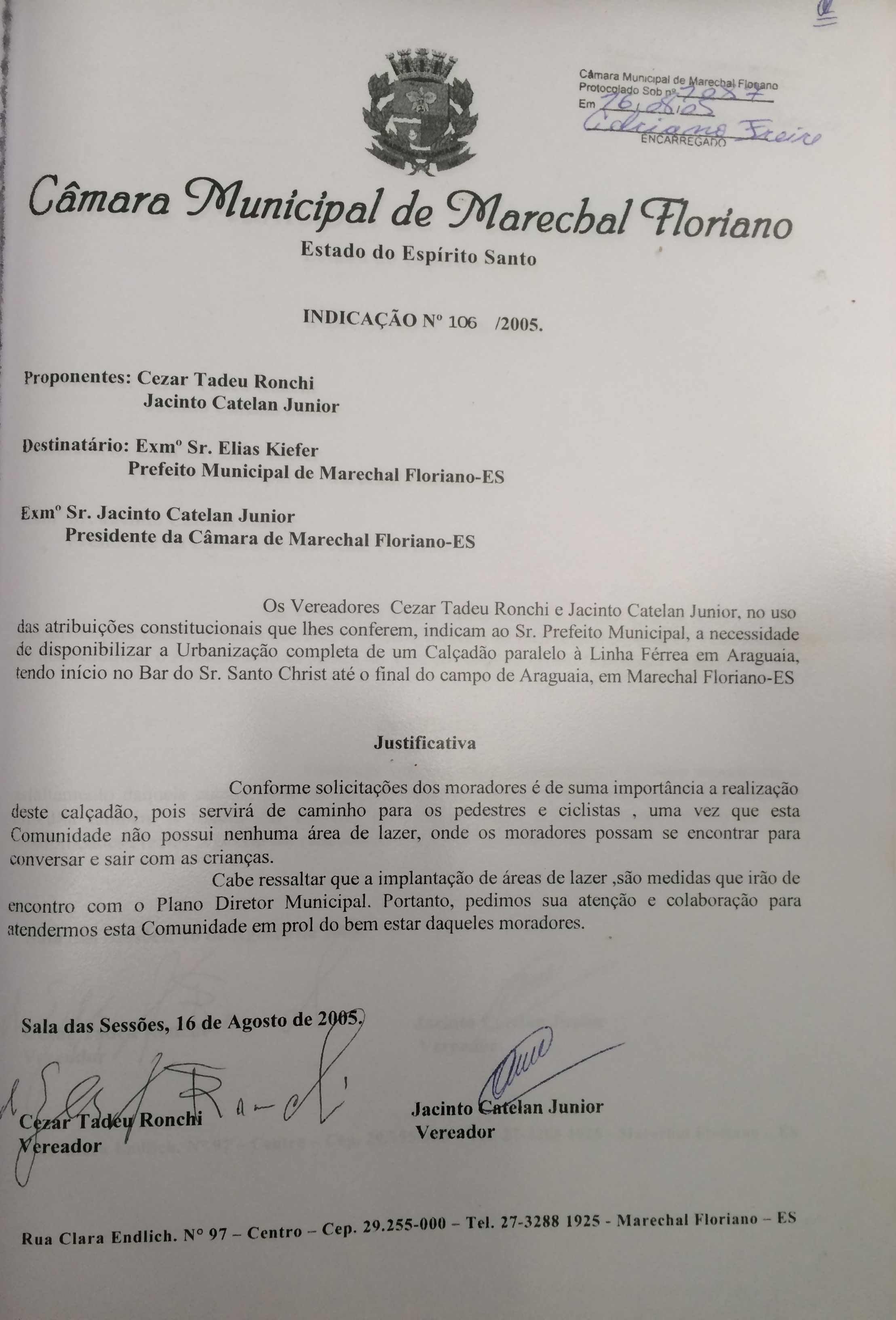 Ementa: INDICA A NECESSIDADE DE DISPONIBILIZAR A URBANIZAÇÃO COMPLETA DE UM CALÇADÃO PARALELO À LINHA FÉRREA EM ARAGUAIA, TENDO INICIO NO BAR DO SR. SANTO CHRIST ATÉ O FINAL DO CAMPO DE ARAGUAIA, EM MARECHAL FLORIANO-ES.