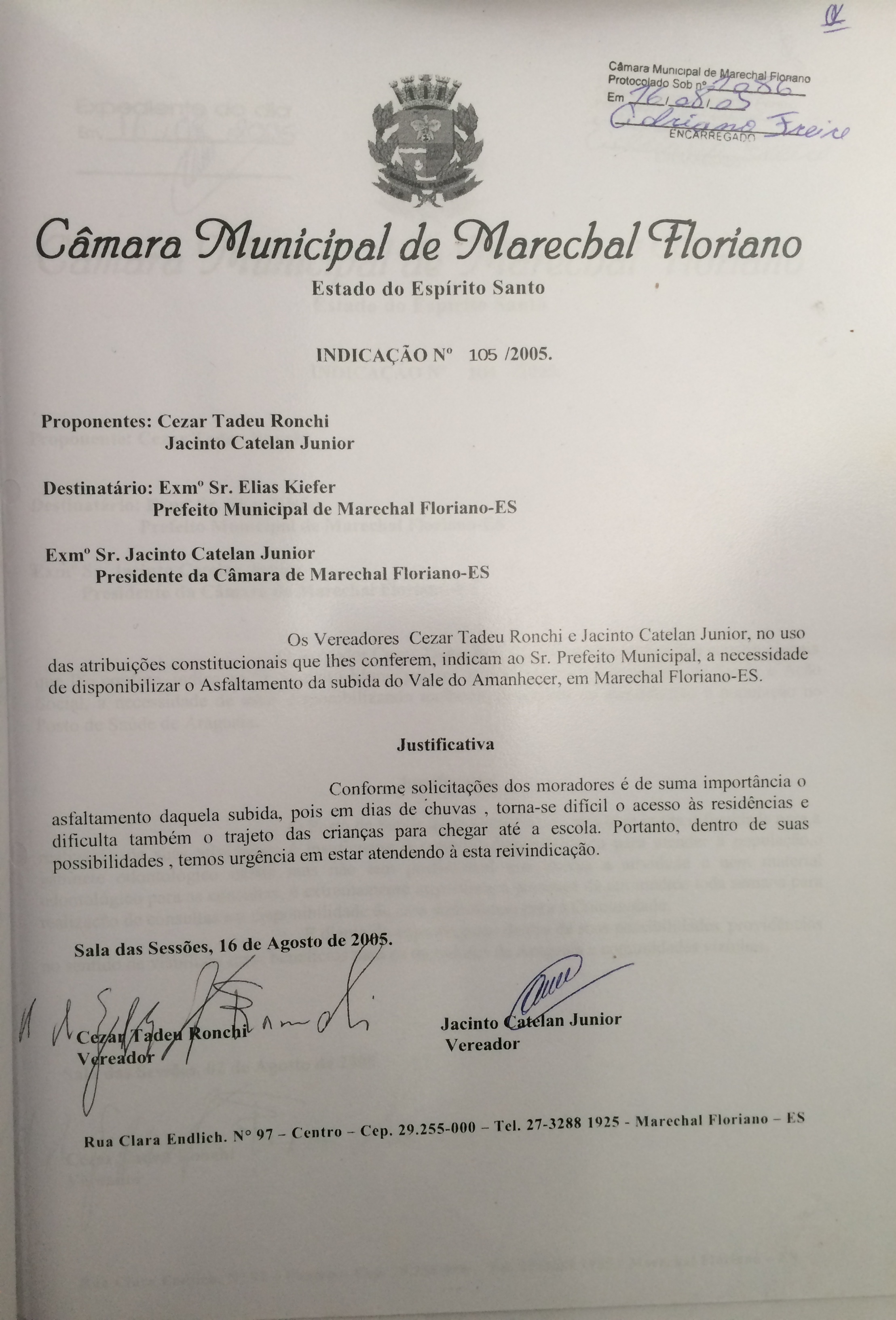 Ementa: INDICA A NECESSIDADE DE DISPONIBILIZAR O ASFALTAMENTO DA SUBIDA DO VALE DO AMANHECER, EM MARECHAL FLORIANO - ES.