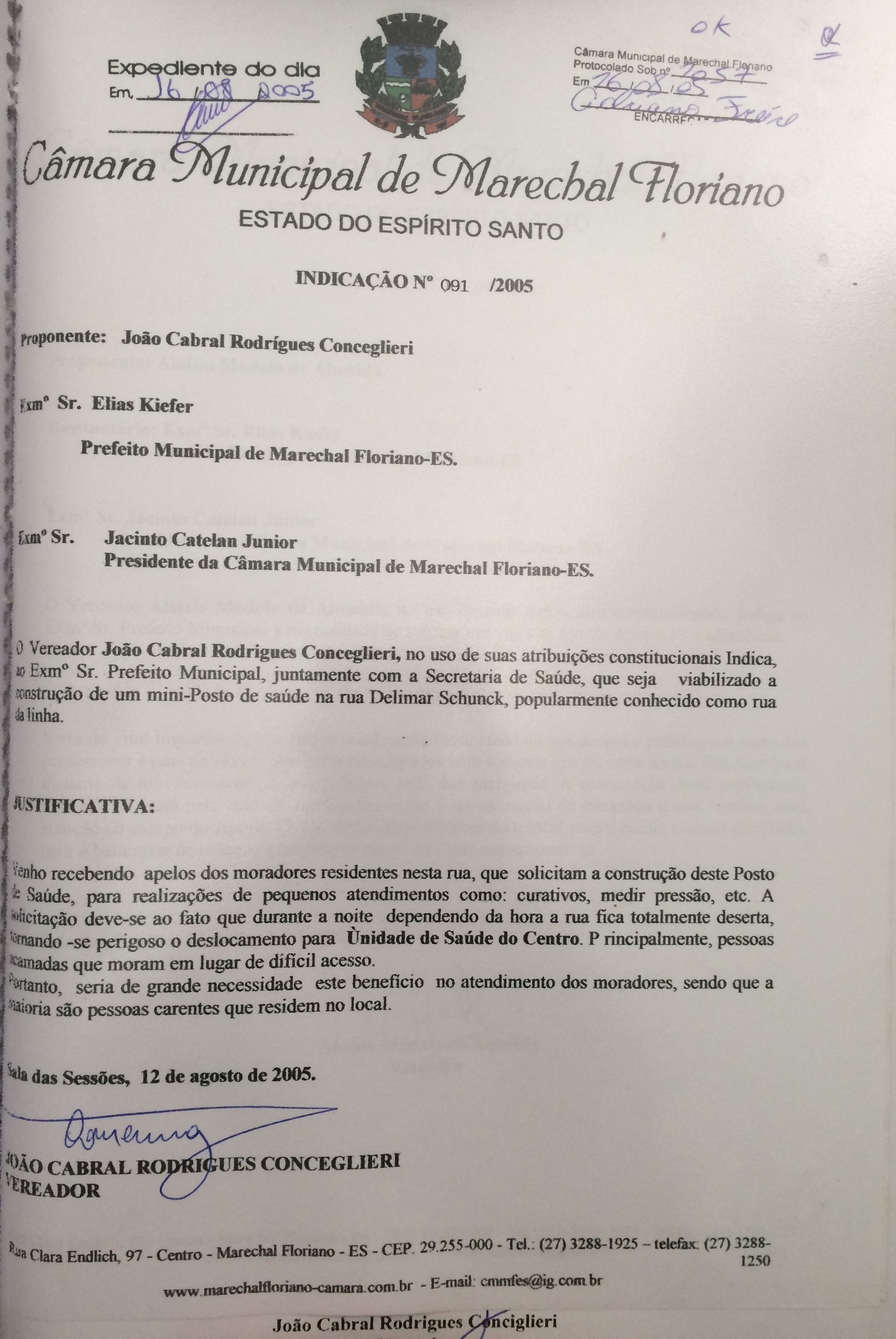 Ementa: INDICA QUE SEJA VIABILIZADO A CONSTRUÇÃO DE UM MINI-POSTO DE SAÚDE NA RUA DELIMAR SCHUNCK, POPULARMENTE CONHECIDO COMO RUA DA LINHA.