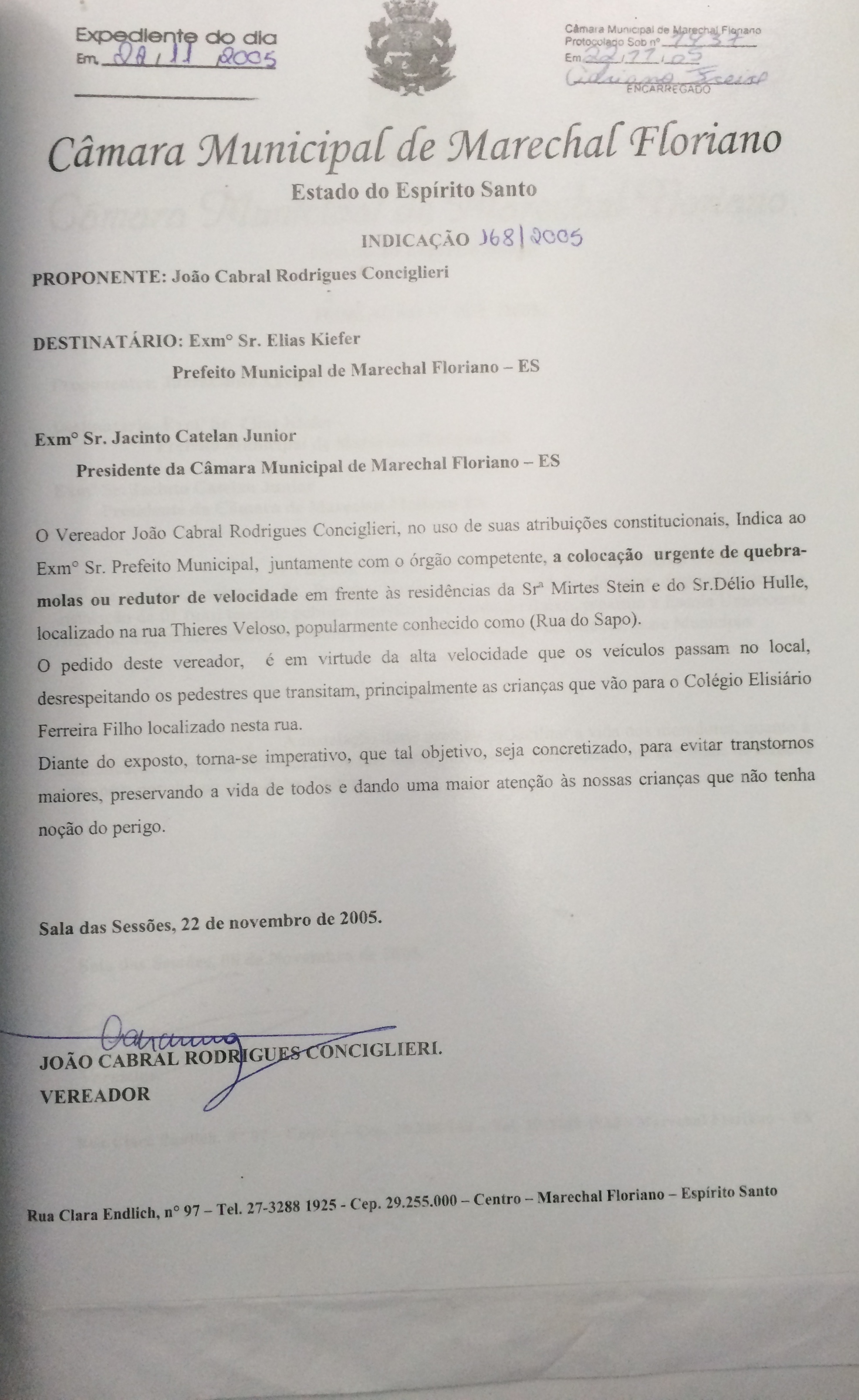Ementa: INDICA A COLOCAÇÃO URGENTE DE QUEBRA MOLAS OU REDUTOR DE VELOCIDADE EM FRENTE ÀS RESIDÊNCIAS DA SRª MIRTES STEIN E DO SR. DÉLIO HULLE, LOCALIZADO NA RUA THIERES VELOSOS, POPULARMENTE CONHECIDA COMO (RUA DO SAPO).