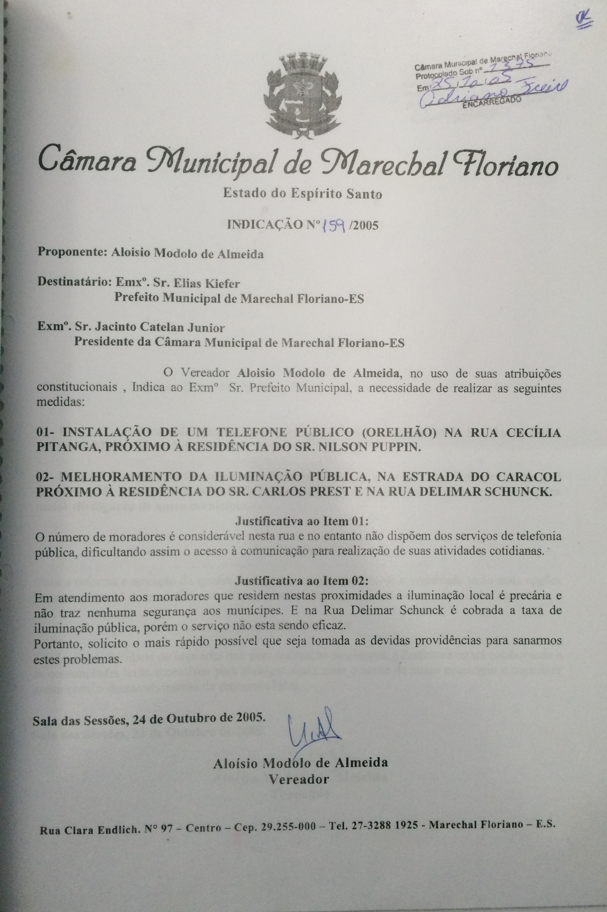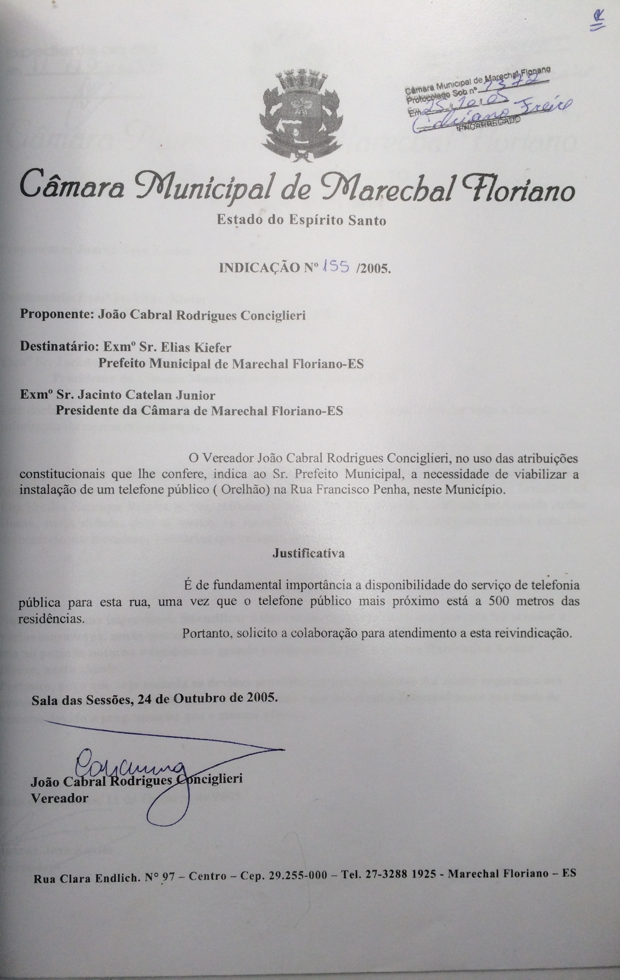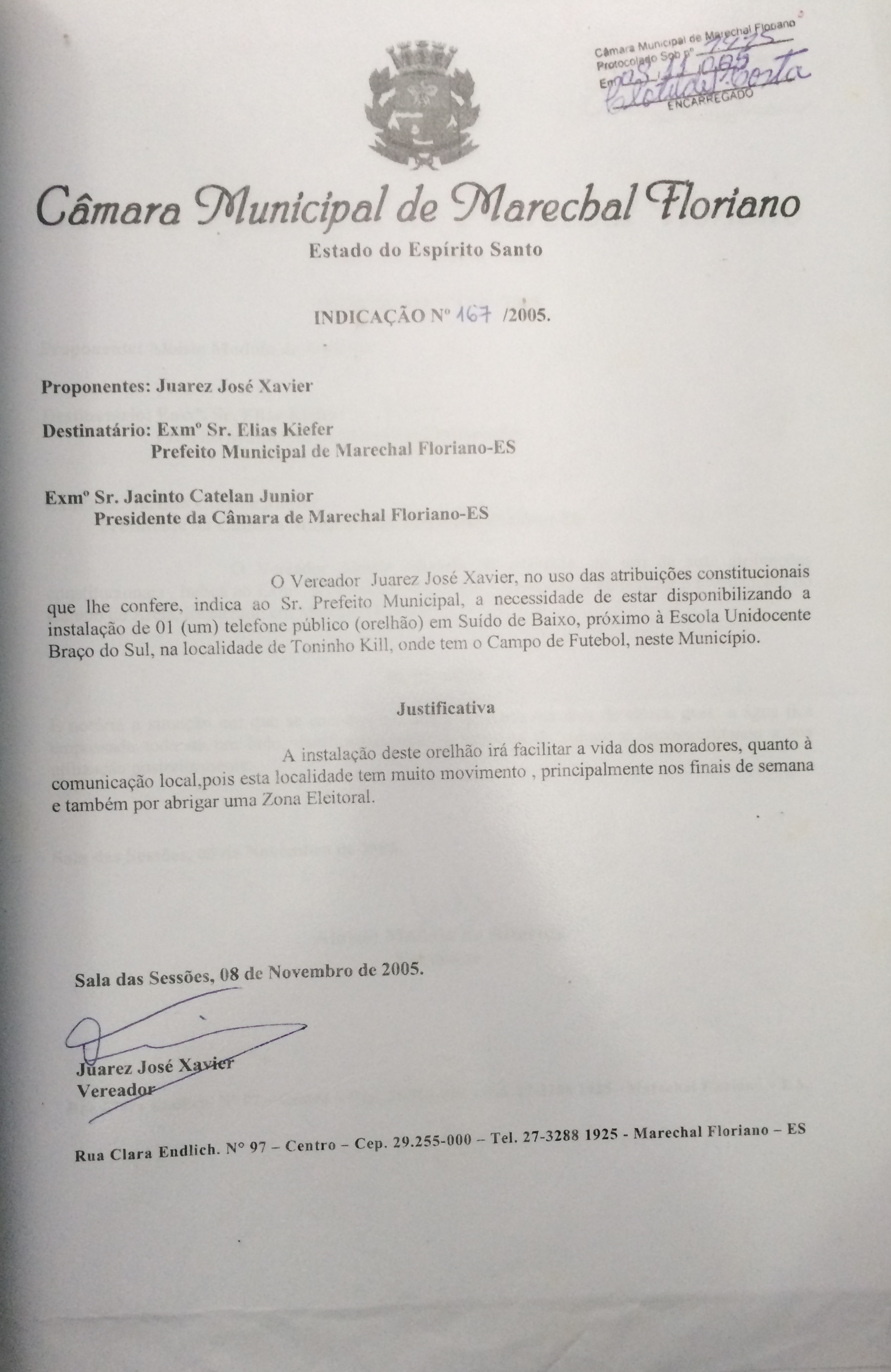 Ementa: INDICA A NECESSIDADE DE ESTAR DISPONIBILIZANDO INSTALAÇÃO 01 (UM) TELEFONE PÚBLICO (ORELHÃO) EM SOÍDO DE BAIXO, PRÓXIMO À ESCOLA UNI DOCENTE BRAÇO SUL, NA LOCALIDADE DE TONINHO KILL, ONDE TEM O CAMPO DE FUTEBOL, NESTE MUNICÍPIO.