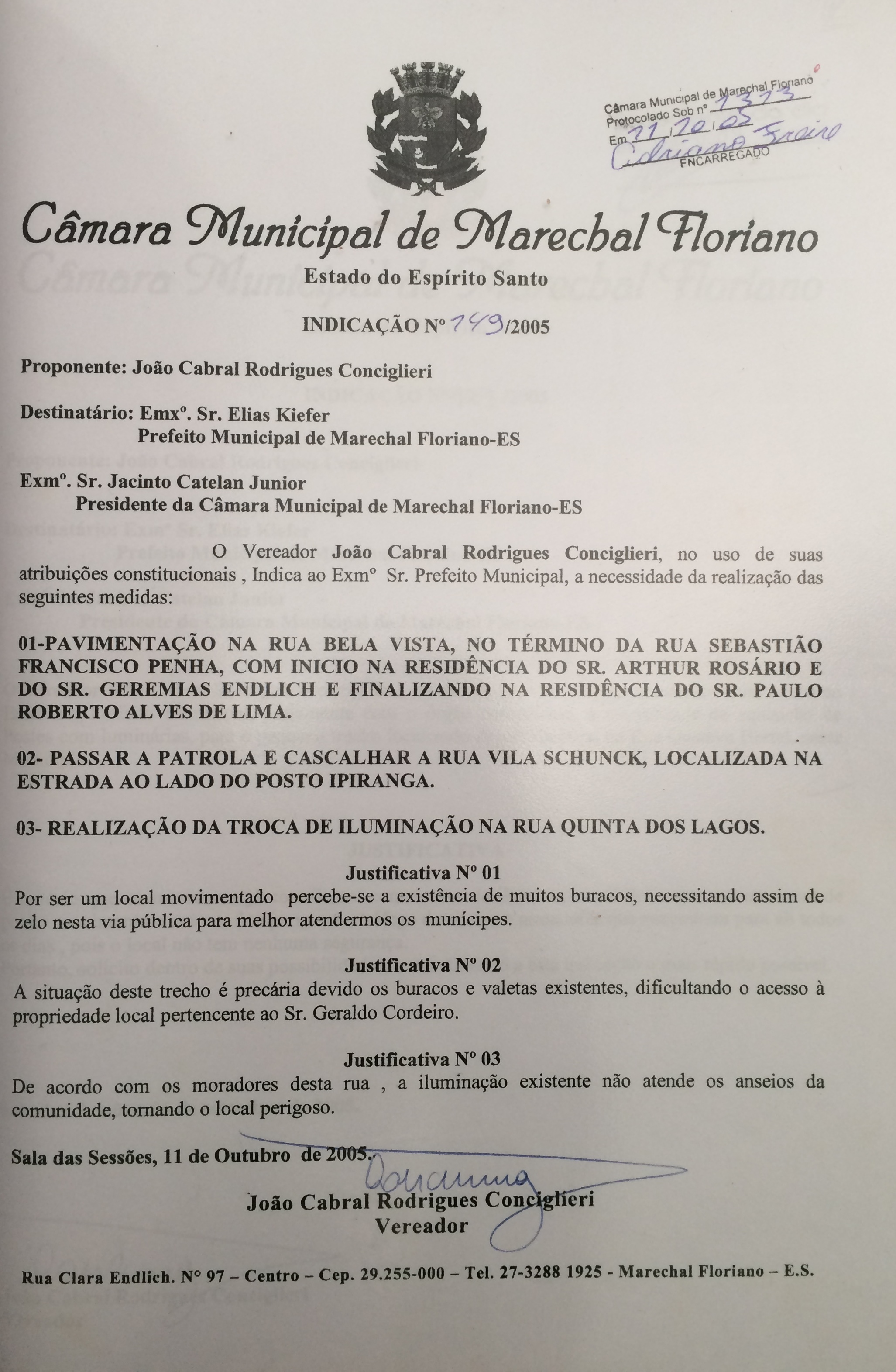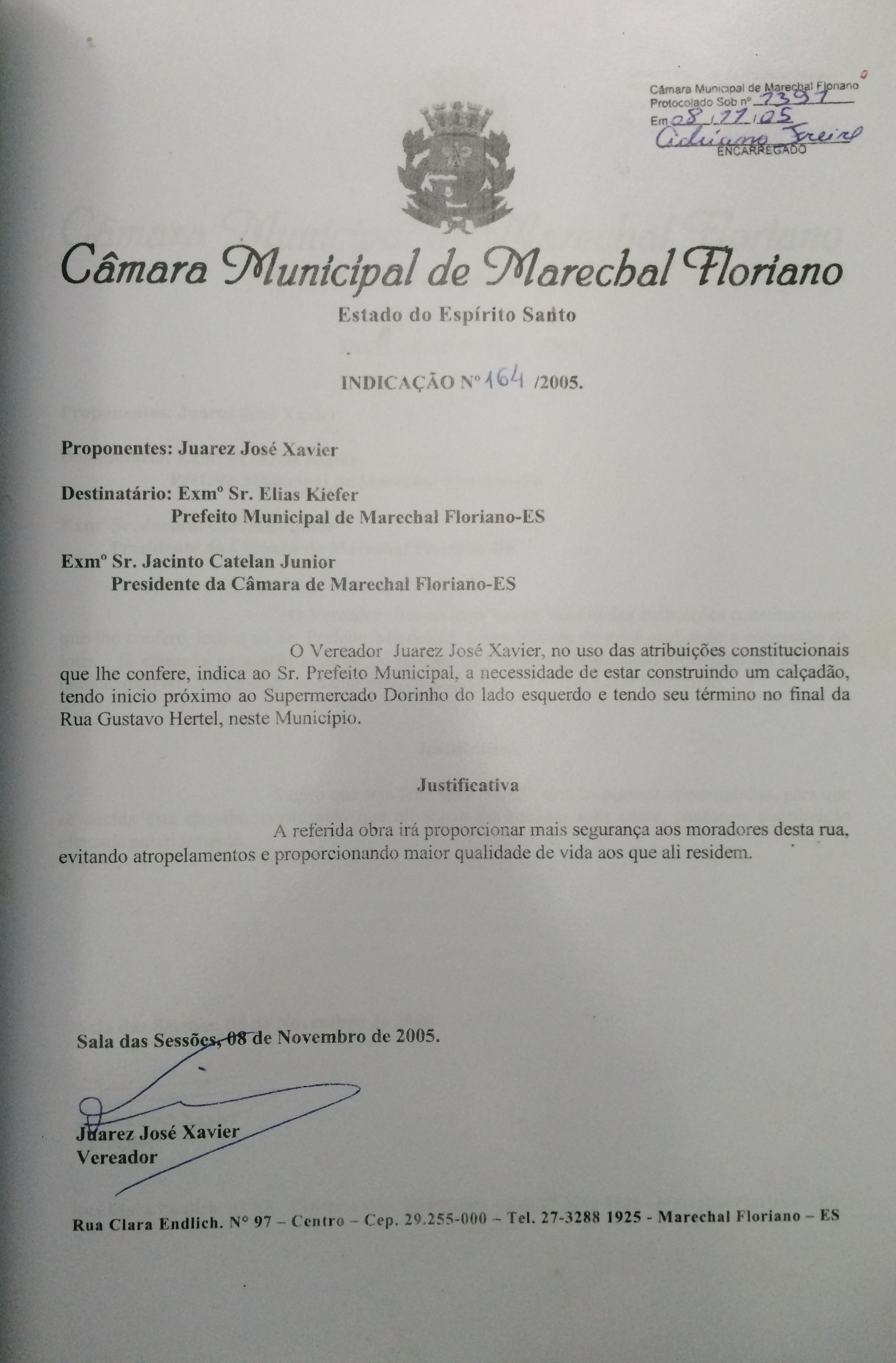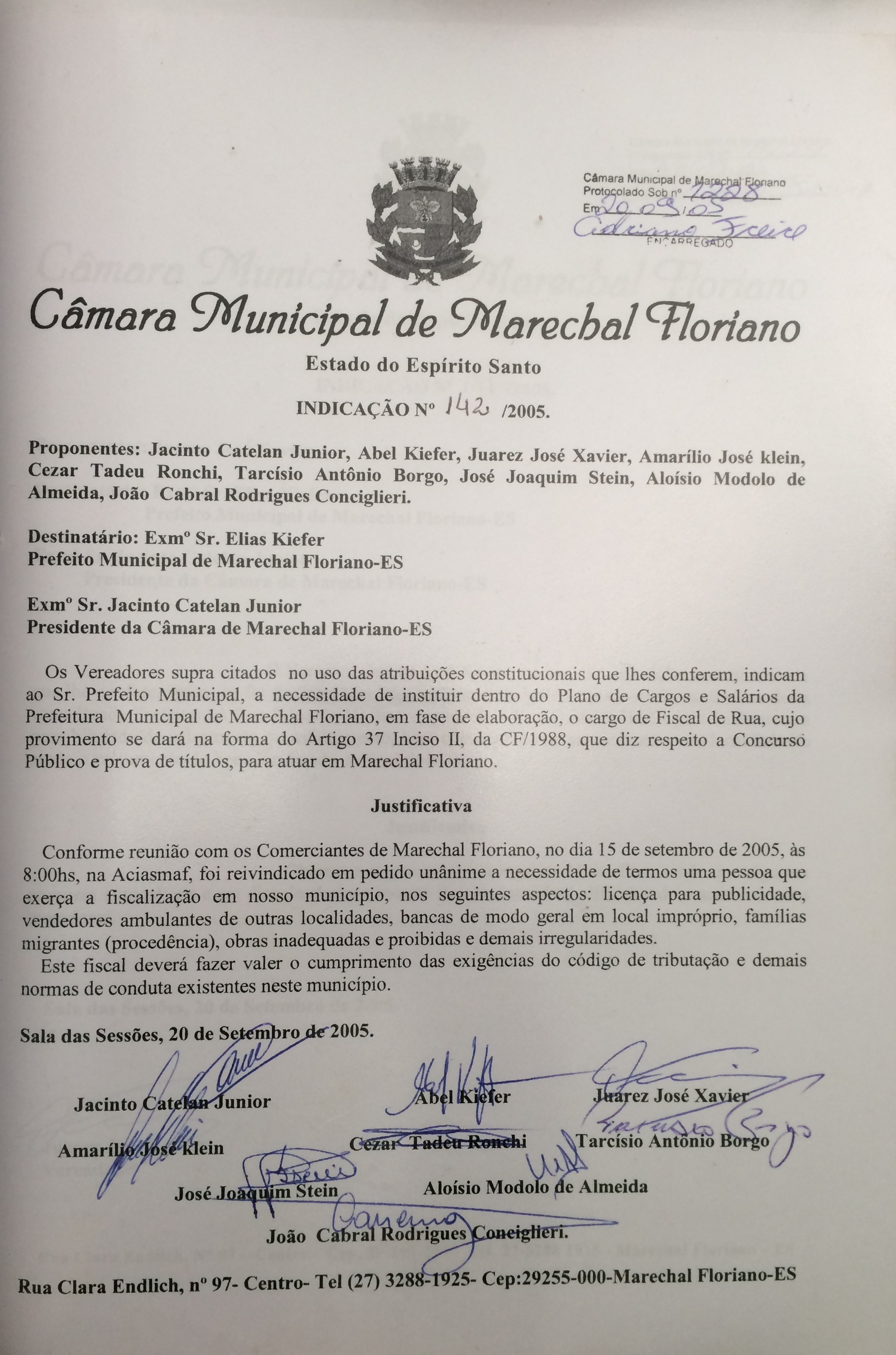 Ementa: INDICA A NECESSIDADE DE INSTITUIR DENTRO DO PLANO DE CARGOS E SALÁRIOS DA PREFEITURA MUNICIPAL DE MARECHAL FLORIANO, EM FASE DE ELABORAÇÃO, O CARGO DE FISCAL DE RUA, CUJO PROVIMENTO SE DARÁ NA FORMA DO ARTIGO 37 INCISO II, DA CF/1988, QUE DIZ RESPEITO A CONCURSO PÚBLICO E PROVA DE TÍTULOS, PARA ATUAR EM MARECHAL FLORIANO.