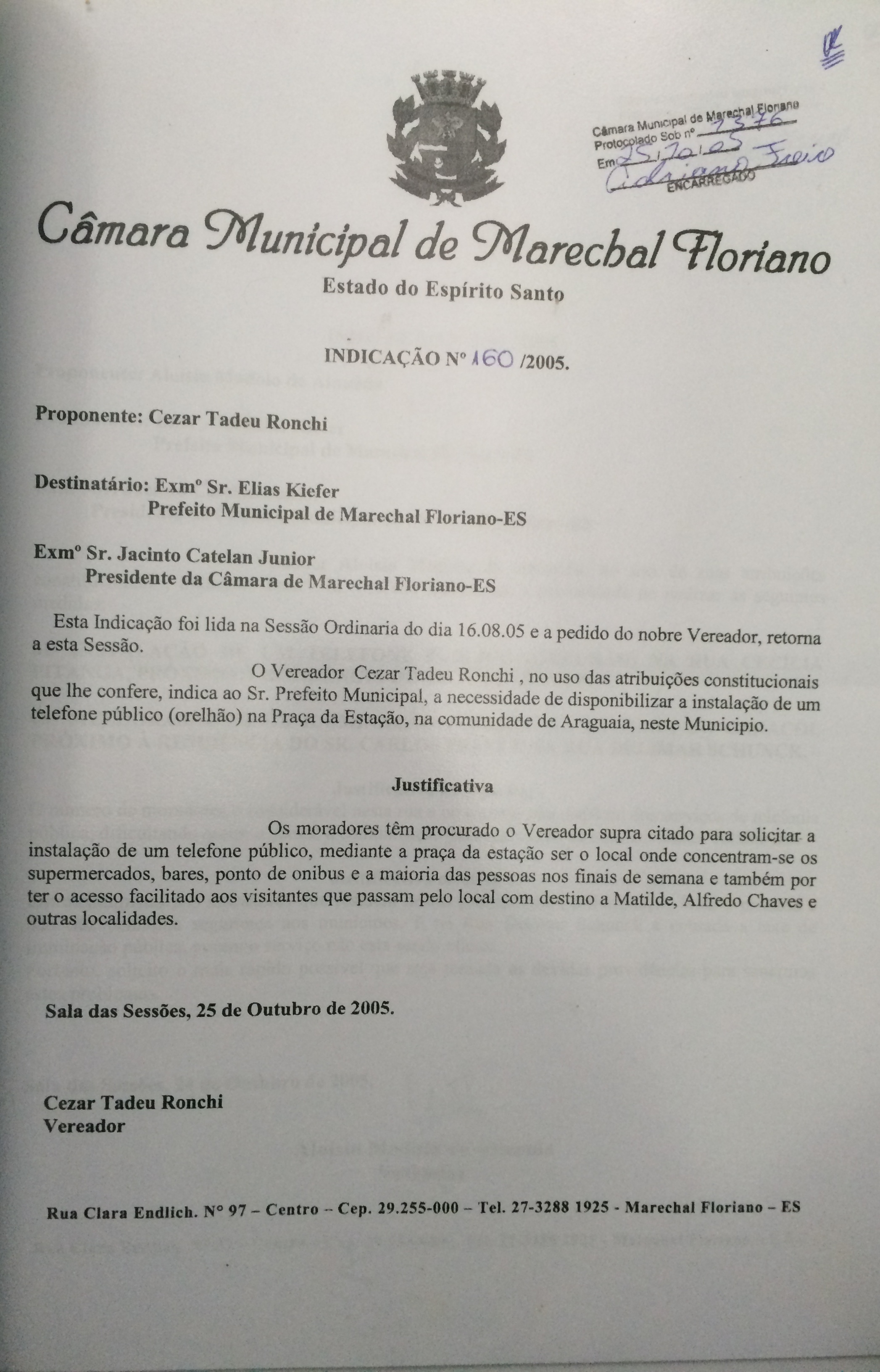 Ementa: INDICA A NECESSIDADE DE DISPONIBILIZAR A INSTALAÇÃO DE UM TELEFONE PÚBLICO (ORELHÃO) NA PRAÇA DA ESTAÇÃO, NA COMUNIDADE DE ARAGUAIA, NESTE MUNICÍPIO.