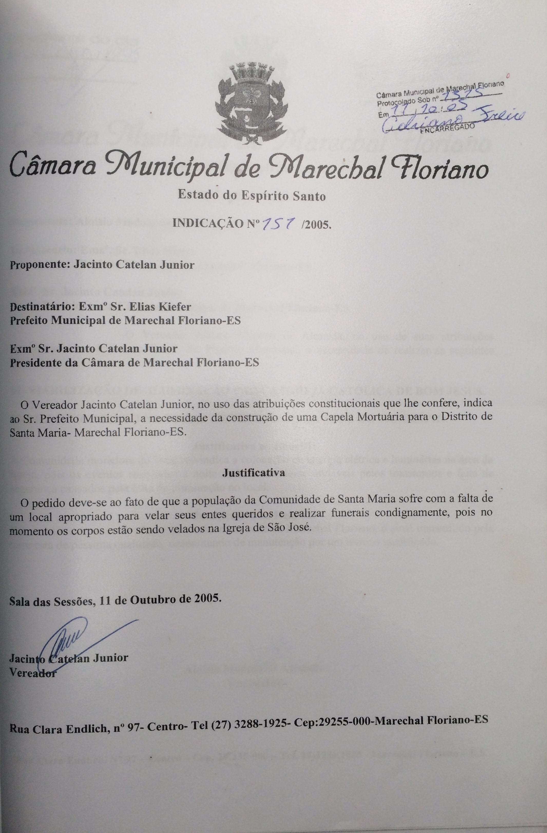 Ementa: INDICA A NECESSIDADE DE CONSTRUÇÃO DE UMA CAPELA MORTUÁRIA PARA O DISTRITO DE SANTA MARIA MARECHAL FLORIANO-ES.
