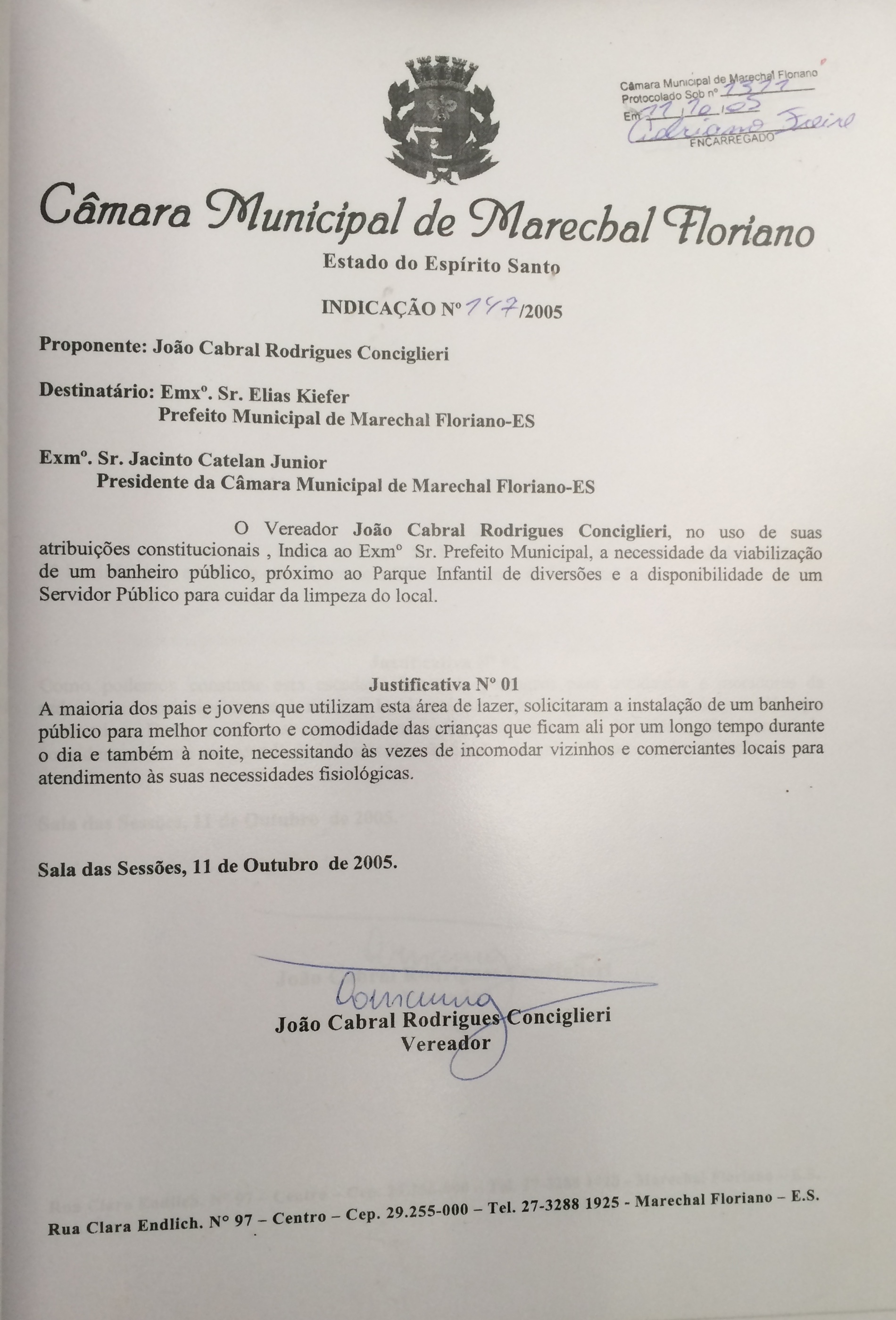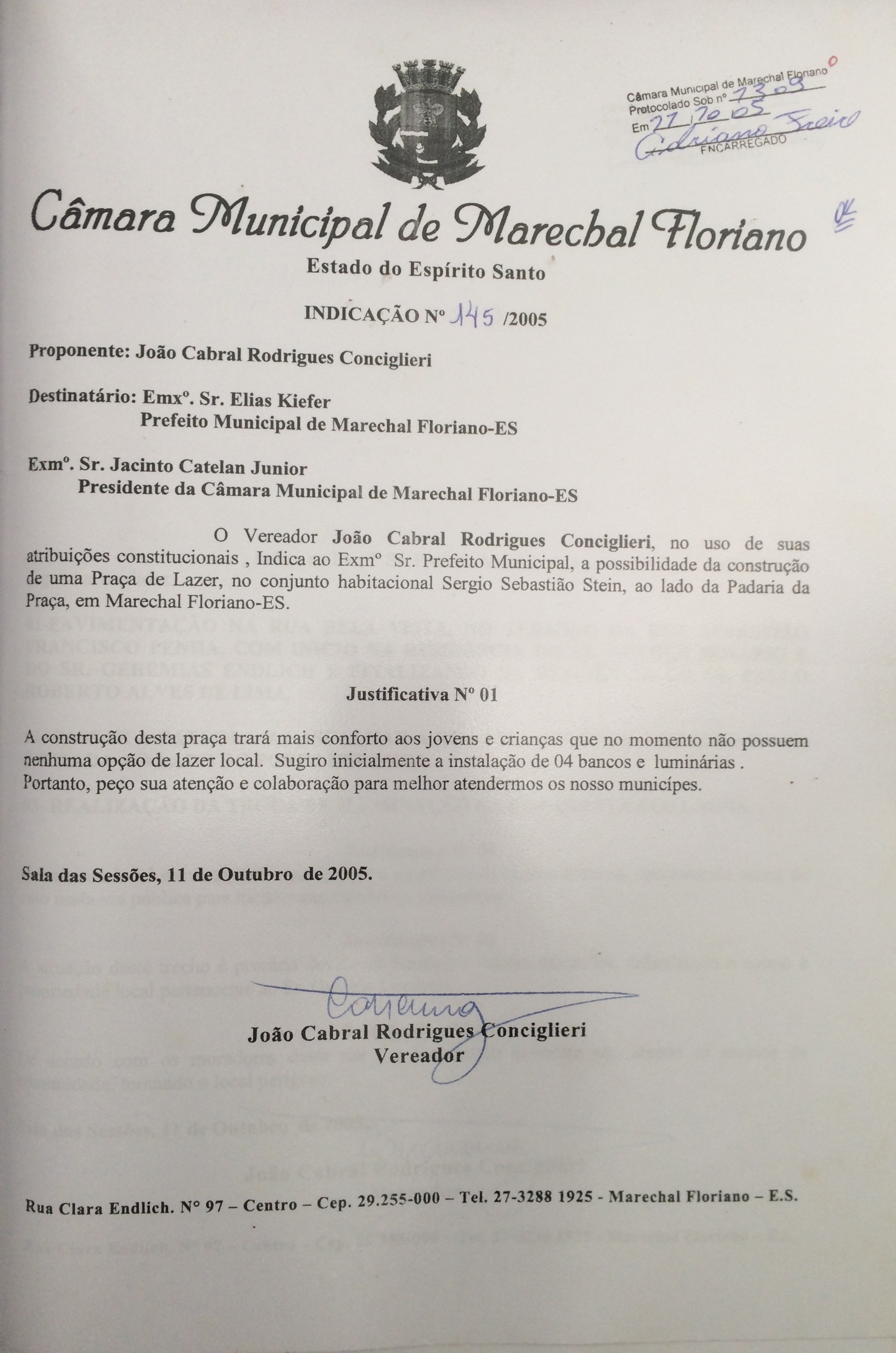 Ementa: INDICA A POSSIBILIDADE DA CONSTRUÇÃO DE UMA PRAÇA DE LAZER, NO CONJUNTO HABITACIONAL SERGIO SEBASTIÃO STEIN, AO LADO DA PADARIA DA PRAÇA, EM MARECHAL FLORIANO-ES.