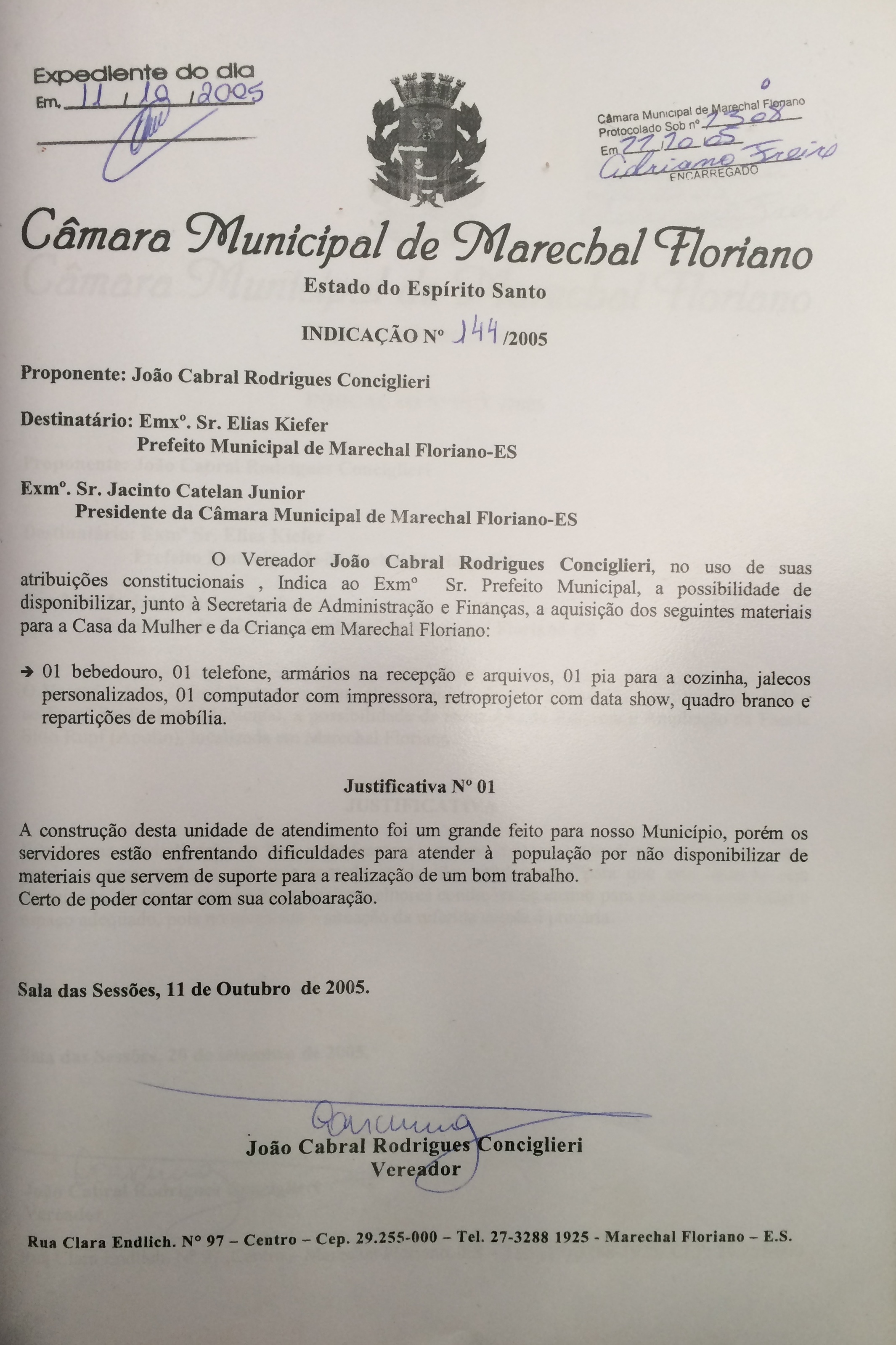 Ementa: INDICA A POSSIBILIDADE DE DISPONIBILIZAR, JUNTO À SECRETARIA DE ADMINISTRAÇÃO E FINANÇAS, A AQUISIÇÃO DOS SEGUINTES MATERIAIS PARA A CASA DA MULHER E DA CRIANÇA EM MARECHAL FLORIANO:
