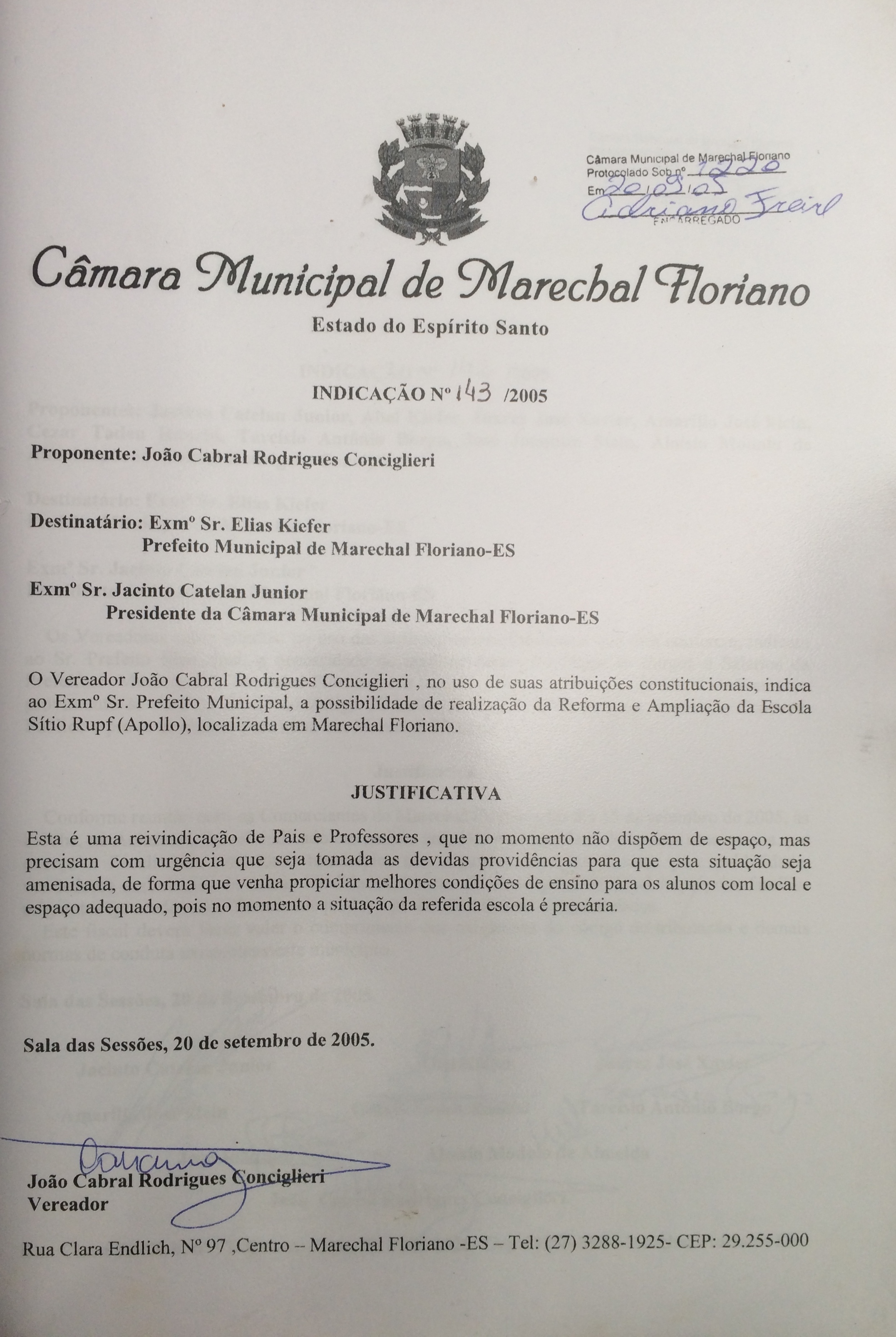 Ementa: INDICA A POSSIBILIDADE DE REALIZAÇÃO DA REFORMA E AMPLIAÇÃO DA ESCOLA SITIO RUPF (APOLLO), LOCALIZADA EM MARECHAL FLORIANO.