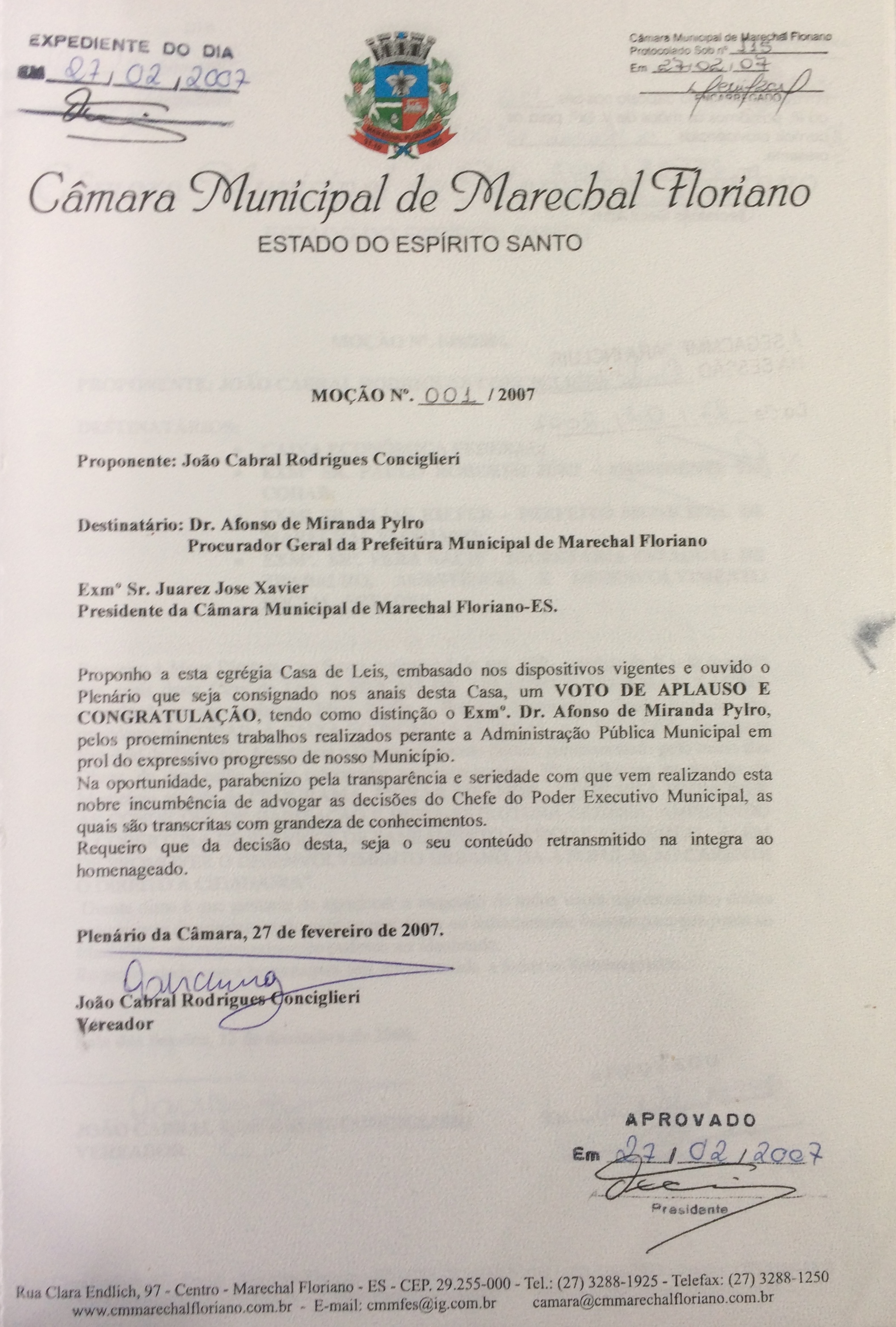 Ementa: MOÇÃO DE APLAUSO E CONGRATULAÇÃO, TENDO COMO DISTINÇÃO O EXM°.DR. AFONSO MIRANDA PYLRO.