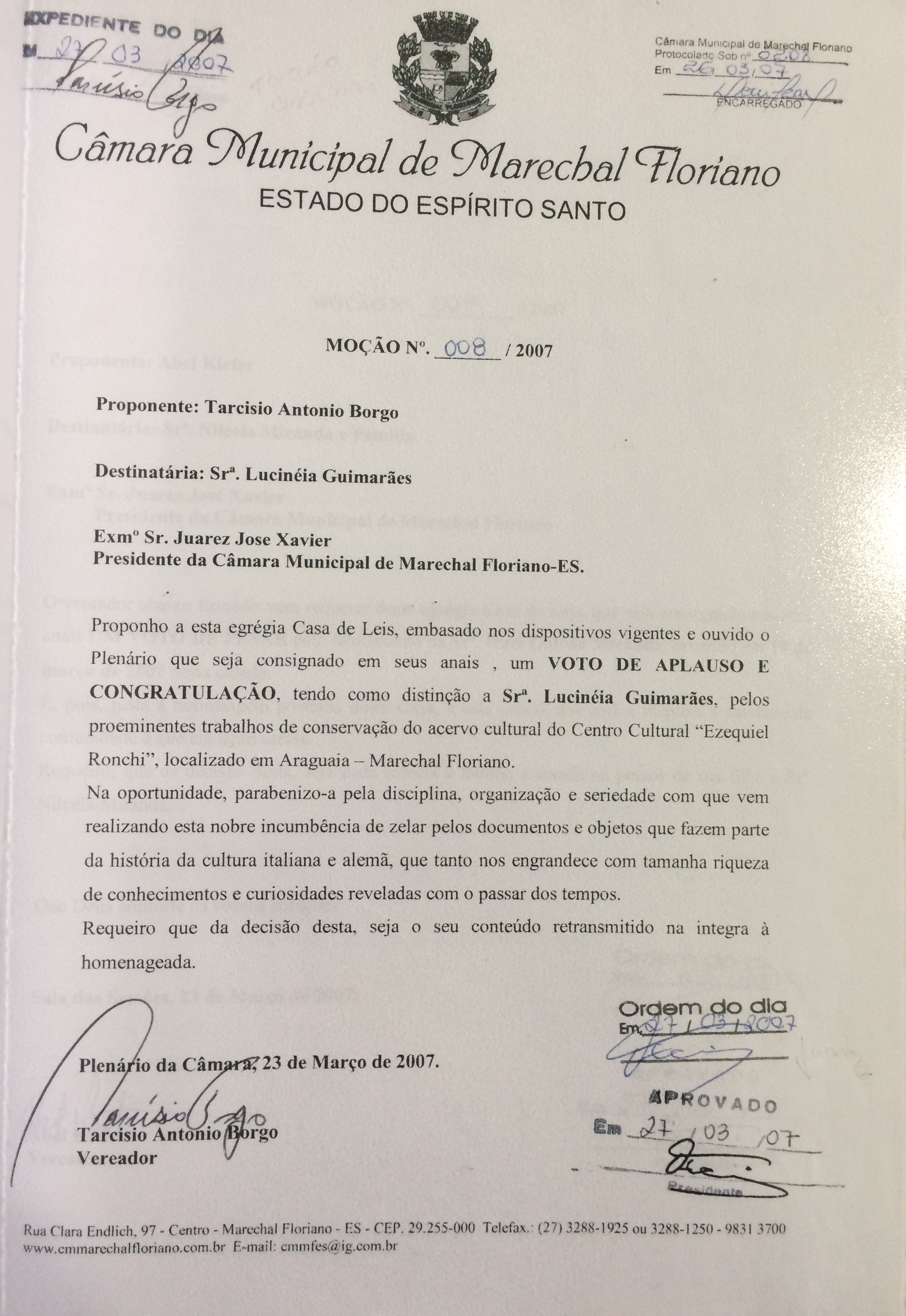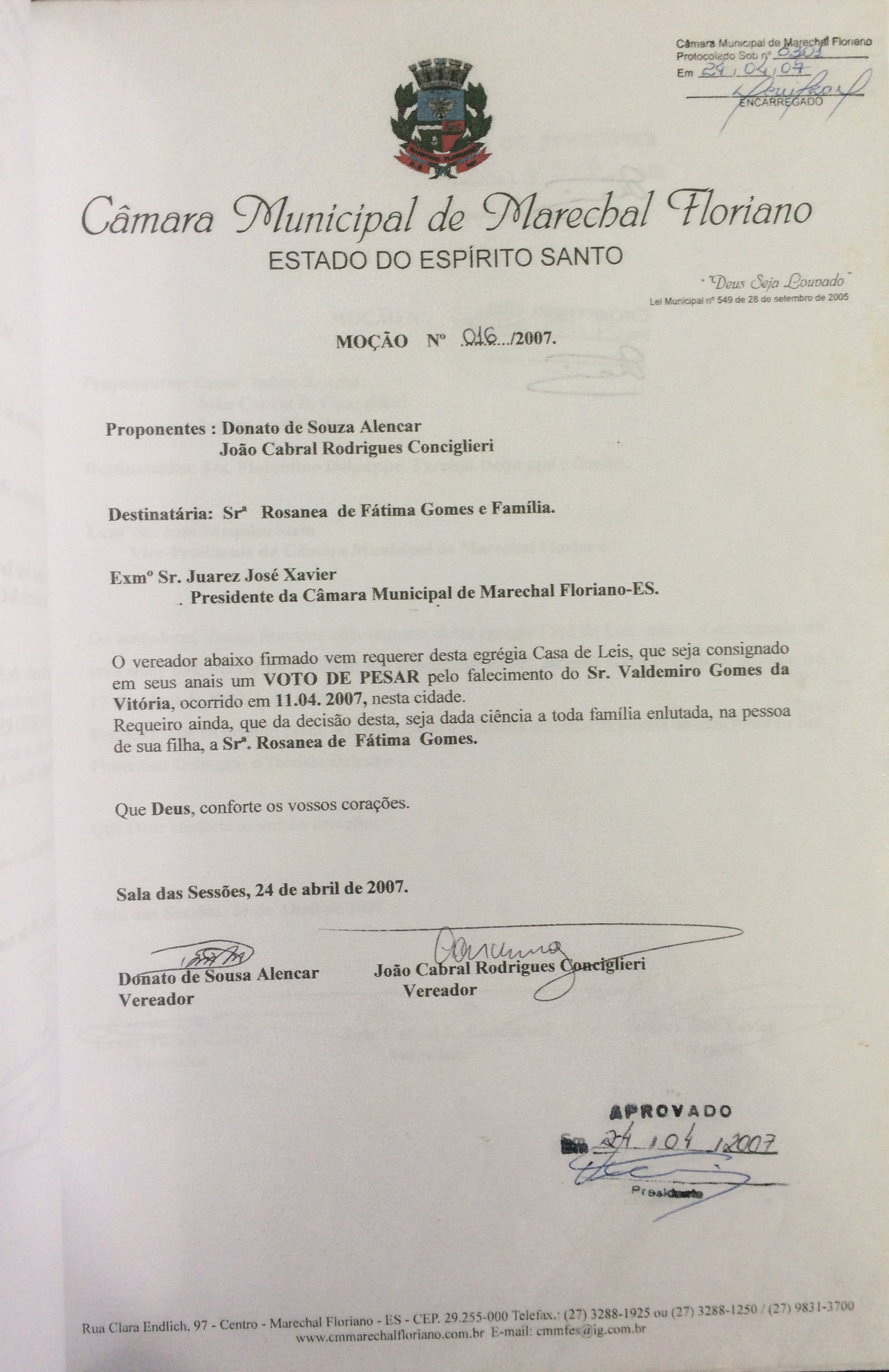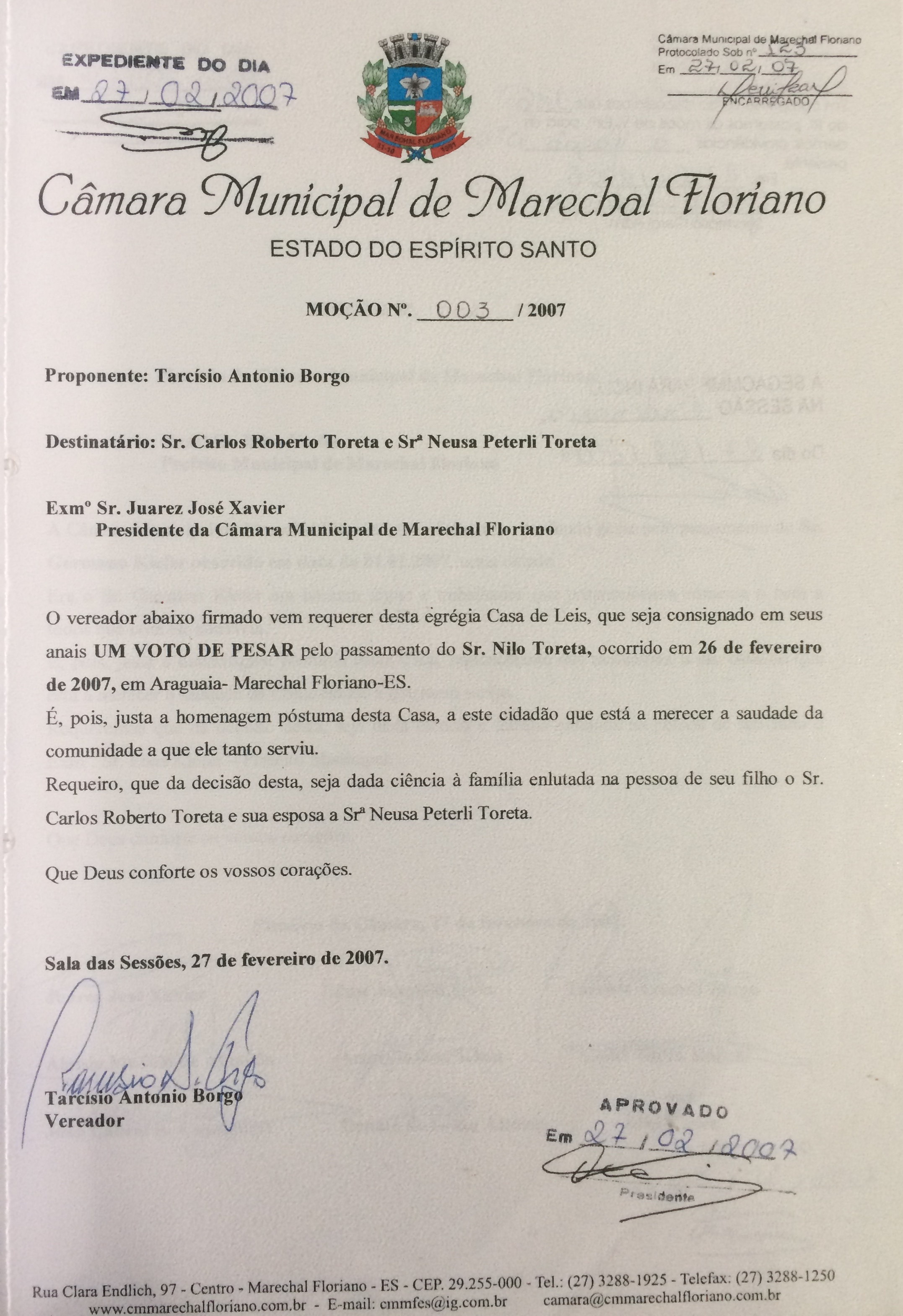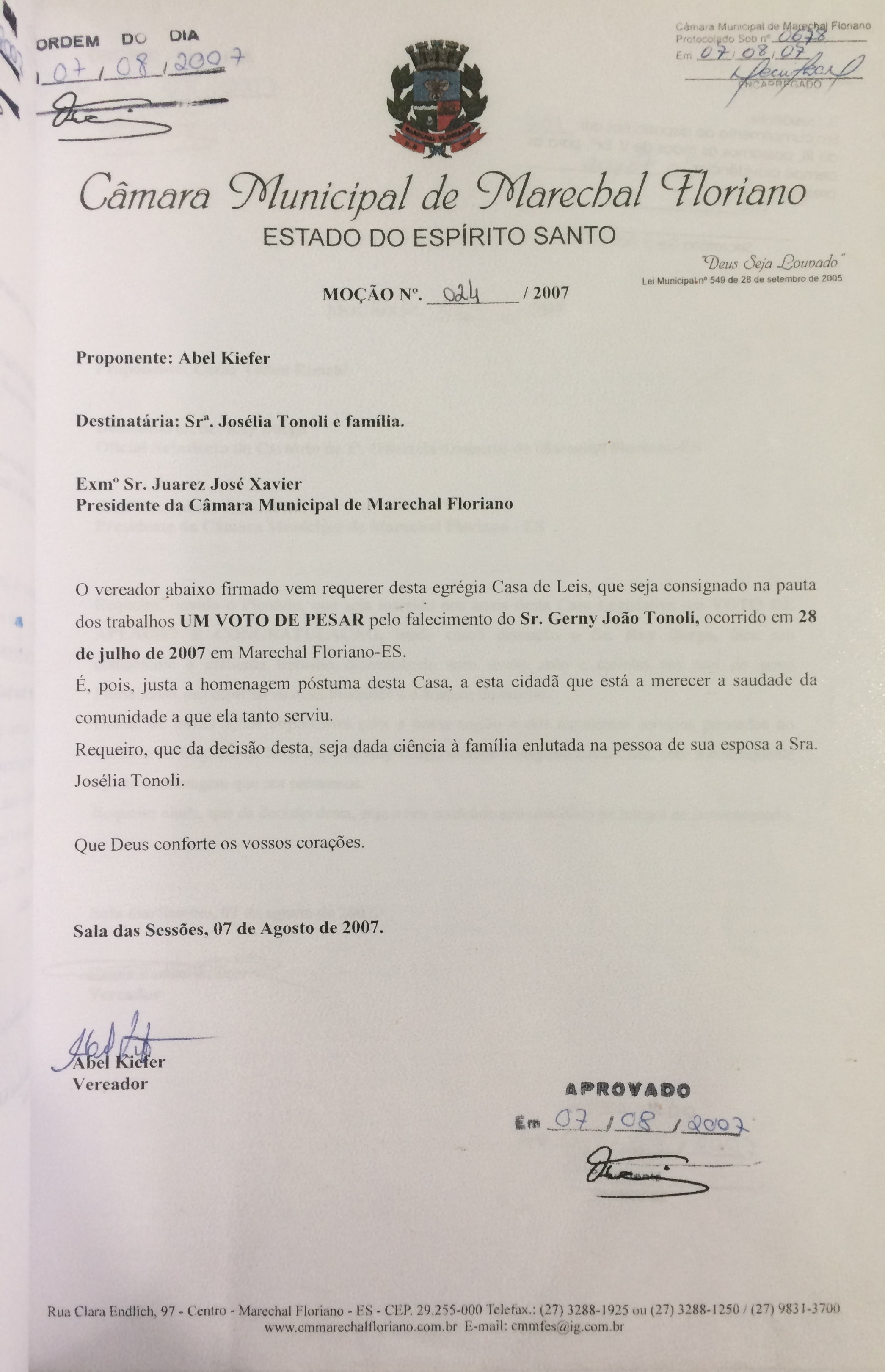 Ementa: MOÇÃO DE PESAR PELO FALECIMENTO DO SR. GERNY JOÃO TONOLI, OCORRIDO EM 28 DE JULHO DE 2007, EM MARECHAL FLORIANO - ES.