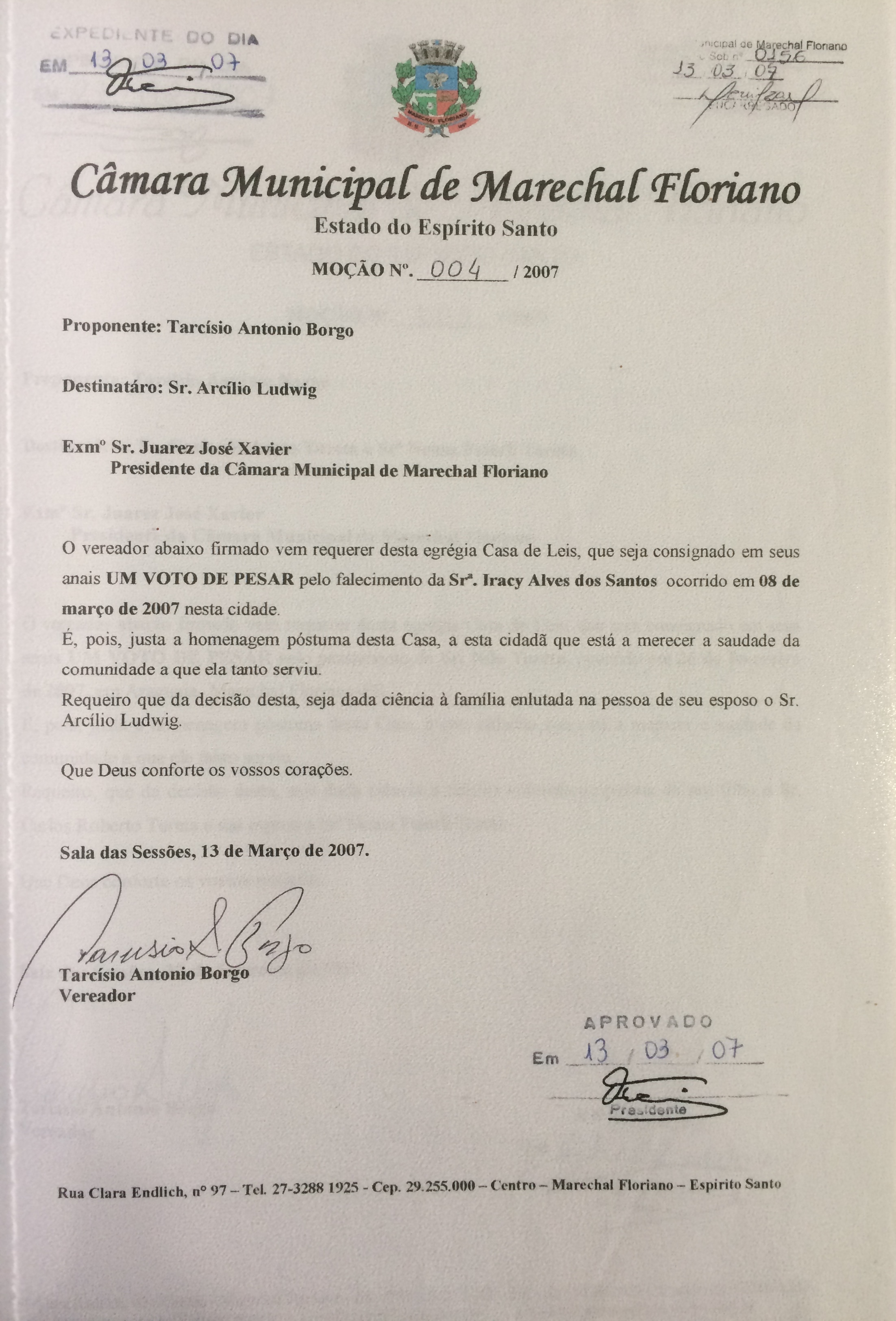 Ementa: MOÇÃO DE PESAR PELO FALECIMENTO DA SRª. IRACY ALVES DOS SANTOS, OCORRIDO EM 08 DE MARÇO DE 2007 NESTA CIDADE.