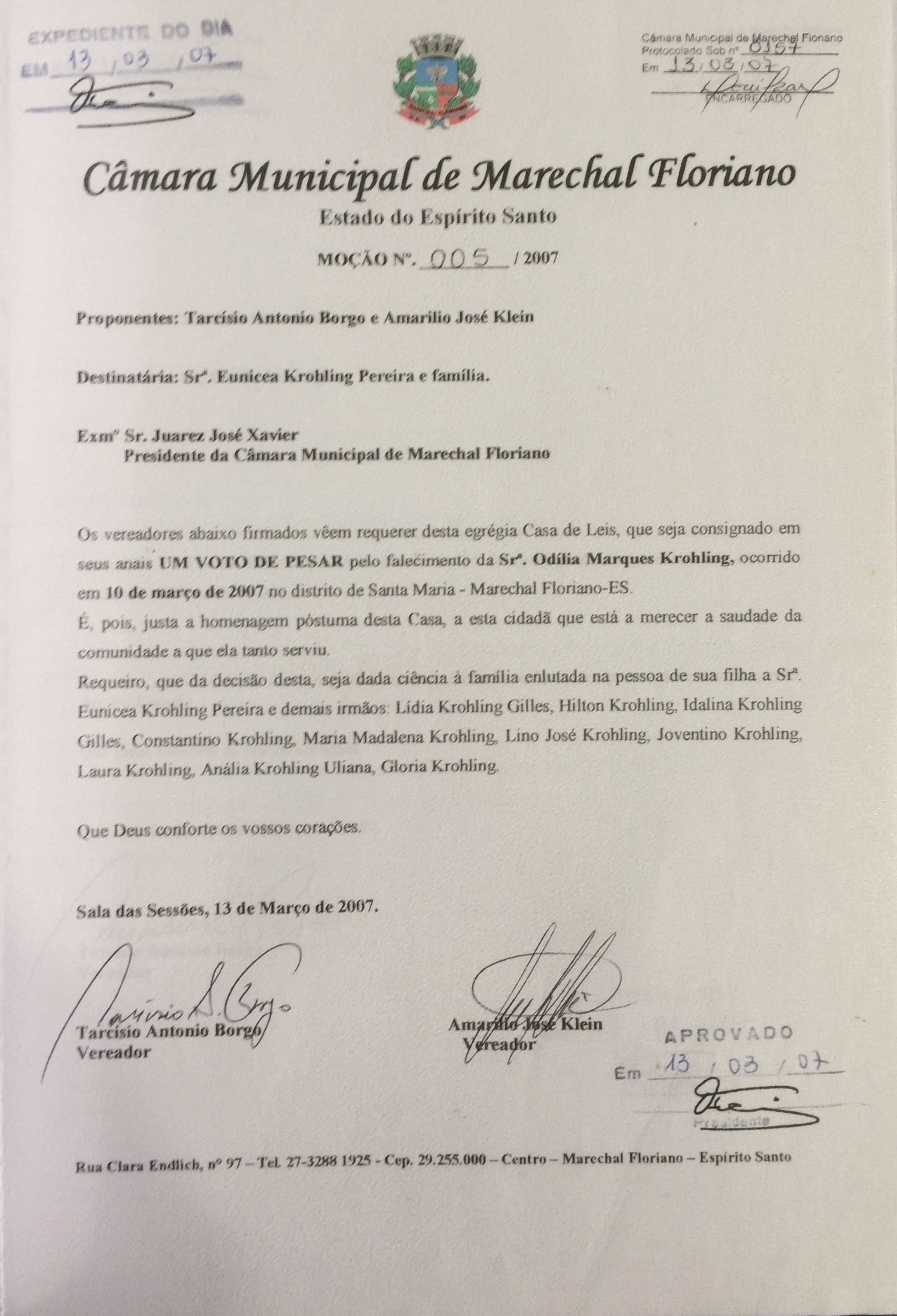 Ementa: MOÇÃO DE PESAR PELO FALECIMENTO DA SRª. ODÍLIA MARQUES KROHLING, OCORRIDO EM 10 DE MARÇO DE 2007.