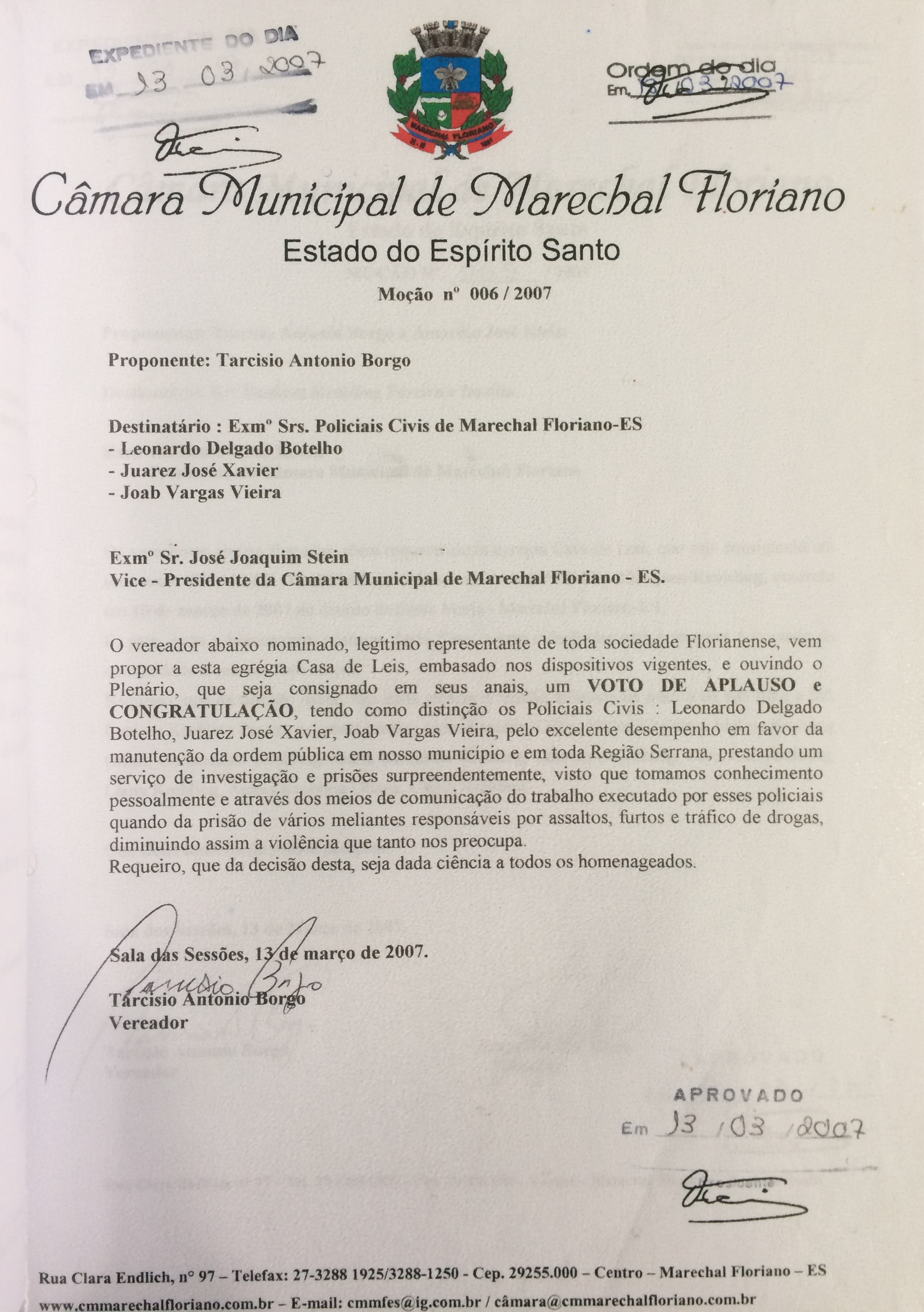 Ementa: MOÇÃO DE APLAUSO E CONGRATULAÇÃO, TENDO COMO DISTINÇÃO OS POLICIAIS CIVIS: LEONARDO DELGADO BOTELHO, JUAREZ JOSÉ XAVIER, JOAB VARGAS VIEIRA.