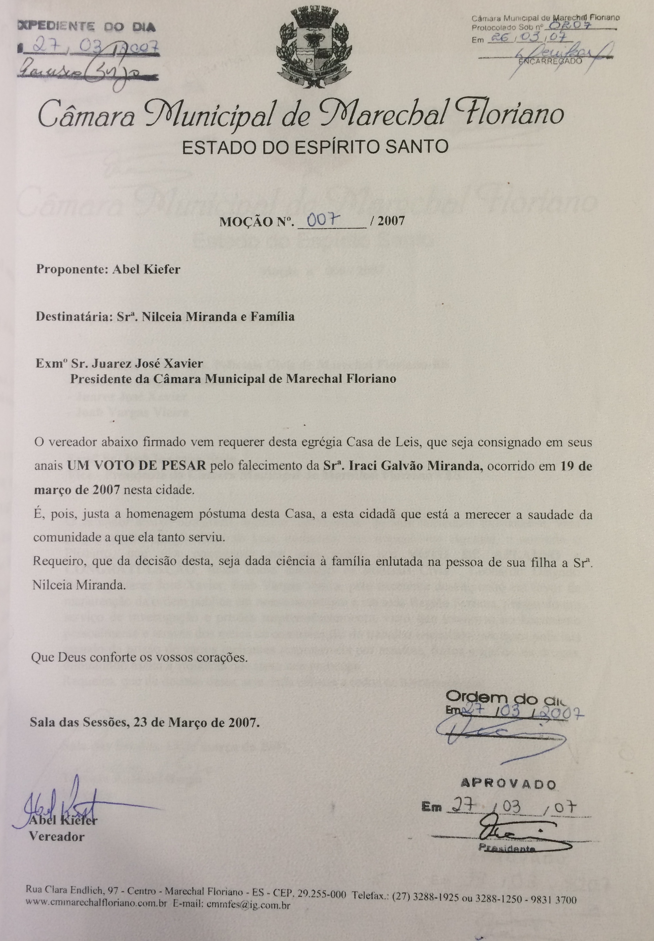 Ementa: MOÇÃO DE PESAR PELO FALECIMENTO DA SRª. IRACI GALVÃO MIRANDA, OCORRIDO EM 19 DE MARÇO DE 2007.