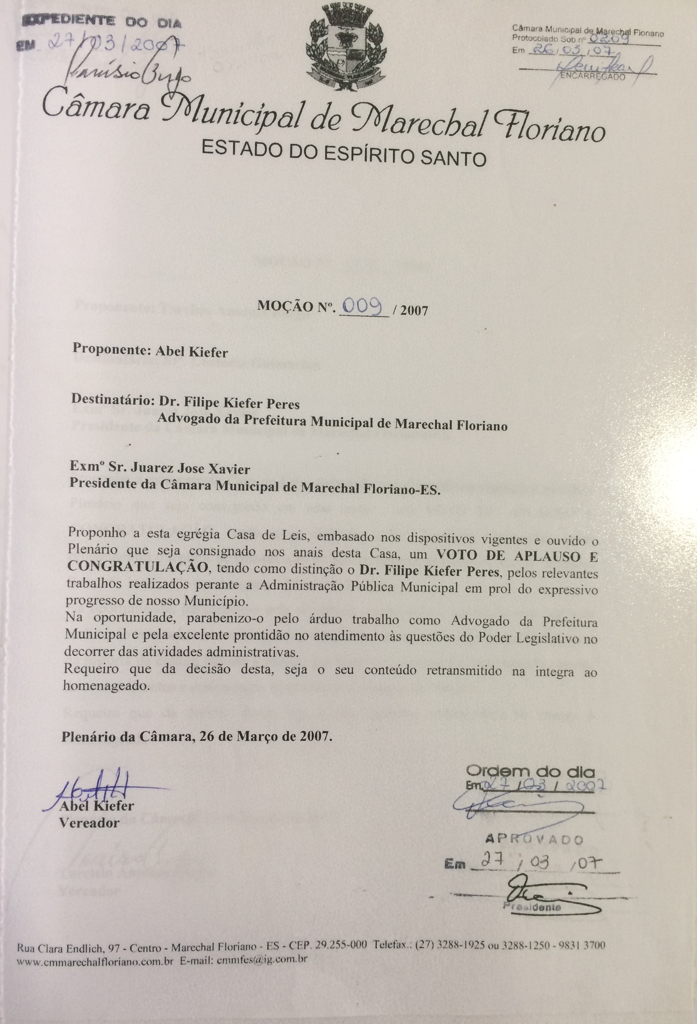 Ementa: MOÇÃO DE APLAUSO E CONGRATULAÇÃO, TENDO COMO DISTINÇÃO O DR. FILIPE KIEFER PERES.