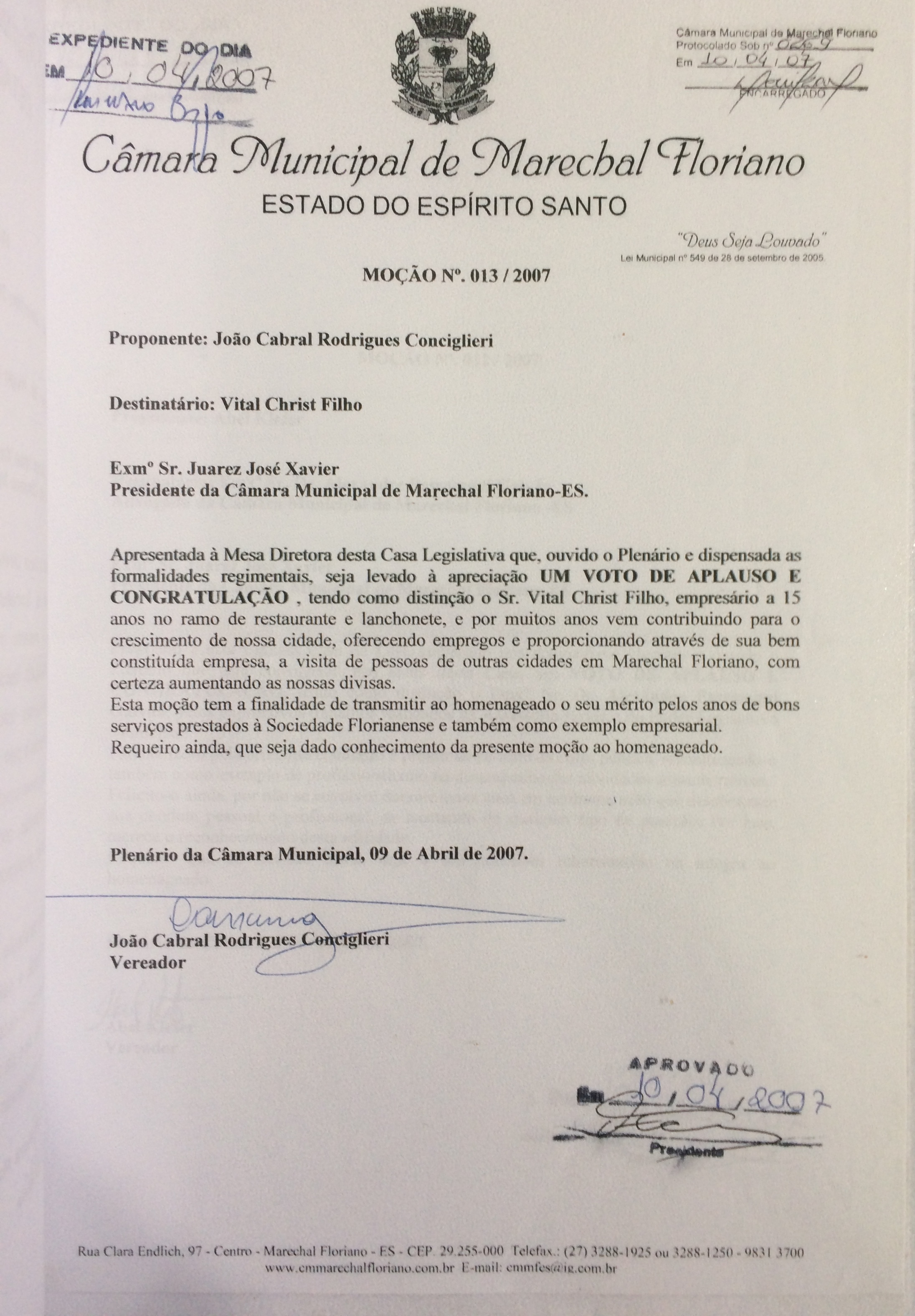 Ementa: MOÇÃO DE APLAUSO E CONGRATULAÇÃO, TENDO COMO DISTINÇÃO O SR. VITAL CHRIST FILHO, EMPRESÁRIO A 15 ANOS NO RAMO DE RESTAURANTE E LANCHONETE.