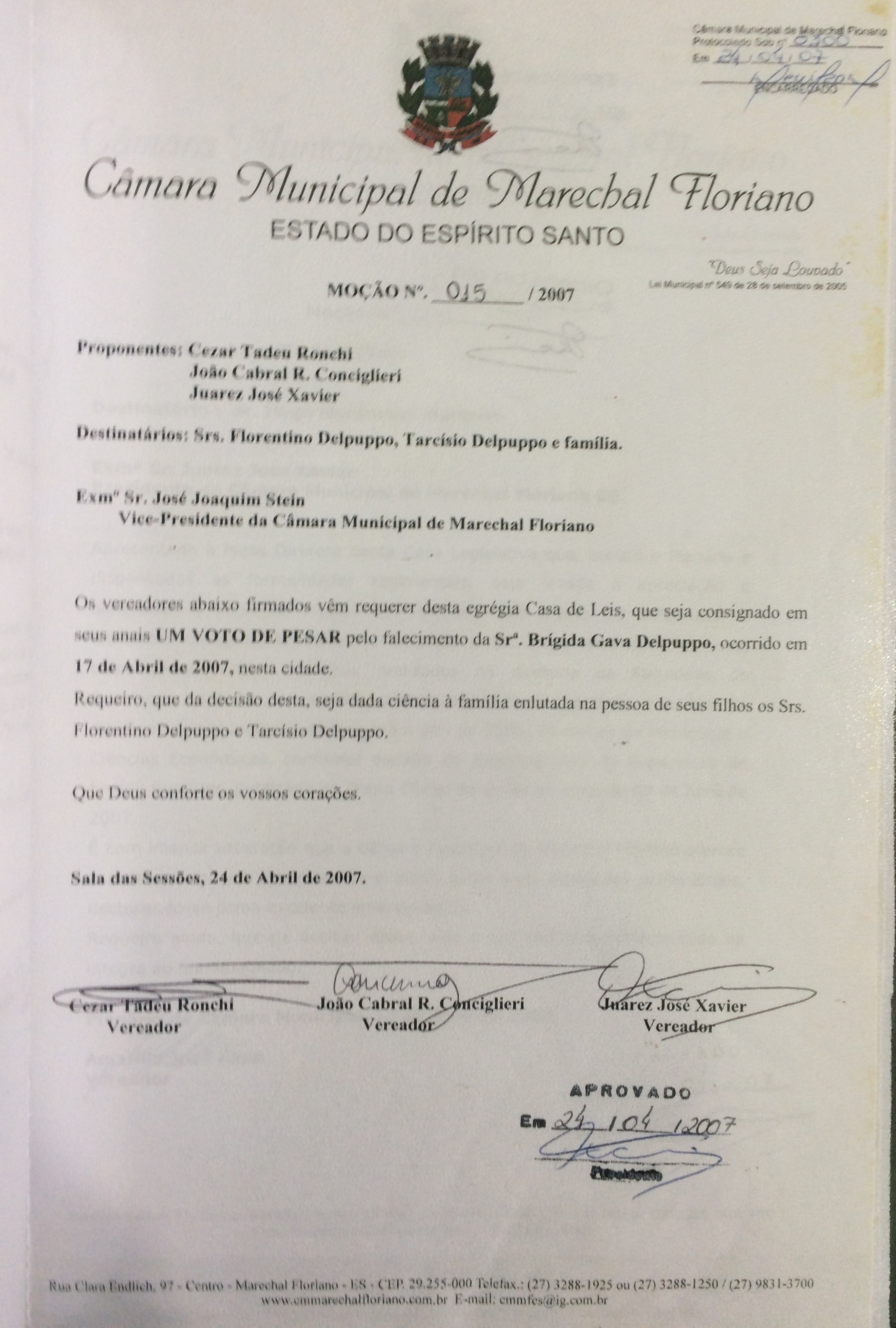 Ementa: MOÇÃO DE PESAR PELO FALECIMENTO DA SRª. BRÍGIDA GAVA DELPUPPO, OCORRIDO EM 17 DE ABRIL DE 2007, NESTA CIDADE.