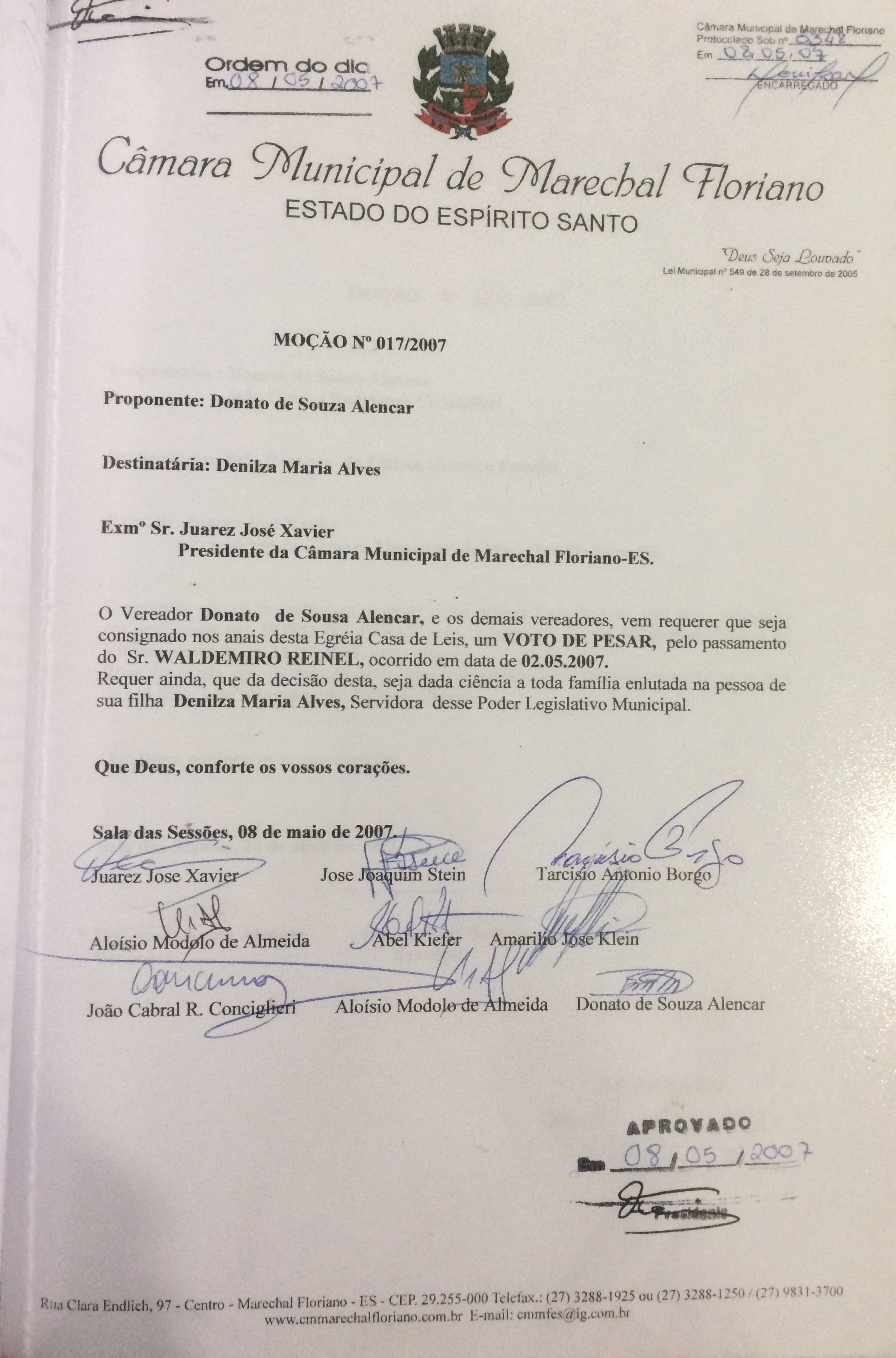 Ementa: MOÇÃO DE PESAR, PELO PASSAMENTO DO SR. WALDEMIRO REINEL, OCORRIDO EM DATA DE 02/05/2007.