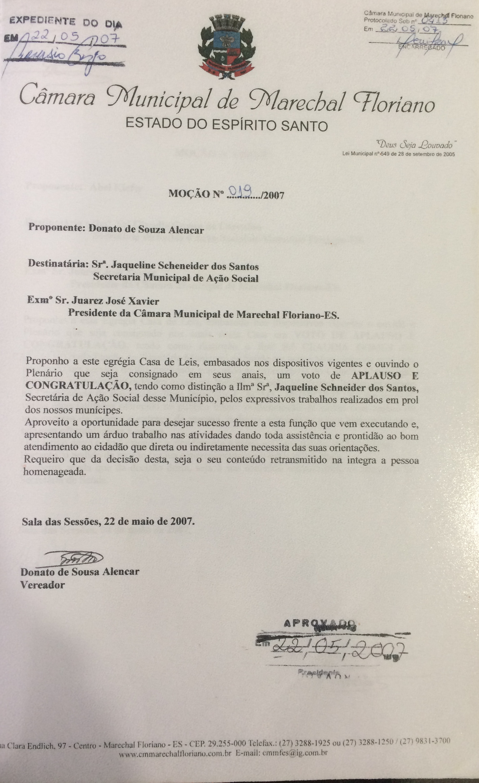 Ementa: MOÇÃO DE APLAUSO E CONGRATULAÇÃO, TENDO COMO DISTINÇÃO A ILMª SRª JAQUELINE SCHNEIDER DOS SANTOS.