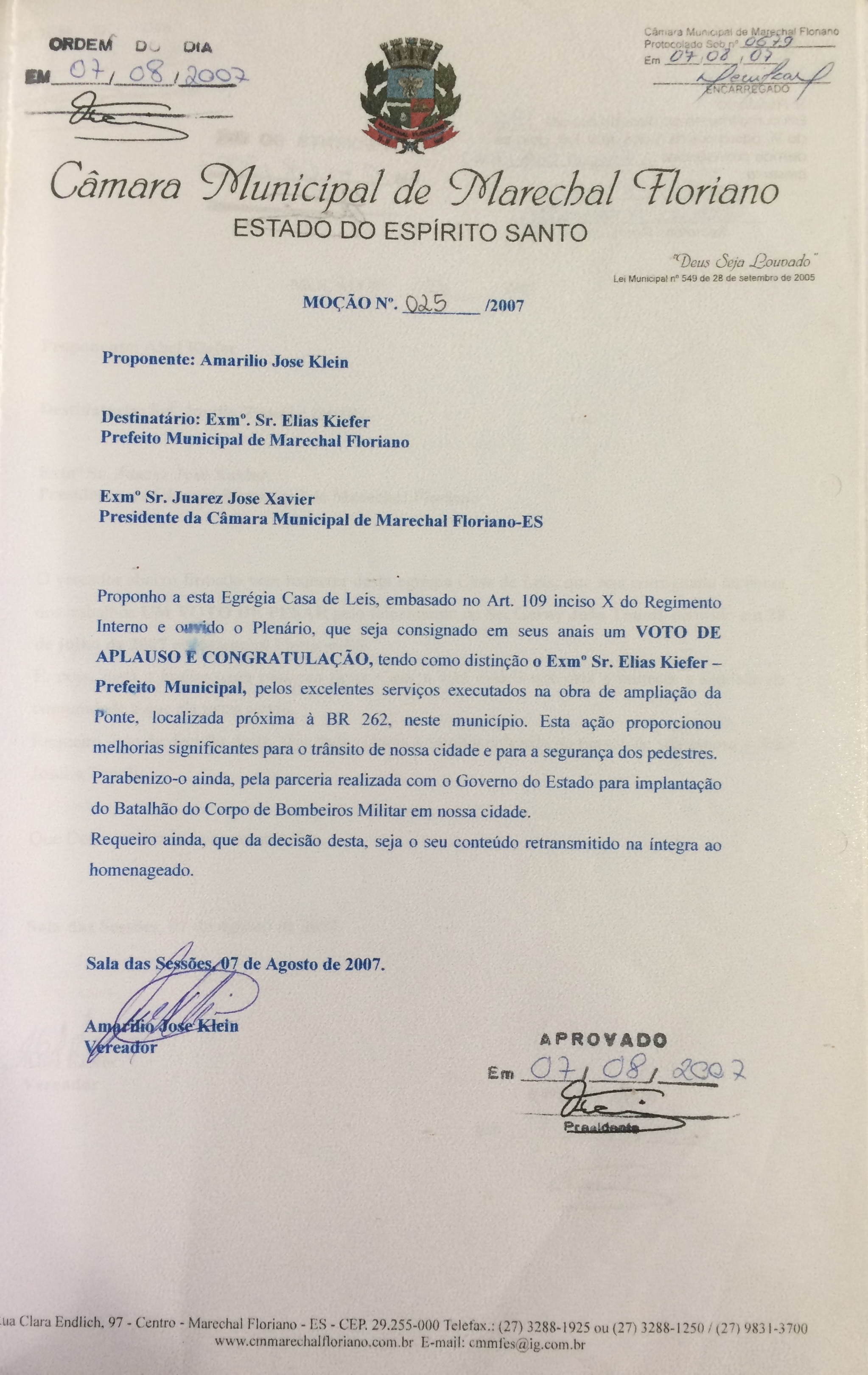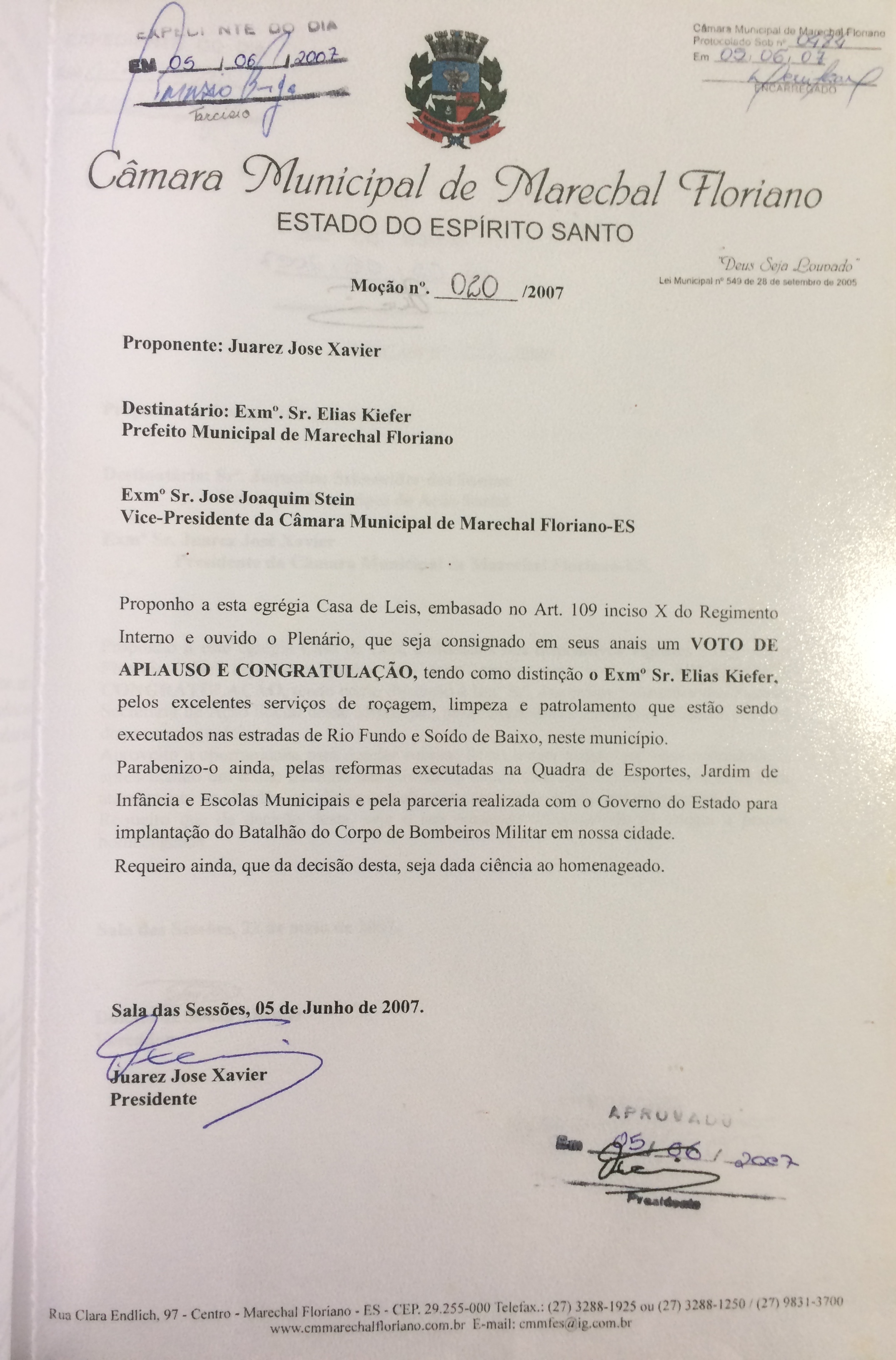 Ementa: MOÇÃO DE APLAUSO E CONGRATULAÇÃO, TENDO COMO DISTINÇÃO O EXMº SR. ELIAS KIEFER - PREFEITO MUNICIPAL.