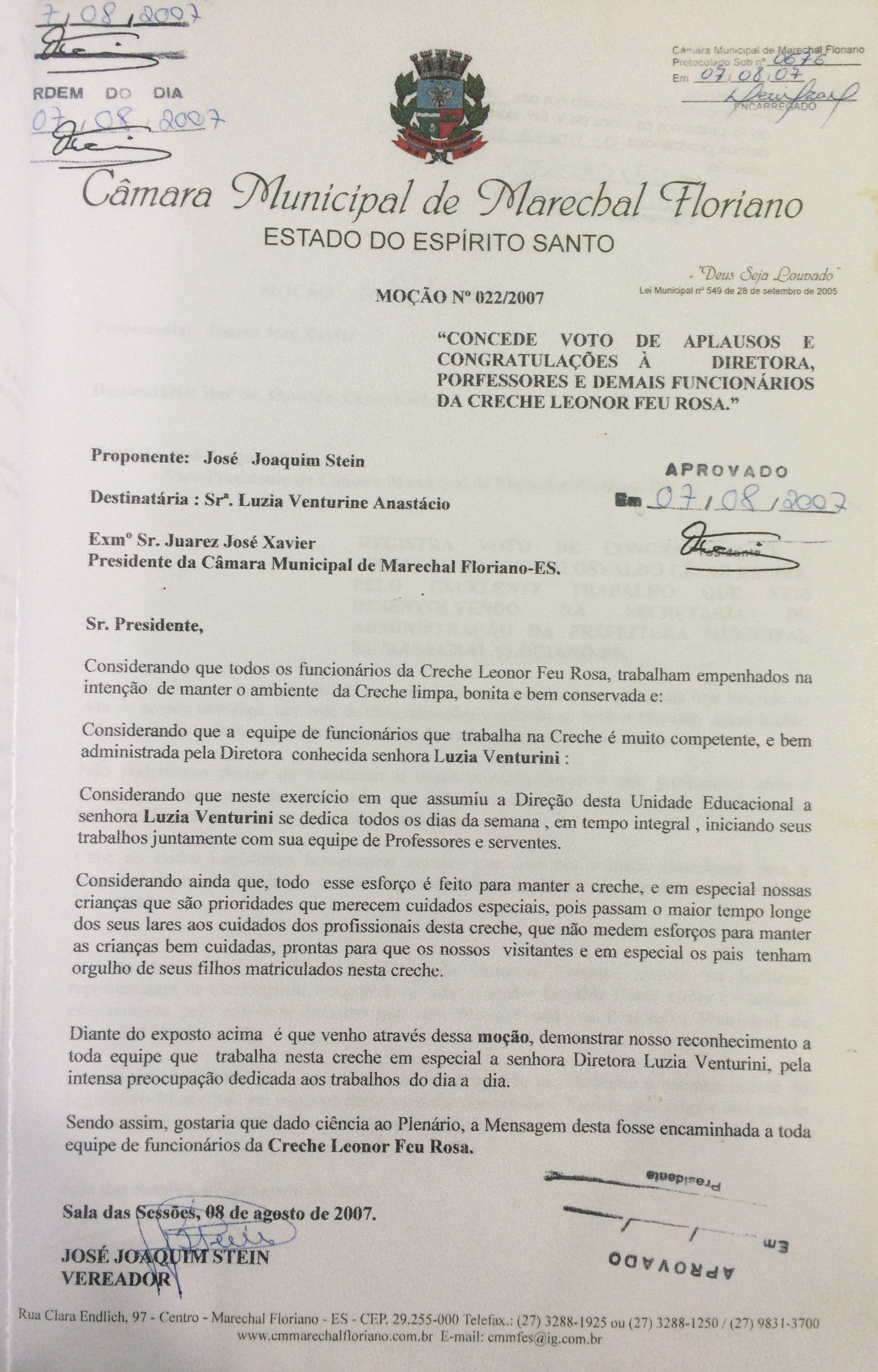 Ementa: MOÇÃO DE APLAUSO E CONGRATULAÇÃO À DIRETORA, PROFESSORES E DEMAIS FUNCIONÁRIOS DA CRECHE LEONOR FEU ROSA.