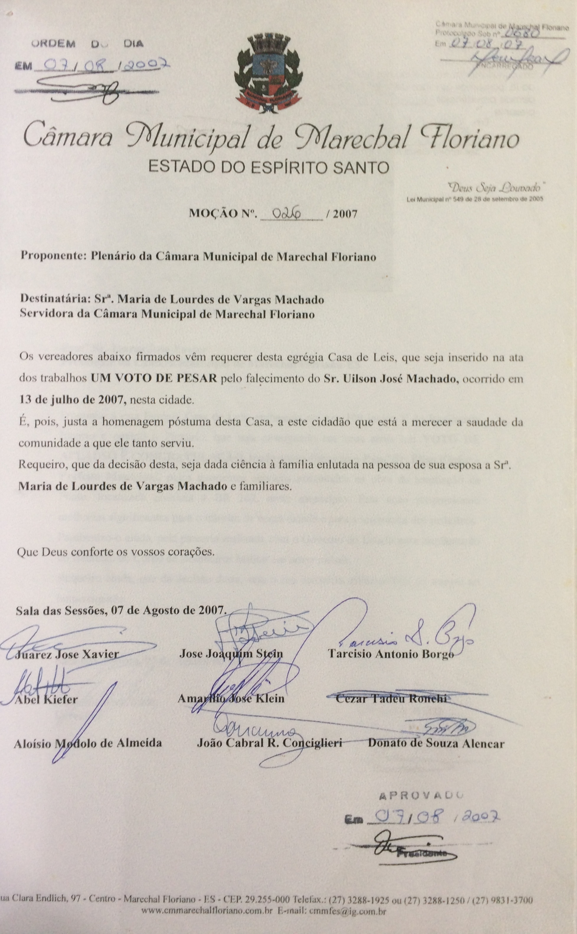 Ementa: MOÇÃO DE PESAR PELO FALECIMENTO DO SR. UILSON JOSÉ MACHADO, OCORRIDO EM 13 DE JULHO DE 2007.