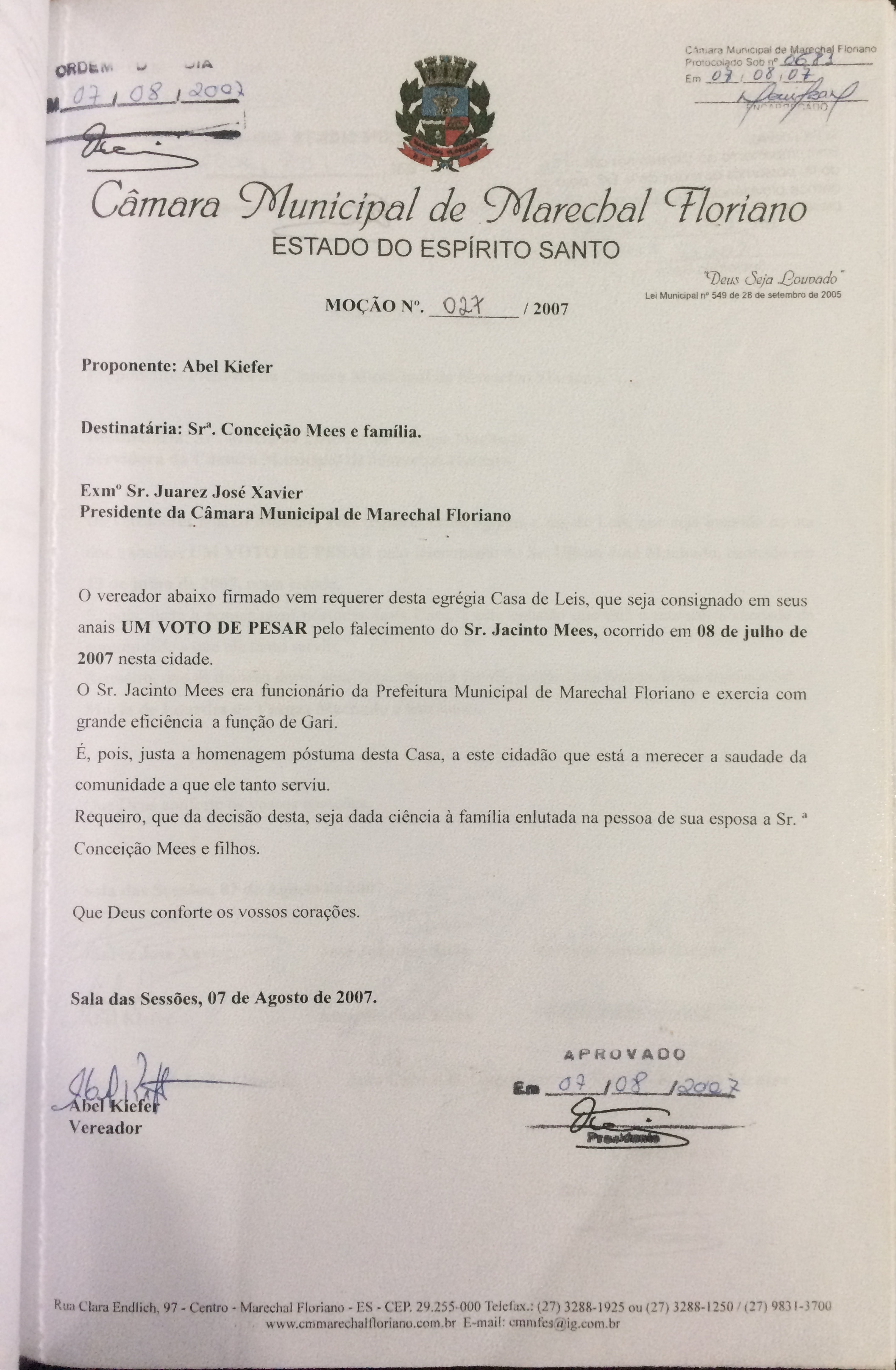 Ementa: MOÇÃO DE PESAR PELO FALECIMENTO DO SR. JACINTO MEES, OCORRIDO EM 08 DE JULHO DE 2007, NESTA CIDADE.