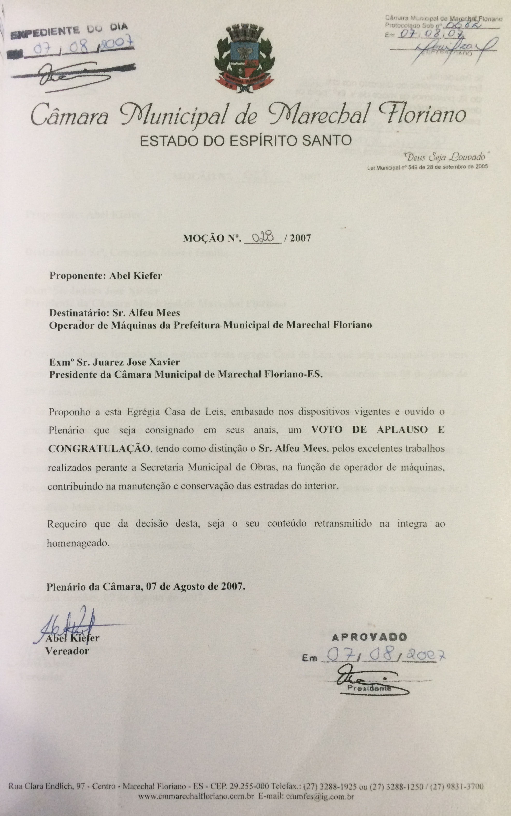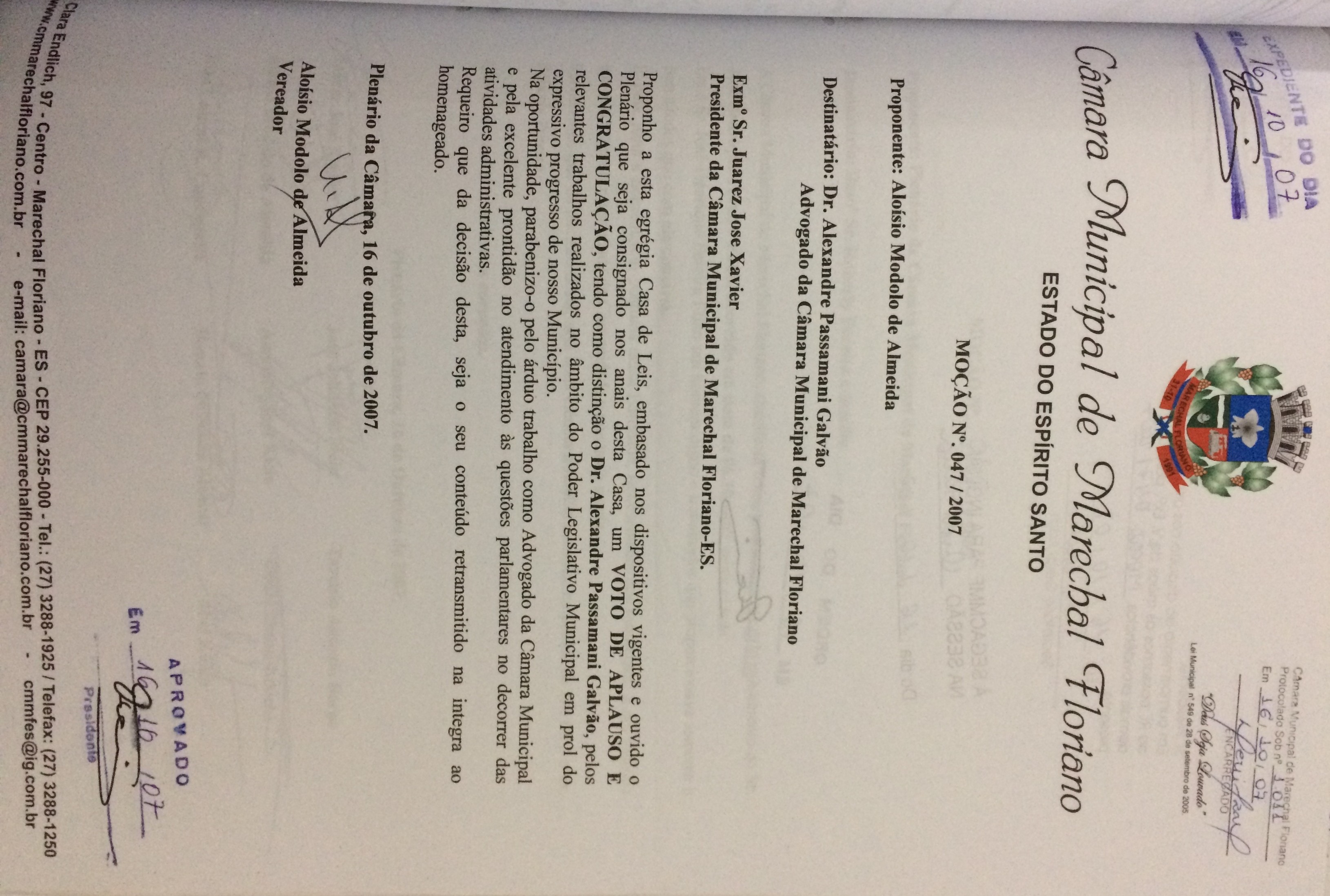 Ementa: MOÇÃO DE APLAUSO E RECONHECIMENTO, TENDO COMO DISTINÇÃO OS NOBRES VEREADORES E TODOS OS SERVIDORES DA CÂMARA MUNICIPAL DE MARECHAL FLORIANO-ES.